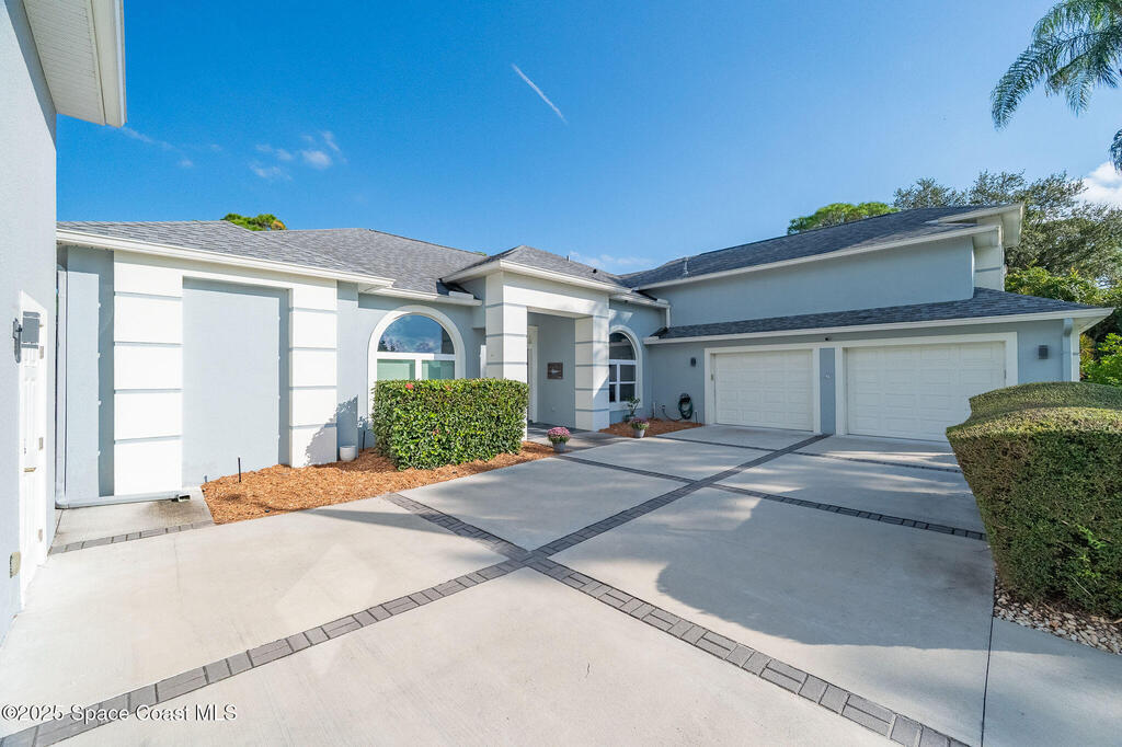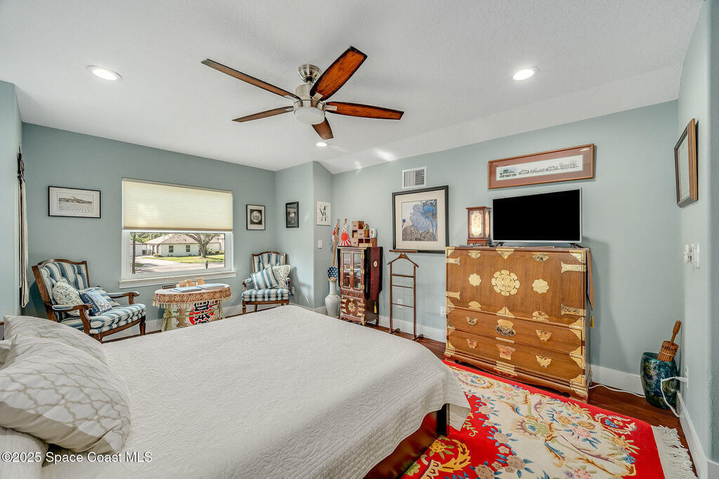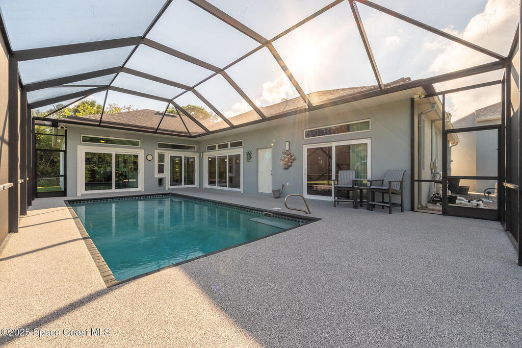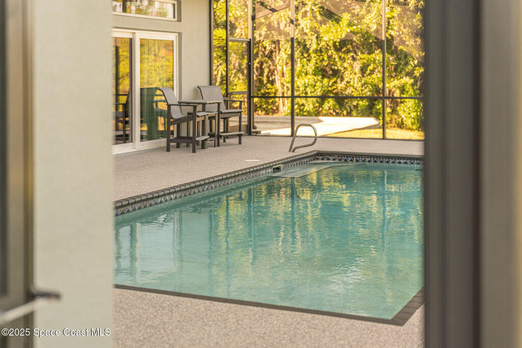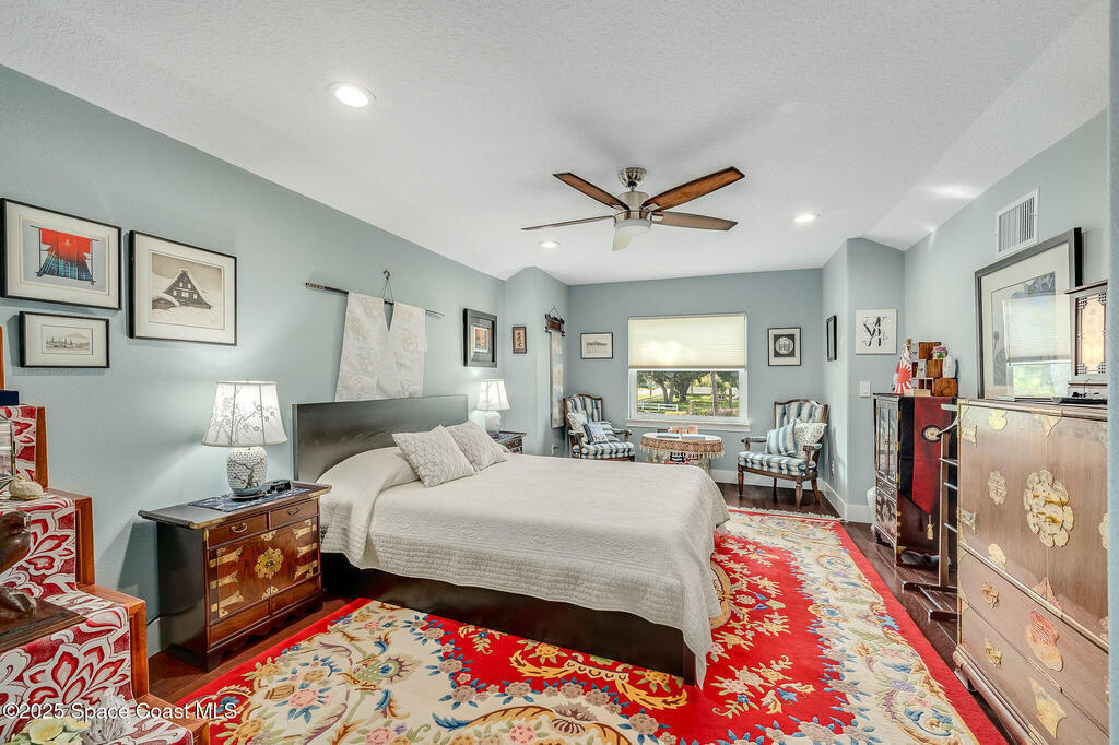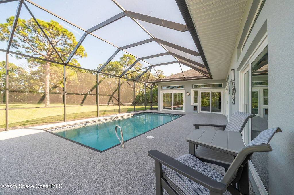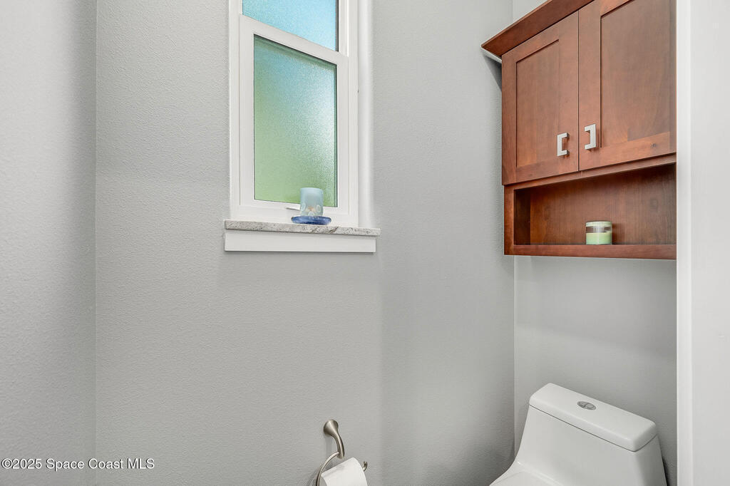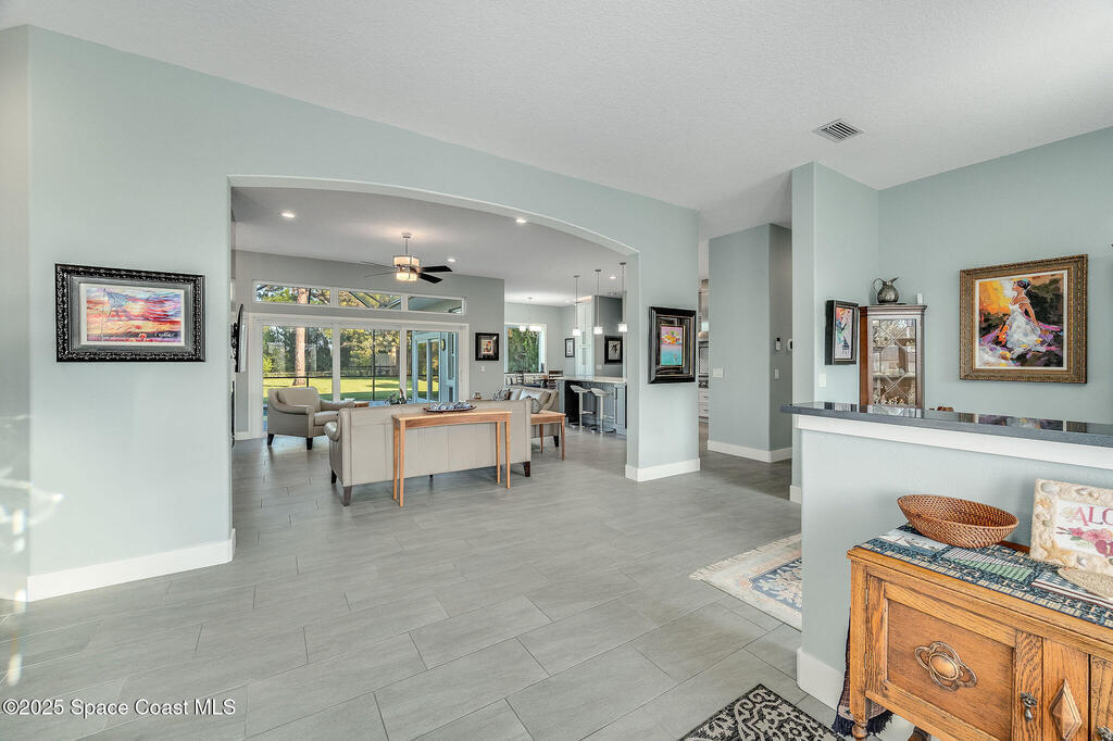 Discover refined lakefront living on 1.28 acres in The Trails, one of North Merritt Island's most sought-after communities. This 5-bedroom, 3.5-bath residence was fully remodeled in 2017 and offers luxury finishes, modern systems, and exceptional craftsmanship throughout. The interior showcases porcelain tile flooring in main areas, hardwood upstairs, and a chef's kitchen with StarMark soft-close cabinetry, glass-front uppers, under-cabinet lighting, and a full suite of Thermador appliances including double wall ovens, six-burner gas range, and dishwasher, plus a stainless French-door refrigerator and Sharp microwave drawer. Spa-inspired bathrooms feature frameless zero-threshold showers and granite or quartz counters. Additional highlights include a custom office with built-ins, an enclosed Florida room with mini-split A/C, Ecobee Smart Thermostat, tankless propane water heater, and newer Trane HVAC. The property features a 2-car attached garage and a 2022 constructed 2-bay RV