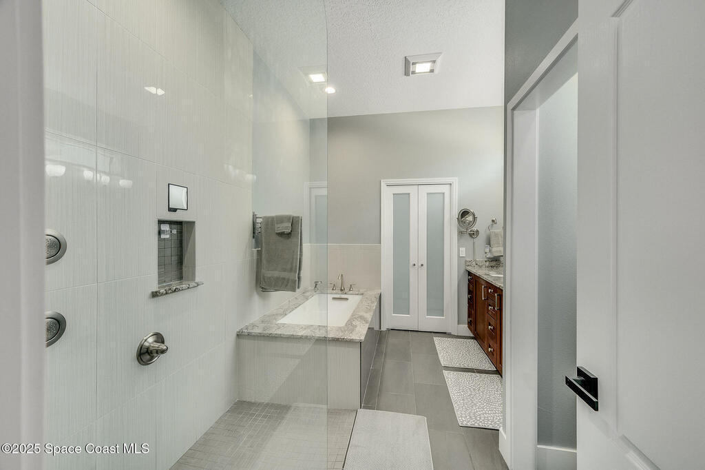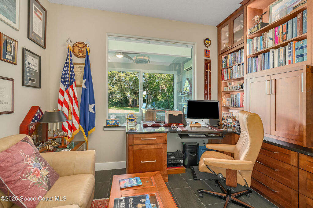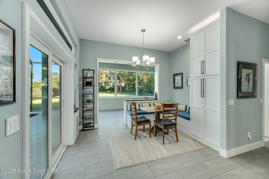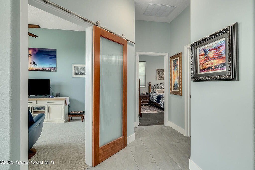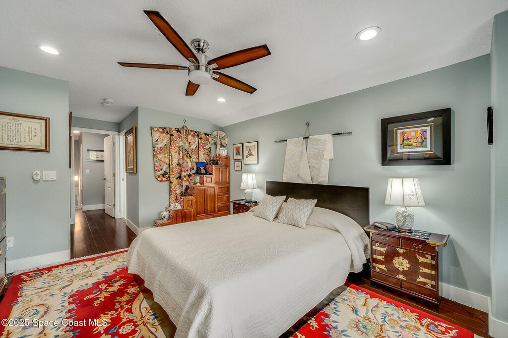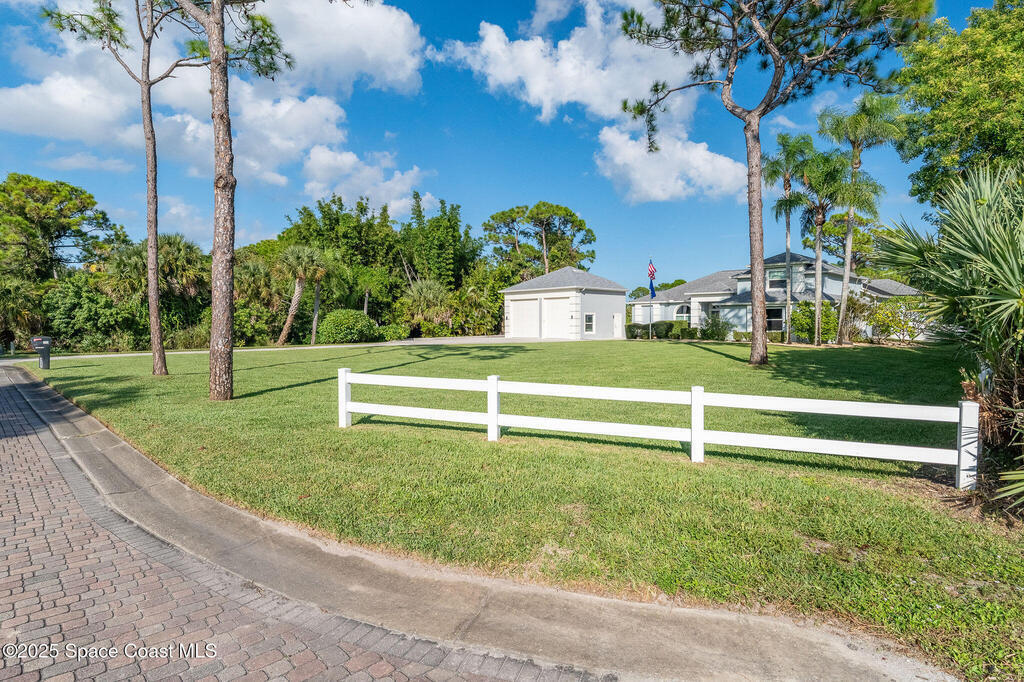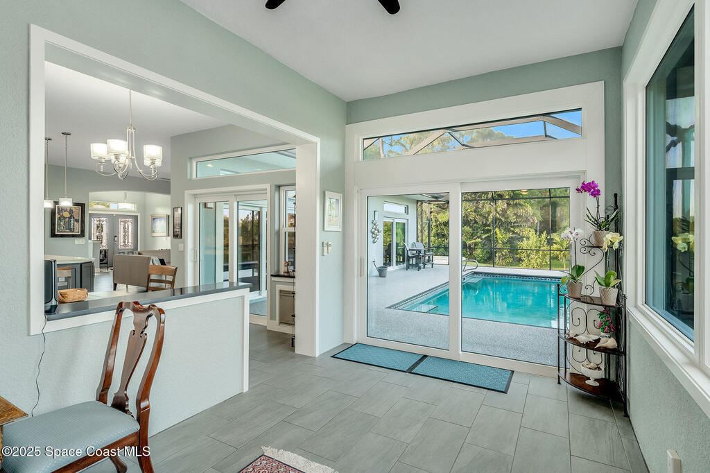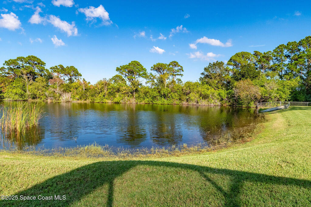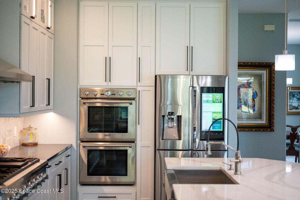 Discover refined lakefront living on 1.28 acres in The Trails, one of North Merritt Island's most sought-after communities. This 5-bedroom, 3.5-bath residence was fully remodeled in 2017 and offers luxury finishes, modern systems, and exceptional craftsmanship throughout. The interior showcases porcelain tile flooring in main areas, hardwood upstairs, and a chef's kitchen with StarMark soft-close cabinetry, glass-front uppers, under-cabinet lighting, and a full suite of Thermador appliances including double wall ovens, six-burner gas range, and dishwasher, plus a stainless French-door refrigerator and Sharp microwave drawer. Spa-inspired bathrooms feature frameless zero-threshold showers and granite or quartz counters. Additional highlights include a custom office with built-ins, an enclosed Florida room with mini-split A/C, Ecobee Smart Thermostat, tankless propane water heater, and newer Trane HVAC. The property features a 2-car attached garage and a 2022 constructed 2-bay RV