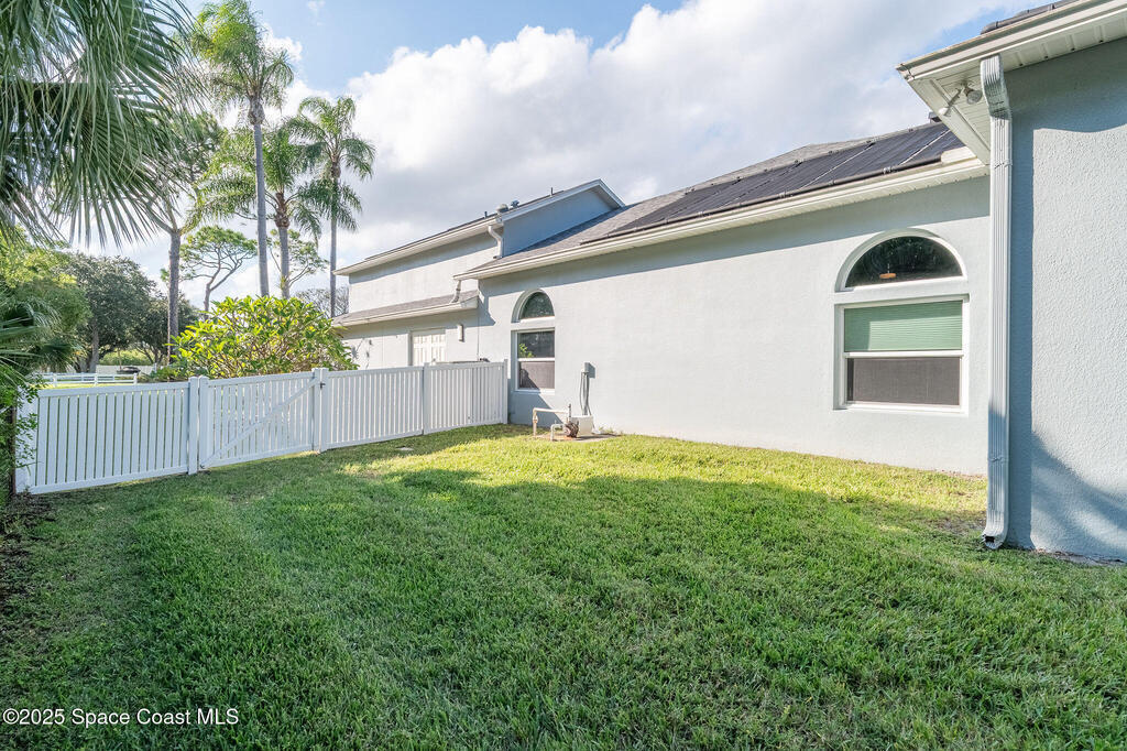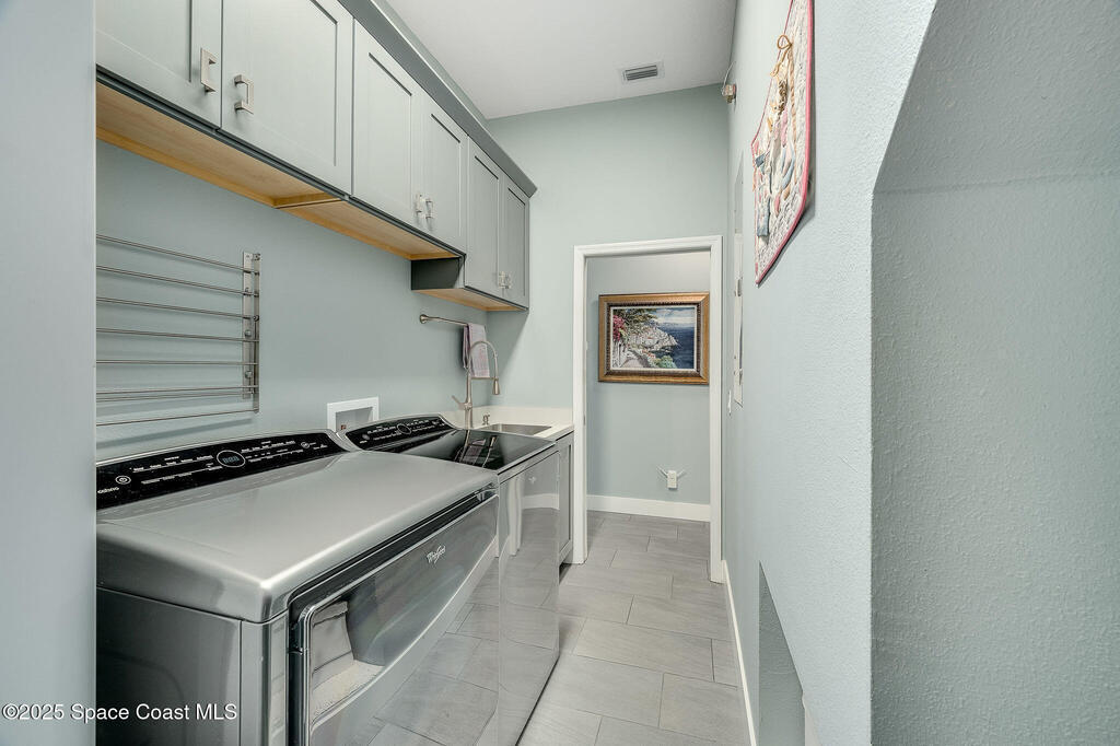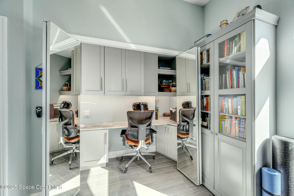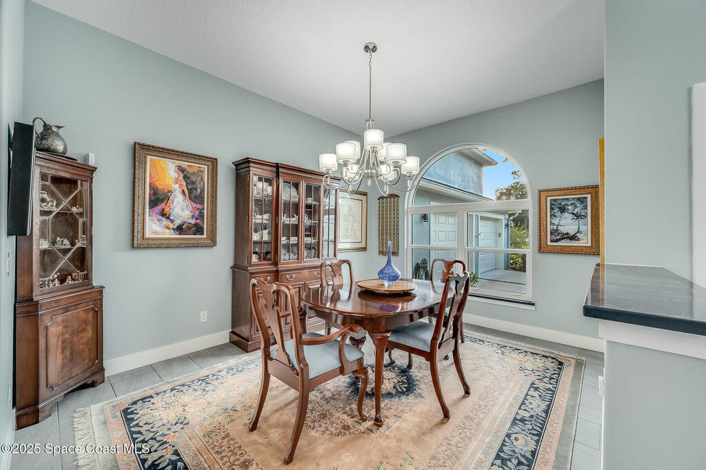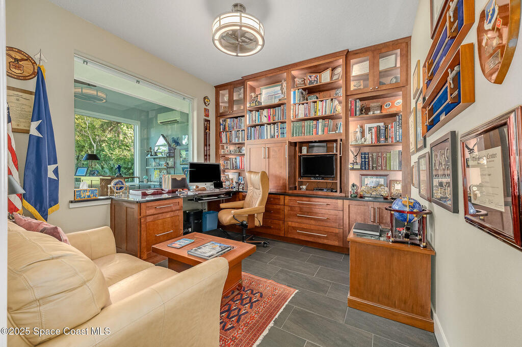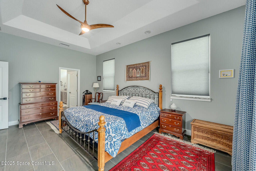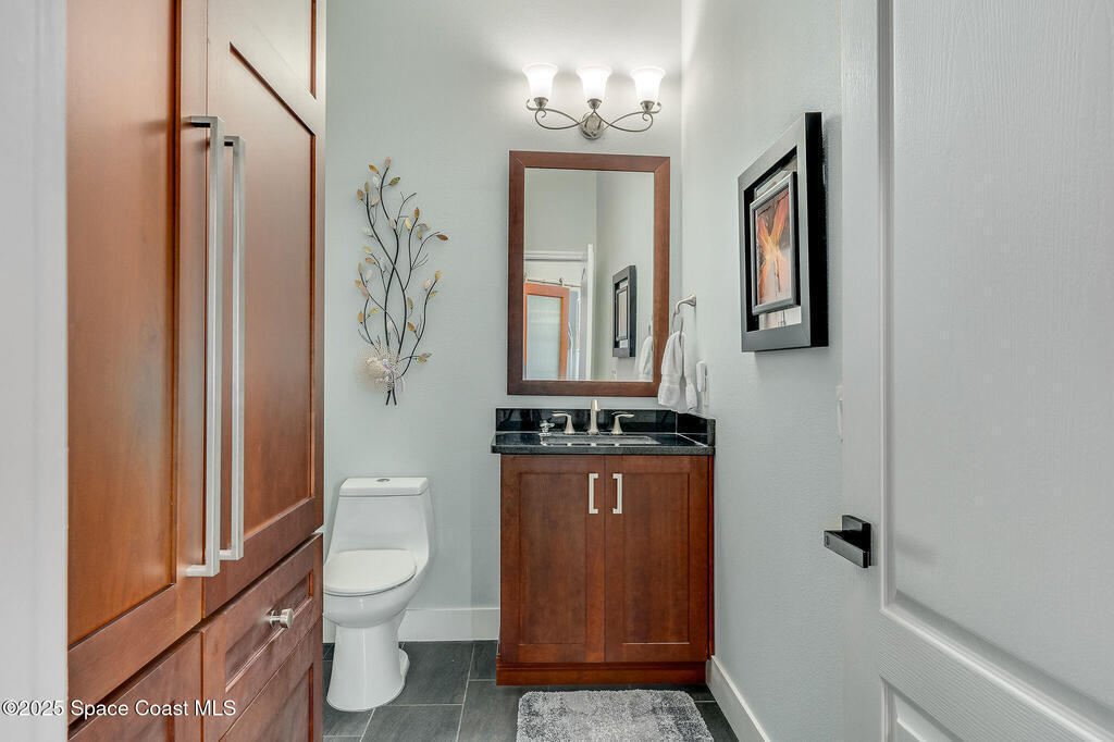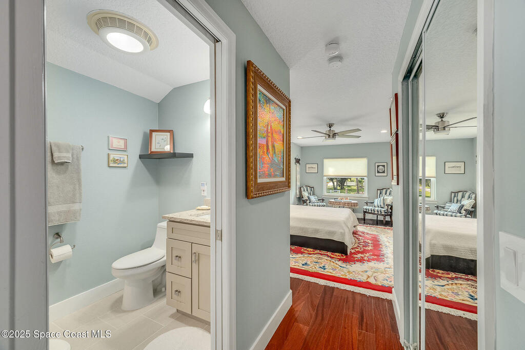Discover refined lakefront living on 1.28 acres in The Trails, one of North Merritt Island's most sought-after communities. This 5-bedroom, 3.5-bath residence was fully remodeled in 2017 and offers luxury finishes, modern systems, and exceptional craftsmanship throughout. The interior showcases porcelain tile flooring in main areas, hardwood upstairs, and a chef's kitchen with StarMark soft-close cabinetry, glass-front uppers, under-cabinet lighting, and a full suite of Thermador appliances including double wall ovens, six-burner gas range, and dishwasher, plus a stainless French-door refrigerator and Sharp microwave drawer. Spa-inspired bathrooms feature frameless zero-threshold showers and granite or quartz counters. Additional highlights include a custom office with built-ins, an enclosed Florida room with mini-split A/C, Ecobee Smart Thermostat, tankless propane water heater, and newer Trane HVAC. The property features a 2-car attached garage and a 2022 constructed 2-bay RV