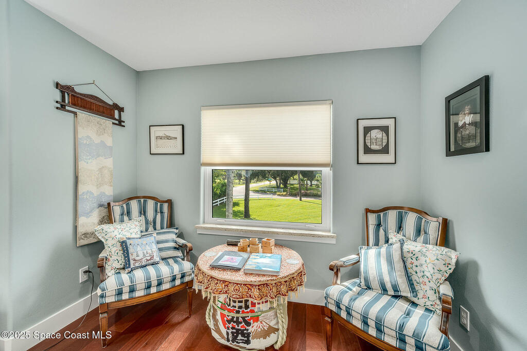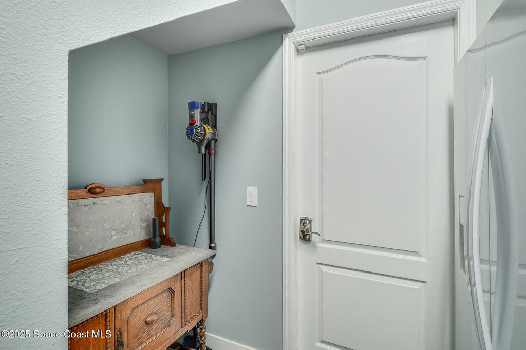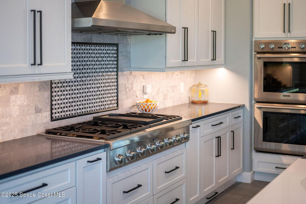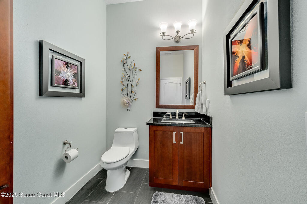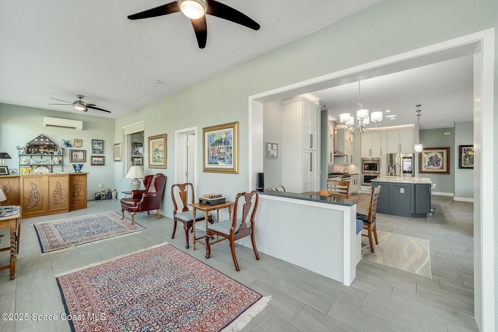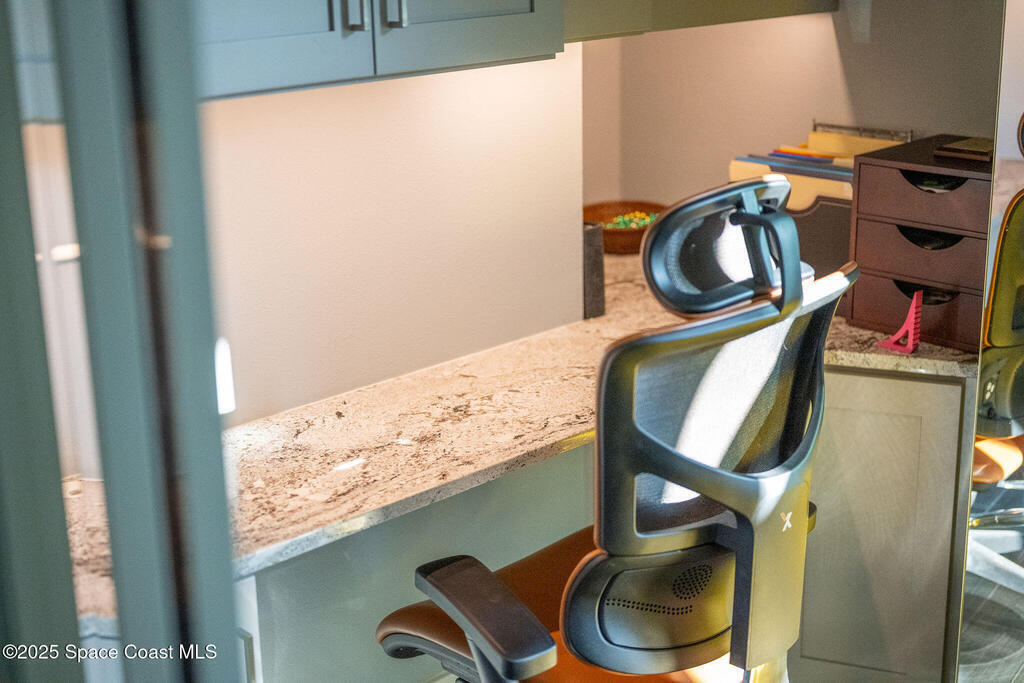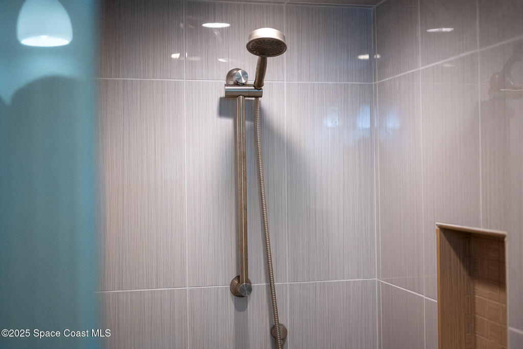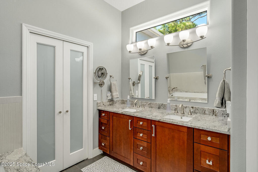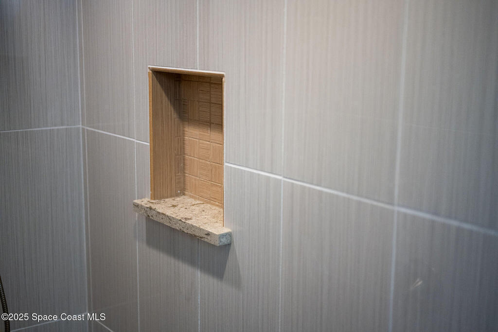 Discover refined lakefront living on 1.28 acres in The Trails, one of North Merritt Island's most sought-after communities. This 5-bedroom, 3.5-bath residence was fully remodeled in 2017 and offers luxury finishes, modern systems, and exceptional craftsmanship throughout. The interior showcases porcelain tile flooring in main areas, hardwood upstairs, and a chef's kitchen with StarMark soft-close cabinetry, glass-front uppers, under-cabinet lighting, and a full suite of Thermador appliances including double wall ovens, six-burner gas range, and dishwasher, plus a stainless French-door refrigerator and Sharp microwave drawer. Spa-inspired bathrooms feature frameless zero-threshold showers and granite or quartz counters. Additional highlights include a custom office with built-ins, an enclosed Florida room with mini-split A/C, Ecobee Smart Thermostat, tankless propane water heater, and newer Trane HVAC. The property features a 2-car attached garage and a 2022 constructed 2-bay RV