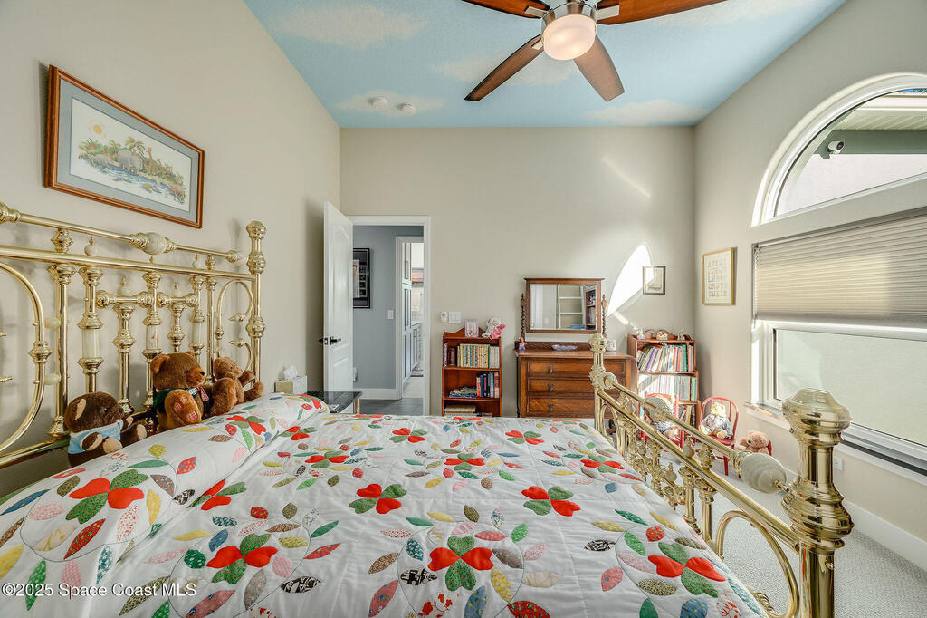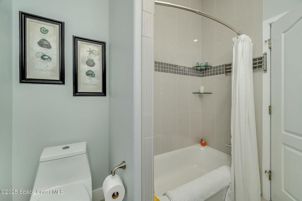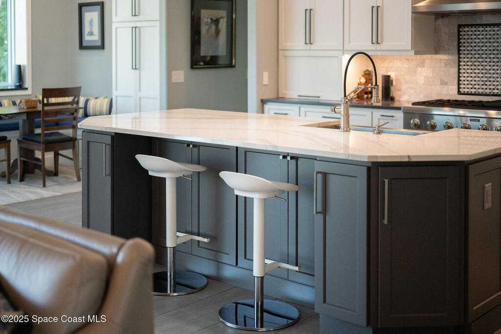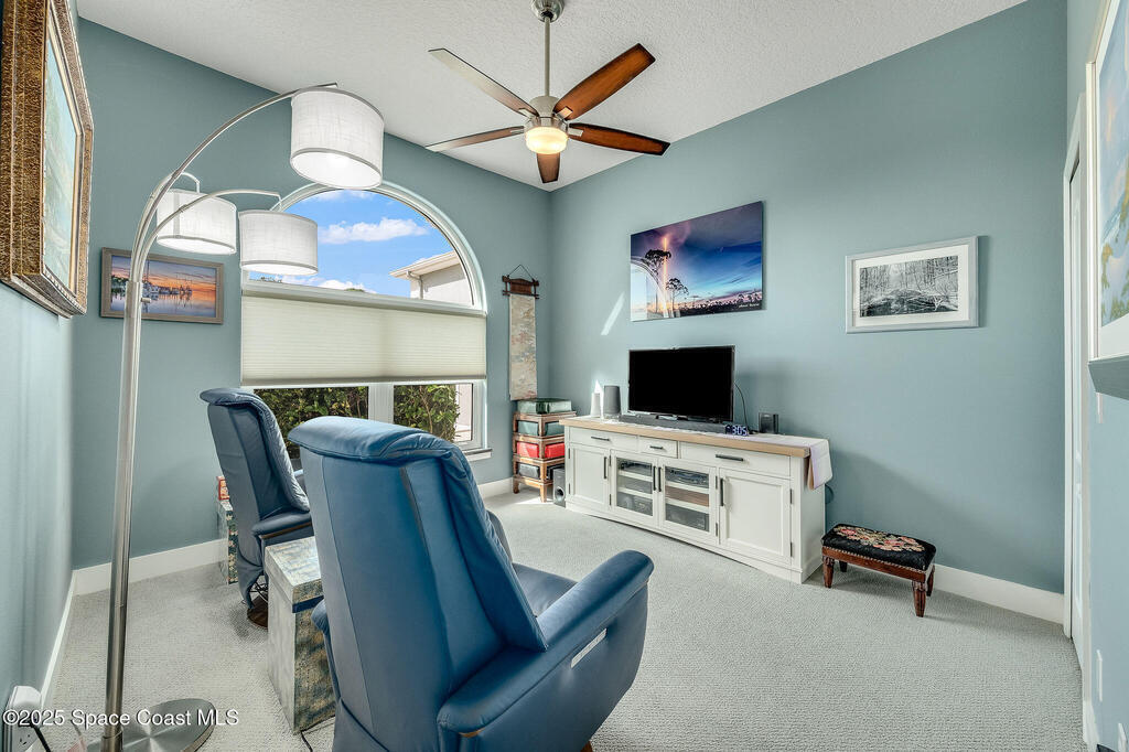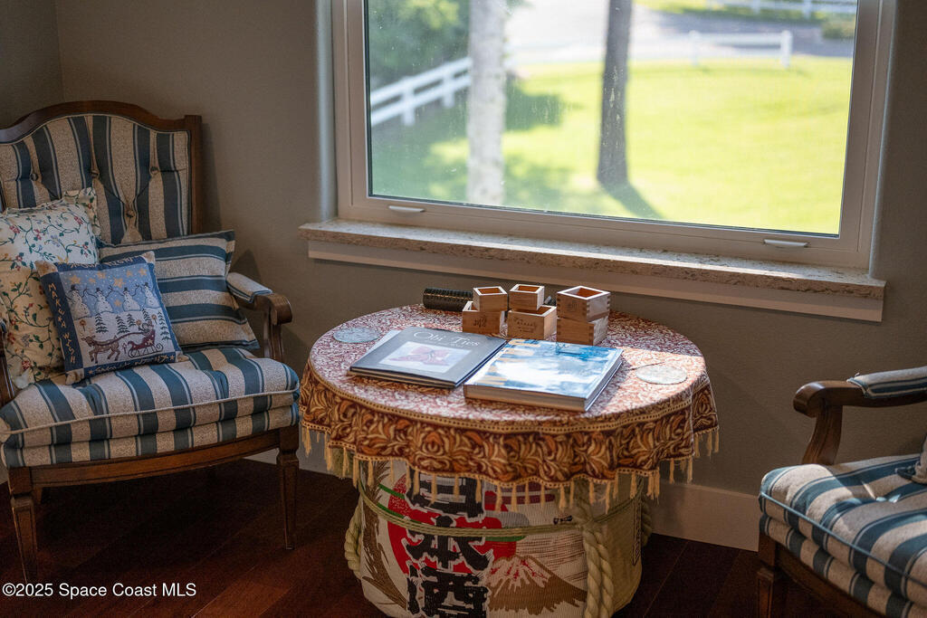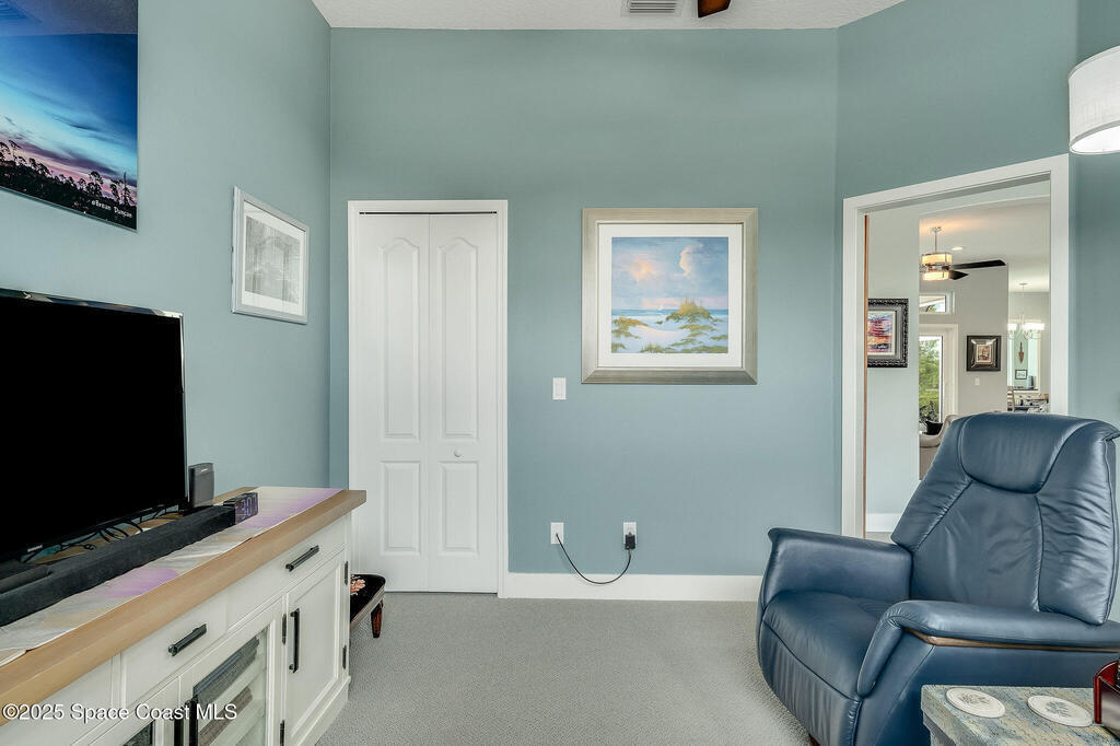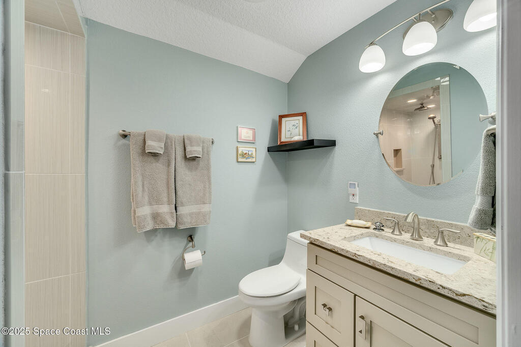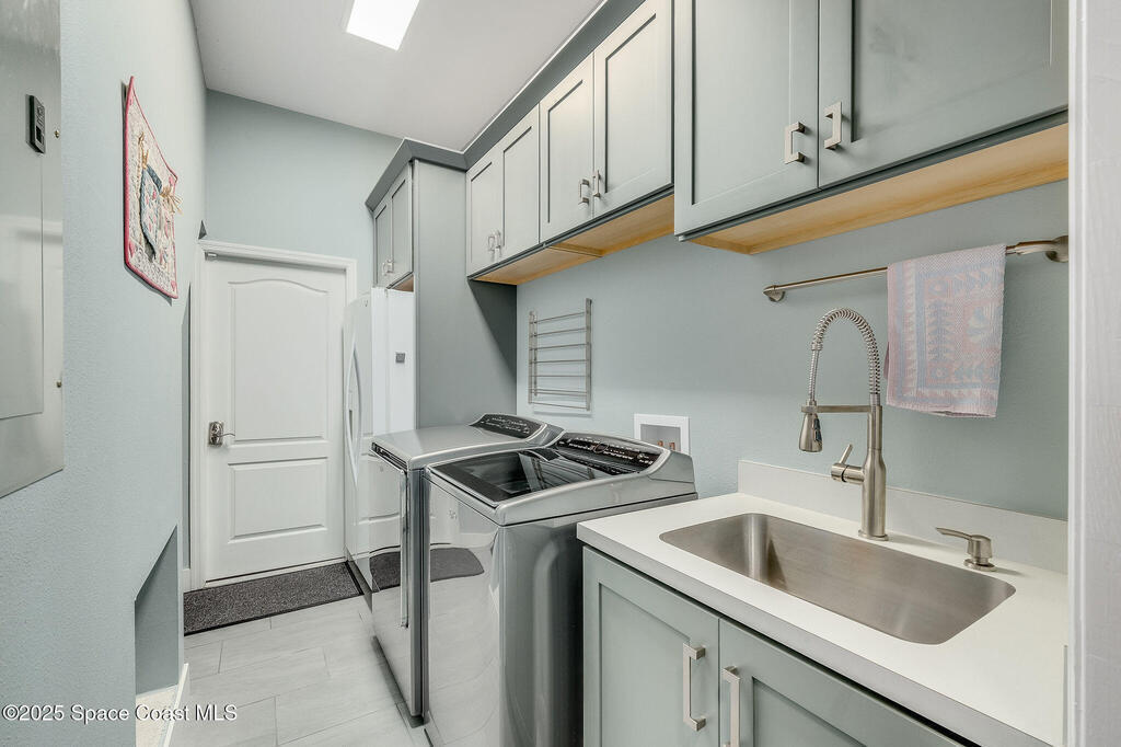 Discover refined lakefront living on 1.28 acres in The Trails, one of North Merritt Island's most sought-after communities. This 5-bedroom, 3.5-bath residence was fully remodeled in 2017 and offers luxury finishes, modern systems, and exceptional craftsmanship throughout. The interior showcases porcelain tile flooring in main areas, hardwood upstairs, and a chef's kitchen with StarMark soft-close cabinetry, glass-front uppers, under-cabinet lighting, and a full suite of Thermador appliances including double wall ovens, six-burner gas range, and dishwasher, plus a stainless French-door refrigerator and Sharp microwave drawer. Spa-inspired bathrooms feature frameless zero-threshold showers and granite or quartz counters. Additional highlights include a custom office with built-ins, an enclosed Florida room with mini-split A/C, Ecobee Smart Thermostat, tankless propane water heater, and newer Trane HVAC. The property features a 2-car attached garage and a 2022 constructed 2-bay RV