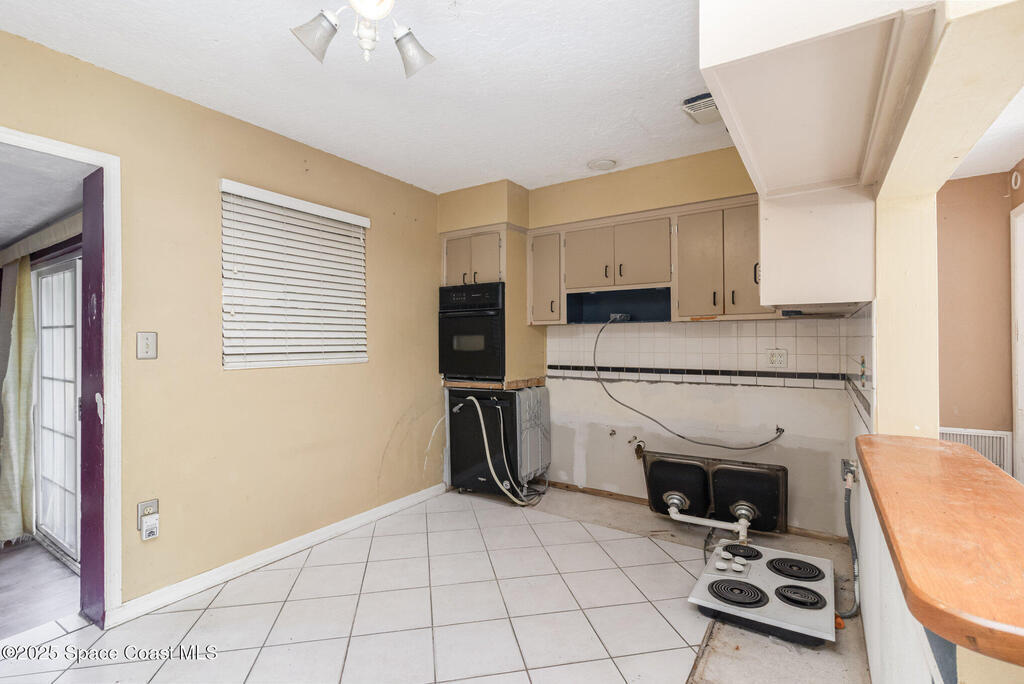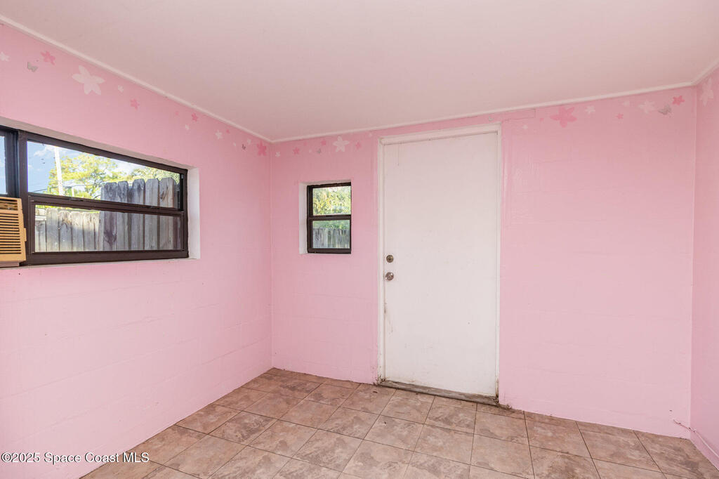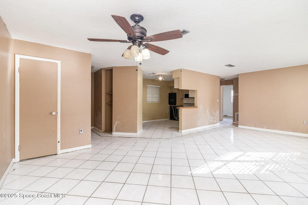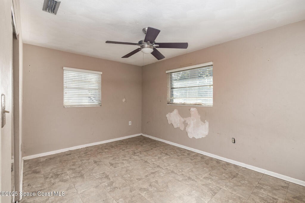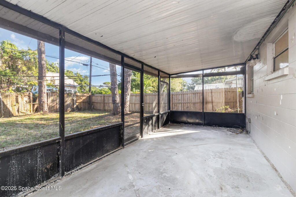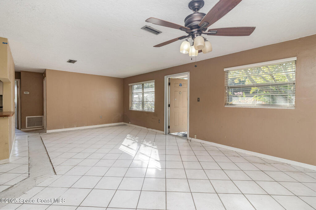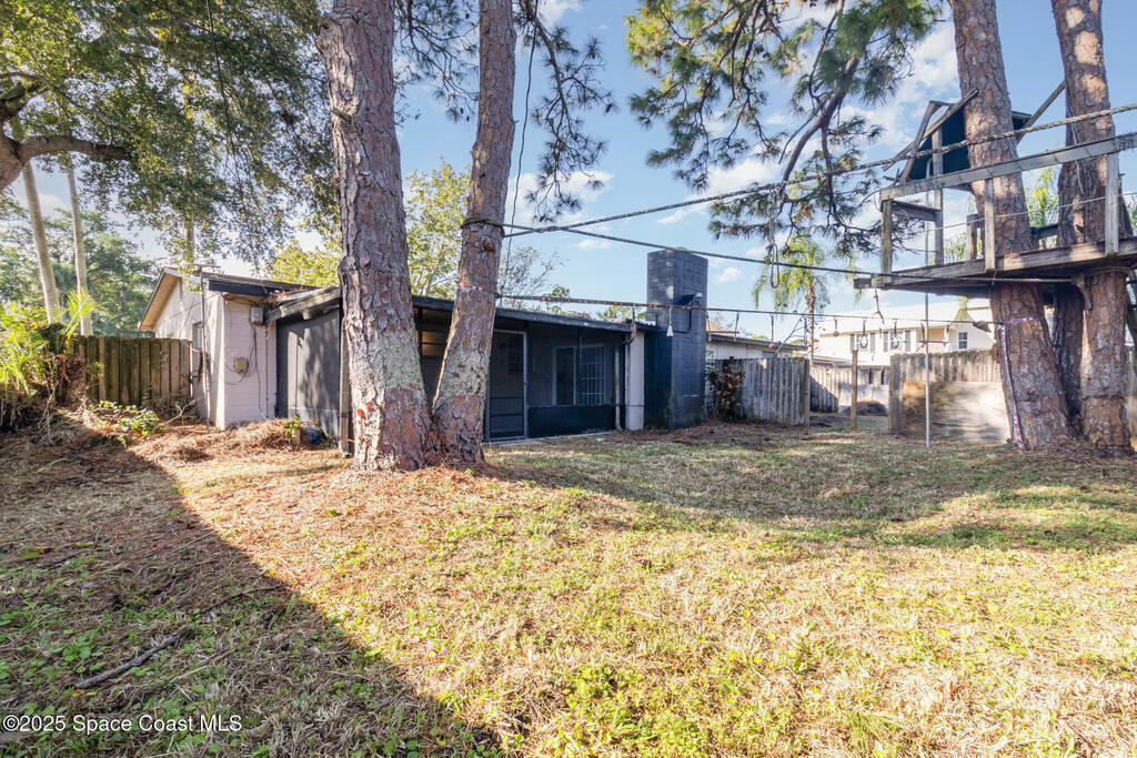 Outstanding location in South Merritt Island! 1/2 mile walk to Rotary Park. All A rated schools. Tropical landscaped front yard with large Koi pond welcomes you to this concrete block home. Incredible potential to remodel to your own taste. Cast-iron pipes have been replaced in 2022. Kitchen has already been partially removed and is a blank template ready for a fresh new look! Peaceful neighborhood of well-maintained homes and no through traffic. Open floor plan enters into living and dining room, passing through the kitchen into the family room with fireplace and sliders to the screen enclosed back porch. Was used as 3 bedroom 1.5 bath. Should be easy to modify into a 2 bathroom home. One car garage, double driveway with basketball hoop. Large backyard fenced and separated to allow one side for the kids and the other side for storage. Easy to open up completely. AC 2014. Impact garage door 2015. City Water and City Sewer!