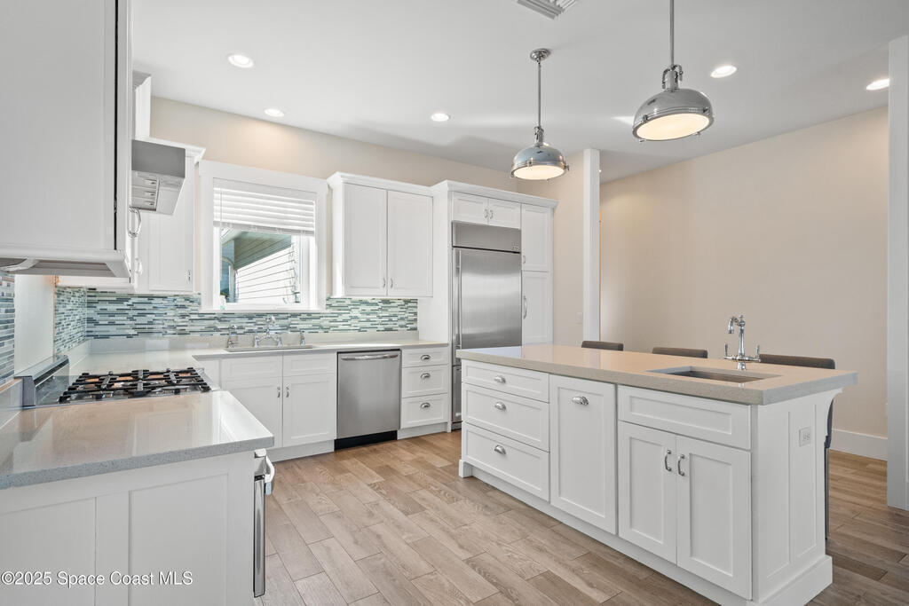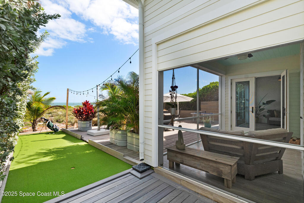 Direct Oceanfront Cocoa Beach Luxury -- Privately gated and custom-built in 2011, this exceptional residence blends timeless design with modern craftsmanship. Wide-open living spaces filled with natural light flow seamlessly to an expansive 800-square-foot oceanfront deck for effortless indoor-outdoor living. The chef's kitchen features natural gas cooking and a Bertazzoni Italian range. The upstairs primary suite is oversized with a private oceanfront porch offering the home's most captivating views. Three additional bedrooms are downstairs, including a private guest suite with its own bath and access to a screened patio. An oversized two-car garage with a versatile guest suite or office above overlooks the river, while a backyard putting green adds the perfect coastal finishing touch.