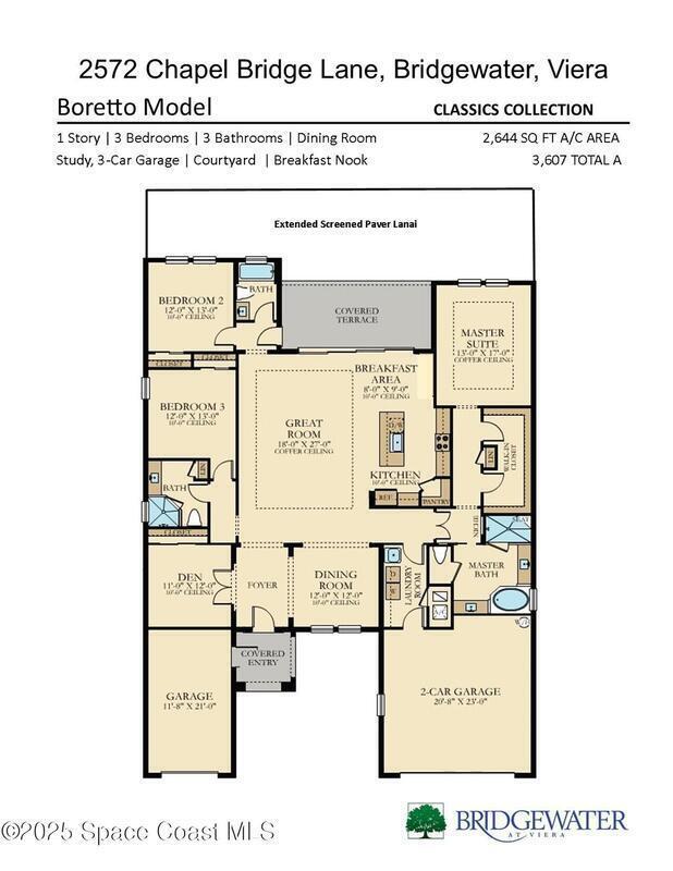Situated on a .47-acre lot in Bridgewater, Viera's prime 55+ community, this rare sought-after Boretto plan has 3 bedrooms plus a study w/ glass doors and closet, 3 baths, garages for 3 cars and includes a front courtyard flanked by a two-car garage and a separate one car garage! Imagine having two sealed paver driveways! Must have features include tile throughout, 8' doors, tray ceilings, crown moldings, and four sliders that lead to an expanded screened lanai! The gourmet kitchen delights with stunning newer designer quartz kitchen counters, enlarged island w/disposal button and touch faucet, upgraded refrigerator and d/w, and custom shelves in pantry. Enter primary bedroom through double doors into a true retreat with luxury bath w/tub and separate tile shower, tray ceiling, walk-in closet with dual entries and built-ins! Active 55+ gated community offers a resort style clubhouse with heated pool/spa, fitness center, movie theater, tennis & pickleball courts and HOA does lawncare