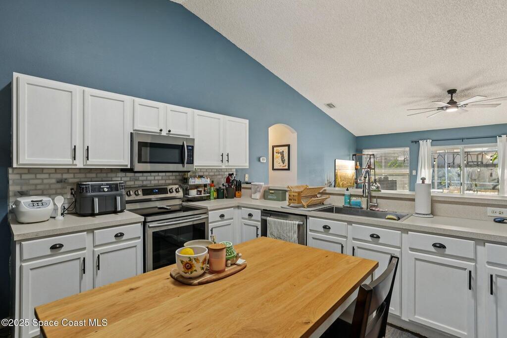 Beautiful 3-bedroom, 2-bath pool home on a spacious corner lot! Enjoy your private screened pool and lanai with all new screening and hardware (2025), plus a fully fenced backyard and covered porch offering plenty of space to relax and entertain. Inside, you'll love the new LVP flooring throughout, vaulted ceilings, and natural light in every room, creating a bright and open atmosphere. The extra-large kitchen features newer stainless steel appliances, a pantry, and abundant counter space! This home offers multiple living areas including a formal living room or office/bonus room, formal dining room, and a family room overlooking the pool. The extra large primary suite includes a walk-in closet and peaceful backyard views. Roof 2022, HVAC 2013. Located within walking distance to the elementary school and just minutes to Cape Canaveral, Kennedy Space Center, Publix, shopping, and I-95--perfect Florida living! Relax, entertain, and make this your own private retreat!