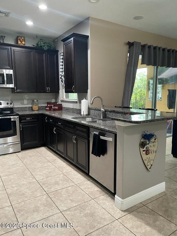 Welcome to your own tropical retreat in a quiet Palm Bay neighborhood! This 3-bed, 2-bath 2017 home offers tile floors throughout, a modern kitchen with granite countertops, stainless-steel appliances, and a dining area with a stylish tray ceiling. The master suite features dual sinks, a garden tub, and a separate walk-in shower. Enjoy outdoor living with a screened porch, pool, and summer kitchen complete with stainless-steel grill. Extras include washer, dryer, ceiling fans, updated fixtures, outdoor furniture, fire pit, shed, and children's play area. Move-in ready and beautifully maintained, this home combines comfort, style, and Florida charm. Don't miss it!