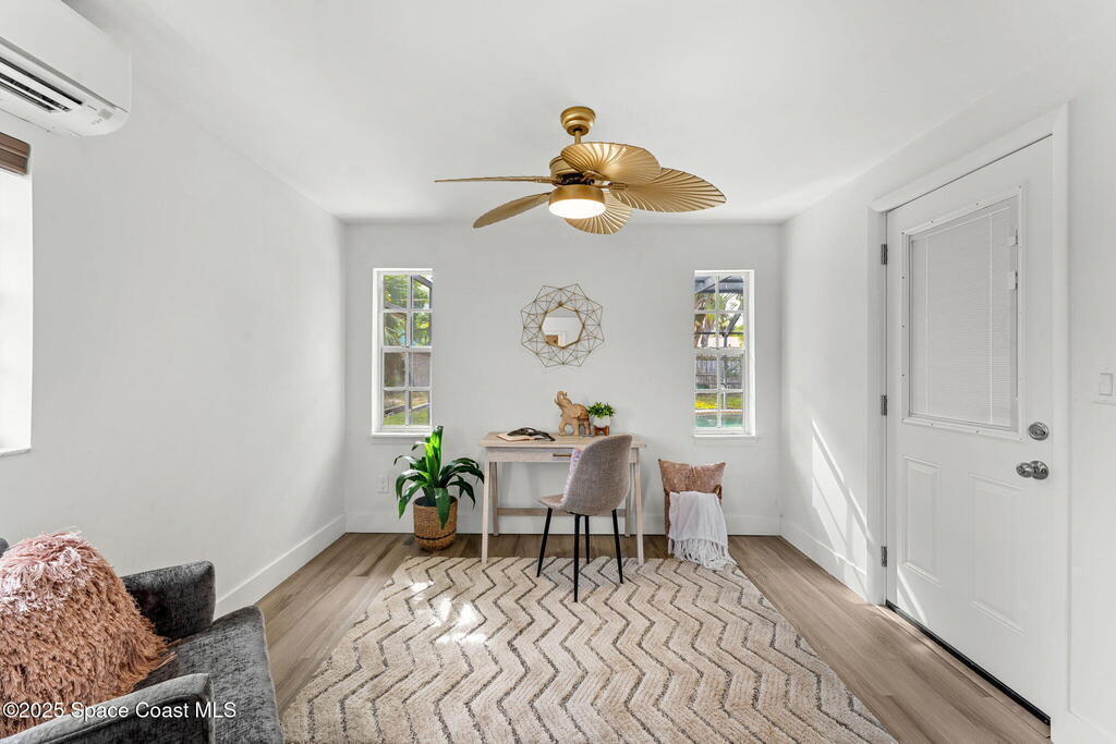 Steps from the sand, this coastal pool home delivers the laid-back lifestyle beach lovers crave. A private screened pool becomes the centerpiece for sunny afternoons & starlit evenings, while inside, 1,956 sq ft of thoughtfully designed space features LVP flooring throughout, 3 full bedrooms plus a newly added office, & a cozy wood-burning fireplace that anchors the living area. The kitchen shines with quartz counters & modern finishes that blend style with everyday function. The primary suite opens directly to the pool for effortless indoor-outdoor flow, perfect after a morning surf or bike ride to the ocean. Built of solid concrete block with a flat roof from 2021, privacy fencing, & a 2023 outdoor AC unit, the home offers lasting peace of mind. With no HOA restrictions, you're free to embrace a true beachside lifestyle--easy, timeless, & entirely your own.