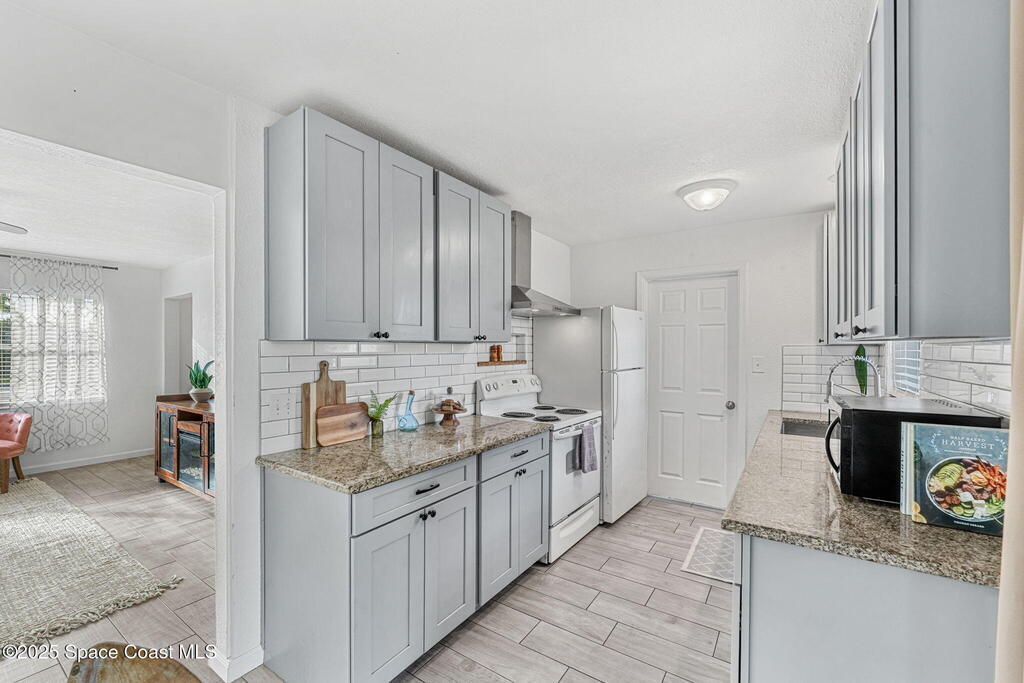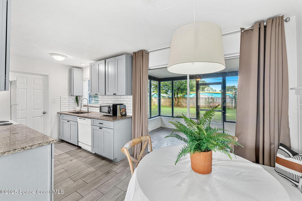 This charming 3 bedroom 2 bath has recent updates including newer kitchen cabinets & wood look tile in kitchen and living areas, New interior and Exterior Paint, New toilet in primary bathroom and new vanity and fixtures in secondary bathroom, Wainscoting in a kitchen nook with built in bench seating with storage underneath. New roof in 2023, Updated Electrical Panel in 2023, Large fully fenced in back yard with gate for all your toys, perfect for kids, fur babies & a pool! Brand new screen enclosure in front of the house by the front door, and large screened in back porch, NEW HVAC system. Tankless Gas hot water heater. Small storage area by the carport, Interior laundry room, and new modern Black and White exterior paint.