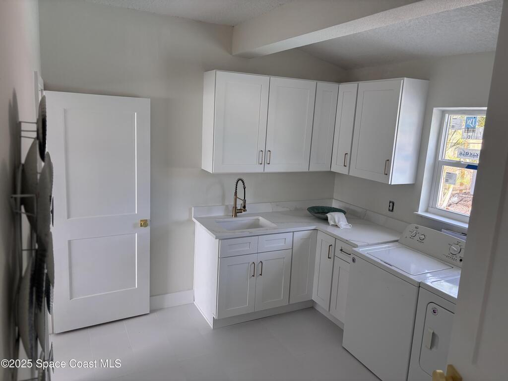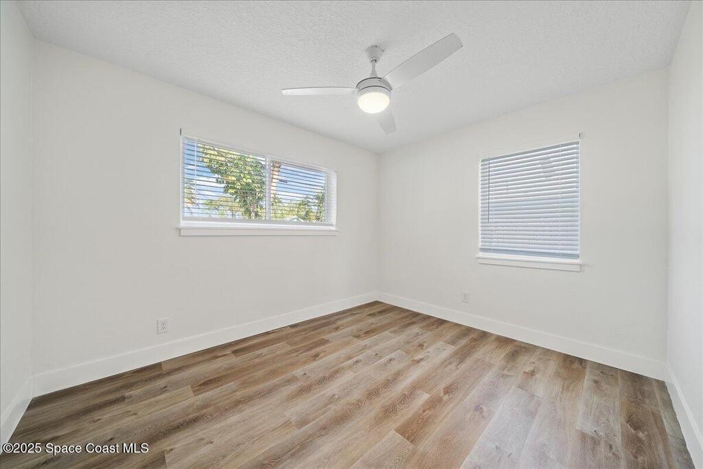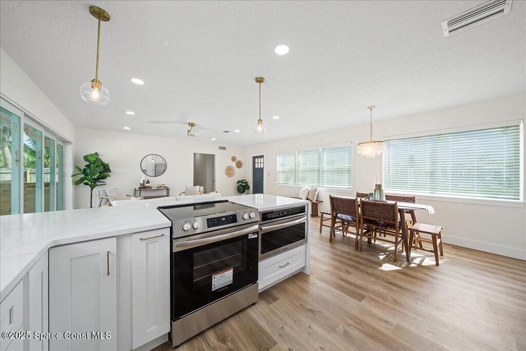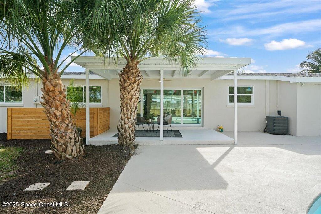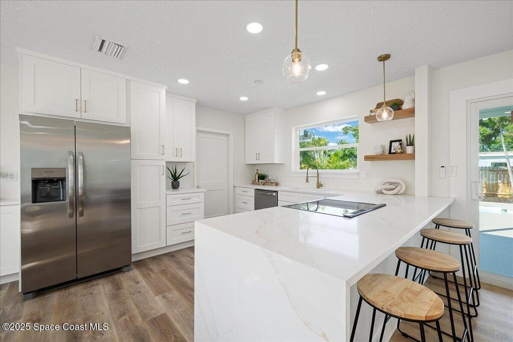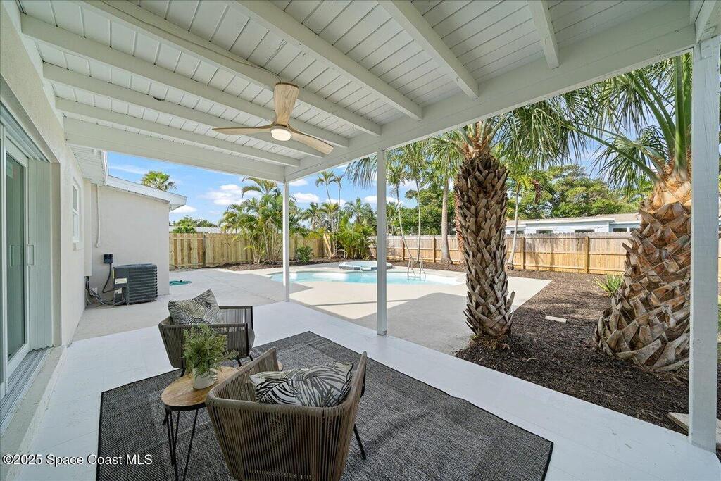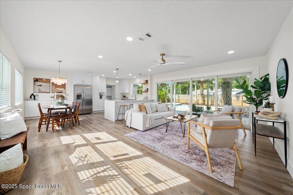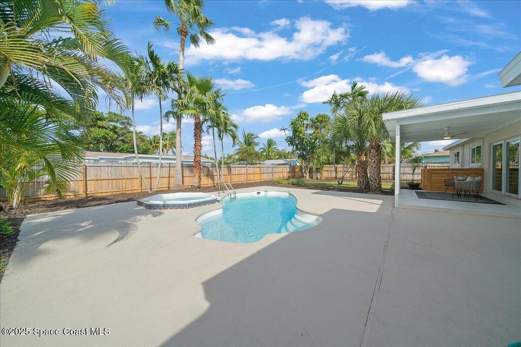 Completely renovated coastal pool home in Satellite Beach! This 4-bed, 2-bath home has been redesigned from top to bottom with new plumbing (including cast-iron drains), air ducts, hot water heater, flooring, doors, and paint inside and out. The open floor plan showcases brand-new hurricane-impact windows and sliders, wood-look LVP flooring, and a designer kitchen with quartz waterfall island, floating wood shelves, and all-new stainless appliances. Both bathrooms feature custom-tiled showers, modern vanities, and gold fixtures. Enjoy the flexible bonus bedroom, perfect for an office, playroom, or fitness space--and the convenience of indoor laundry. Step outside to a newly refinished pool, covered lanai, and tropical landscaping with upgraded irrigation, new well system, and pool pump. Every detail has been done, just blocks from the beach, parks, and top-rated schools