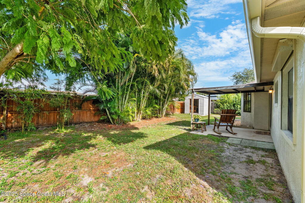 New Roof! Tropical Backyard and Move-In Ready Comfort w/ NO HOA! This beautifully cared-for home offers an open, airy layout that feels bright and welcoming from the moment you step inside. The spacious living and dining areas feature hardwood and tile flooring along with electric hurricane shutters for added peace of mind. The kitchen is equipped with granite counter tops, stainless steel appliances, an eat-in area and ample cabinet space. The entire interior was painted in 2025 and all bedrooms include new carpet (2025) and the primary suite features a walk-in closet. The exterior has fresh paint, with updated landscaping and subtle up-lighting adding to the home's curb appeal. Step outside to your private, fully fenced tropical oasis with fruit-bearing trees including blueberry and fig! A storage shed conveys, and there's no HOA. With a new roof (2023), newer HVAC (2019) and a fantastic yard, this move-in ready home is THE perfect blend of comfort, character and Florida charm!