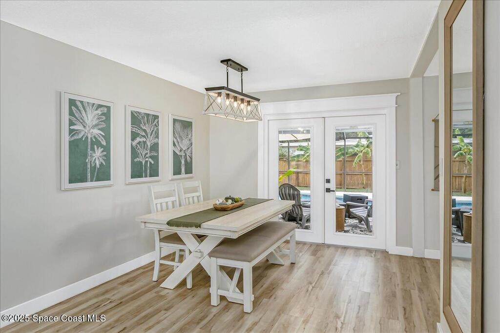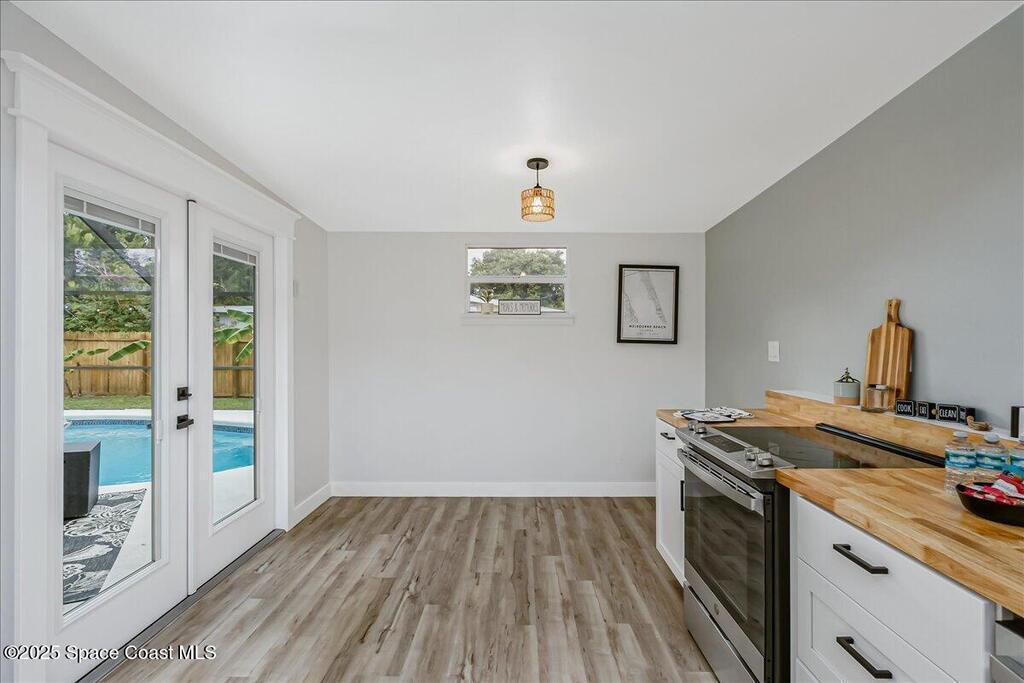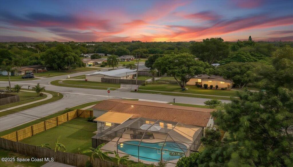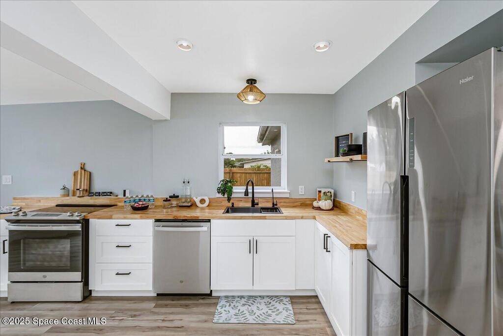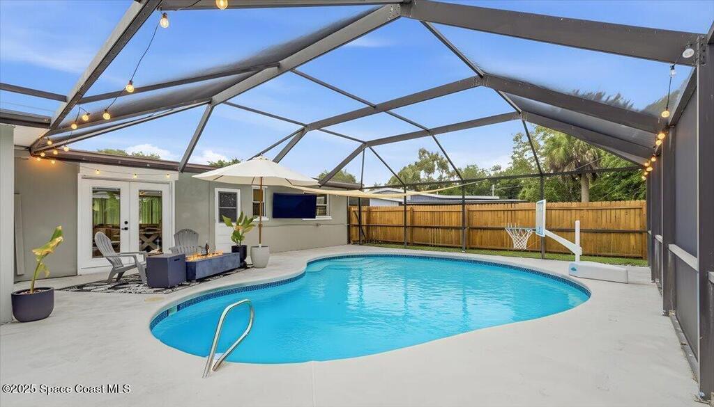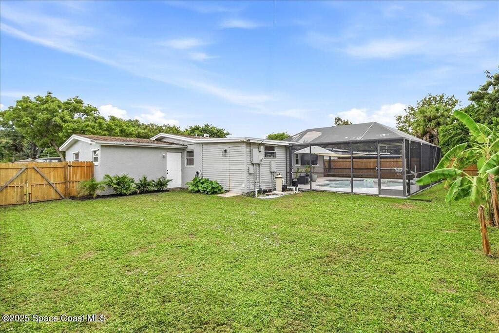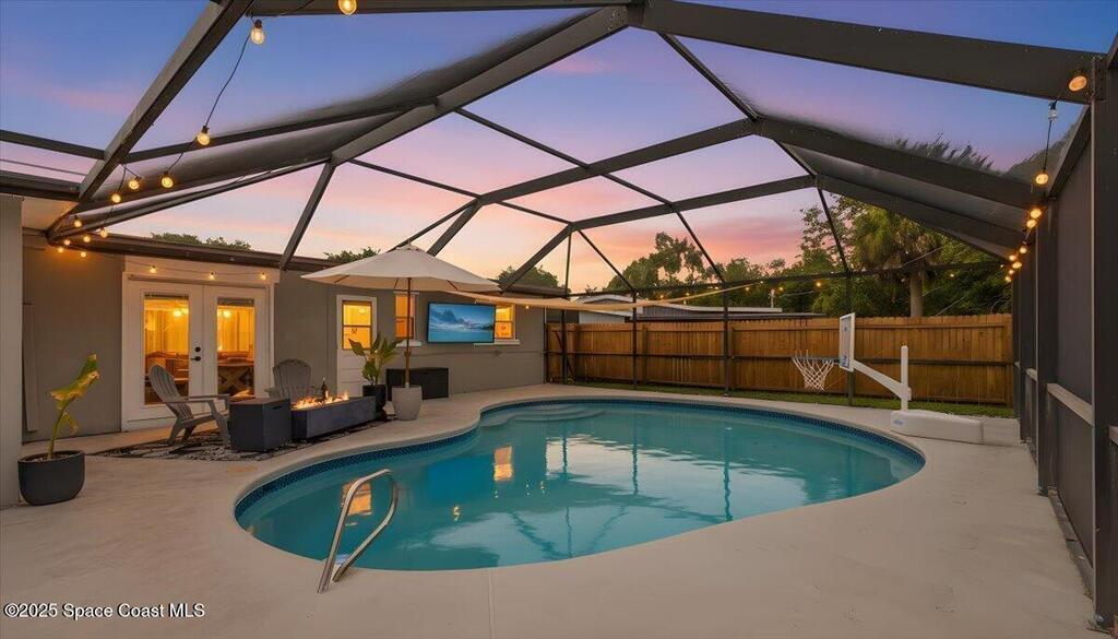 Welcome to your updated pool retreat! Solid concrete block 3-bed, 2-bath pool home on a fenced corner lot with recent updates. In-ground screened pool includes a full bath accessible from the pool deck and an outdoor TV for entertaining. One-car garage features a 40-amp EV plug. Improvements include new outlets, ceiling fans, lighting, Ring security system with video doorbell, and driveway/pool surveillance. Updated kitchen with white shaker cabinets, butcher block counters, stainless appliances, and double doors to the pool deck. Interior offers new flooring, trim, hardware, and fresh paint. Primary bath has a new toilet. Flat roof replaced in 2024, exterior repainted, and new fence gate installed. Located near restaurants, shops, schools, parks hosting local events and festivals and minutes to the beaches.