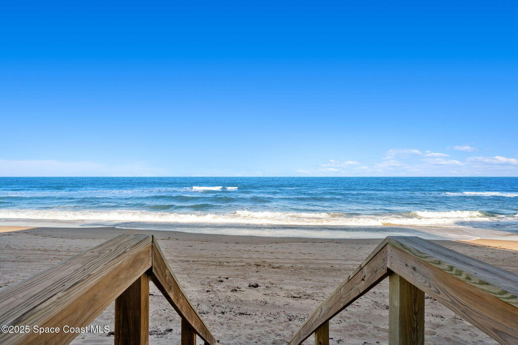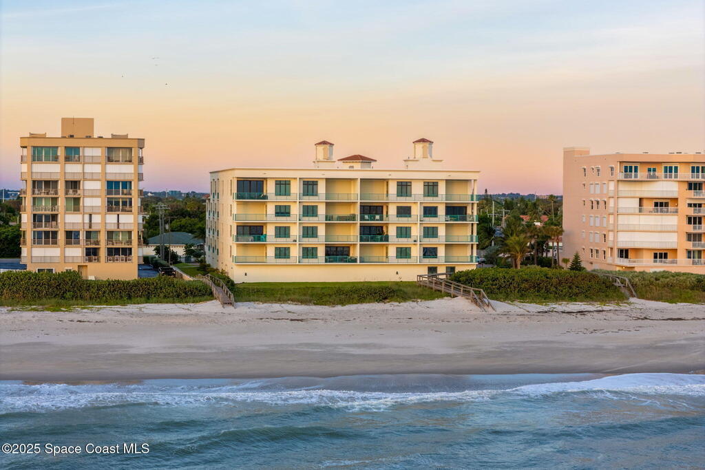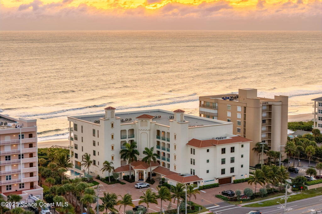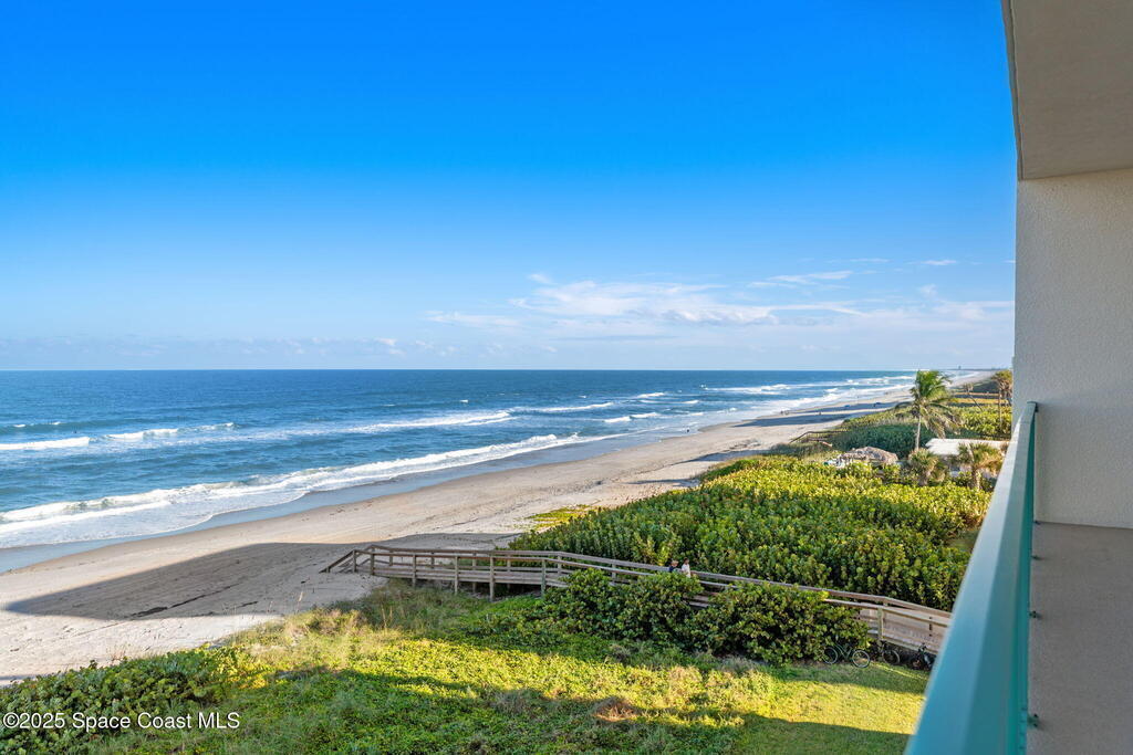 Welcome to The Palm Beach, one of the most exclusive oceanfront addresses on Florida's Space Coast. Built in 2022, this boutique Mediterranean-style building offers only 25 residences, designed to deliver privacy, luxury, and coastal serenity.Perched on the fourth floor, Unit 402 spans over 2,100 square feet with three bedrooms, three baths, and 10-foot ceilings that create an airy, open feel throughout. The interior features real wood flooring, impact-rated windows and doors, and a European-style kitchen with stainless steel appliances, a detached coffee bar, and elegant designer finishes. The primary suite includes a spa-inspired bath and a spacious walk-in closet, while the private balcony invites in the ocean breeze and sweeping Atlantic views. Amenities at The Palm Beach include a resort-style pool, hot tub, full fitness center, putting green, and an extensive grassy area perfect for pets.