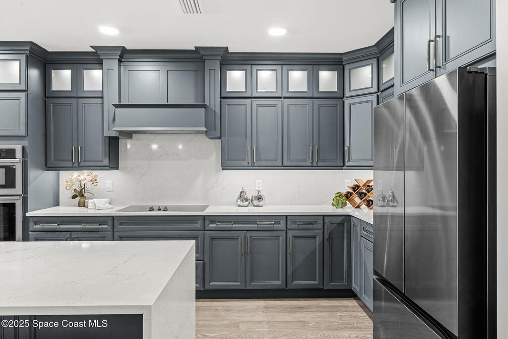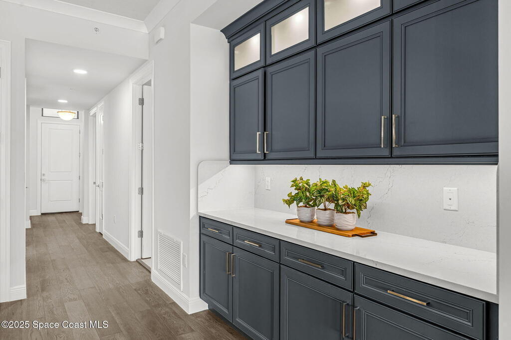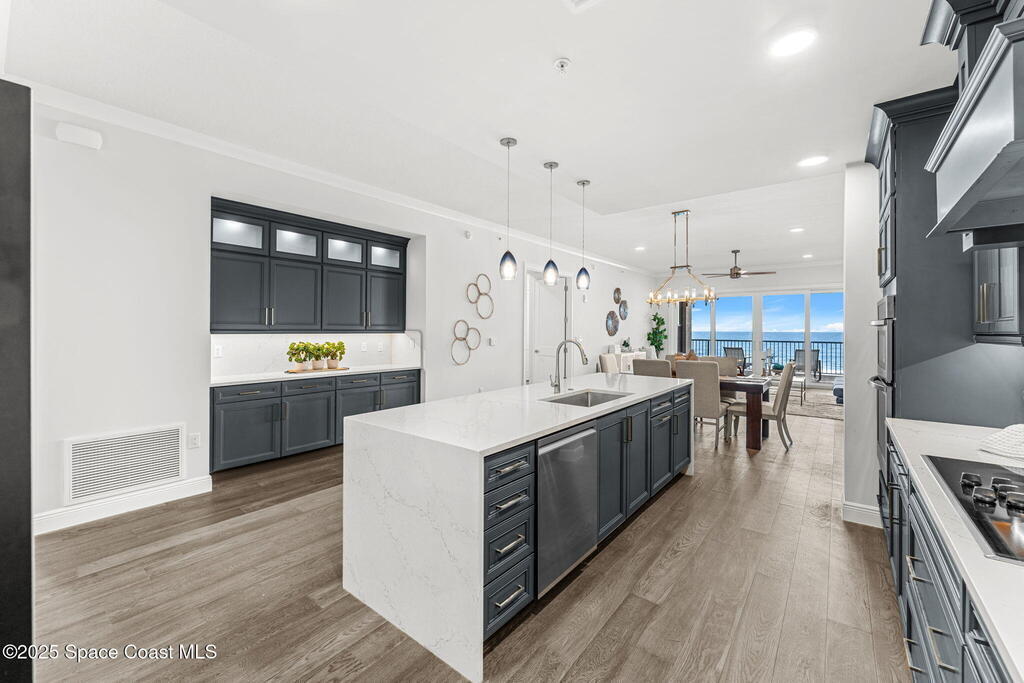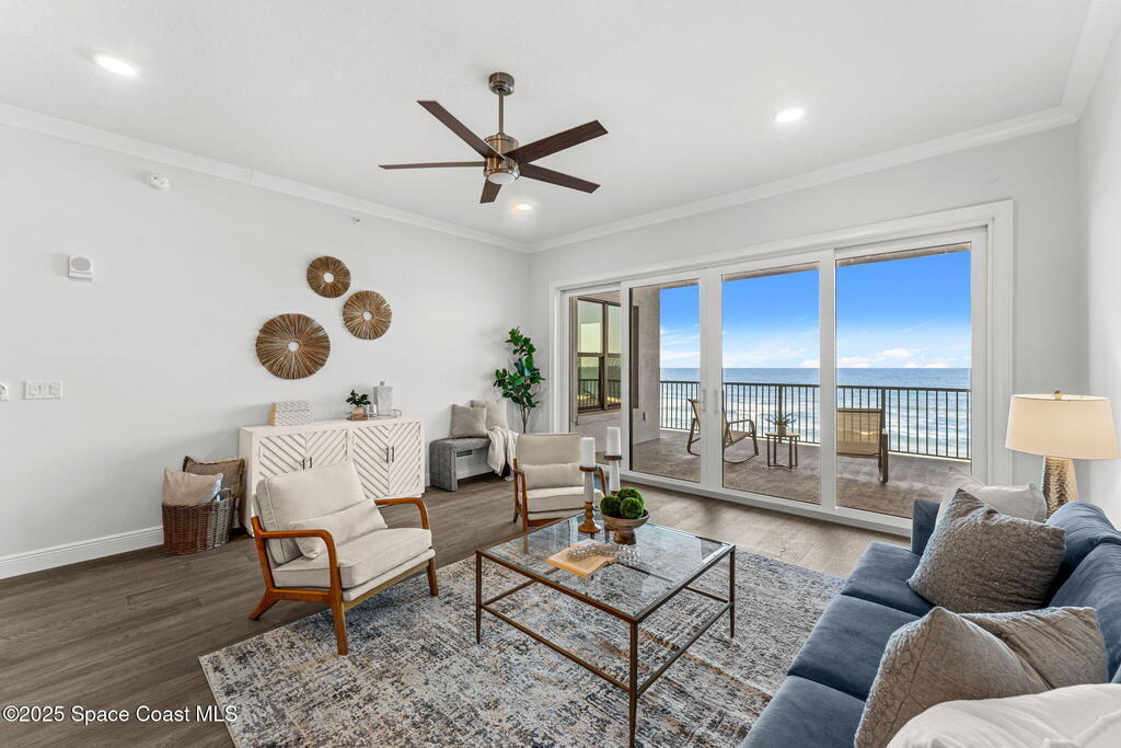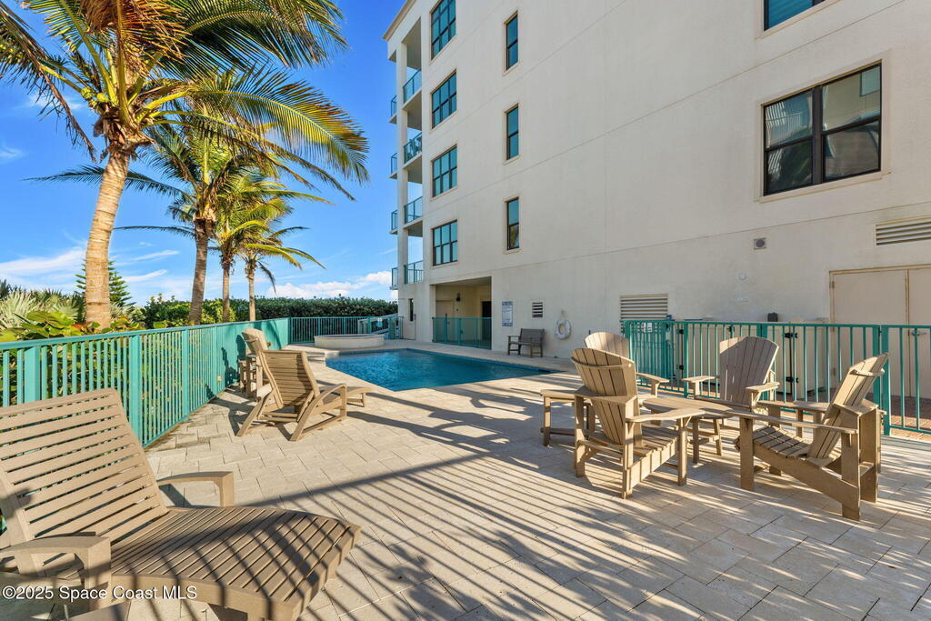 Welcome to The Palm Beach, one of the most exclusive oceanfront addresses on Florida's Space Coast. Built in 2022, this boutique Mediterranean-style building offers only 25 residences, designed to deliver privacy, luxury, and coastal serenity.Perched on the fourth floor, Unit 402 spans over 2,100 square feet with three bedrooms, three baths, and 10-foot ceilings that create an airy, open feel throughout. The interior features real wood flooring, impact-rated windows and doors, and a European-style kitchen with stainless steel appliances, a detached coffee bar, and elegant designer finishes. The primary suite includes a spa-inspired bath and a spacious walk-in closet, while the private balcony invites in the ocean breeze and sweeping Atlantic views. Amenities at The Palm Beach include a resort-style pool, hot tub, full fitness center, putting green, and an extensive grassy area perfect for pets.