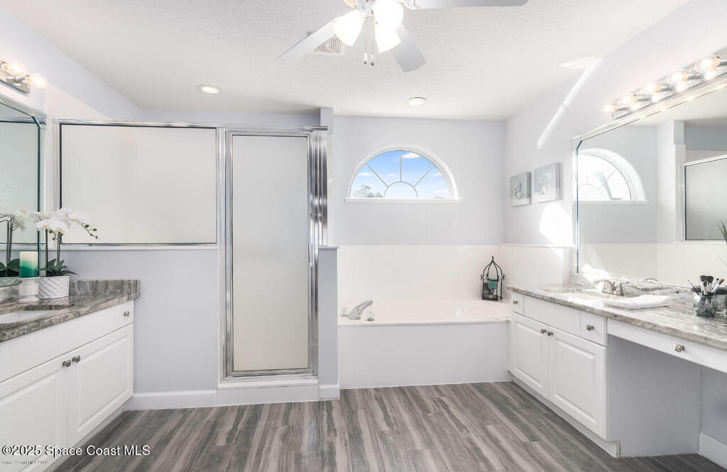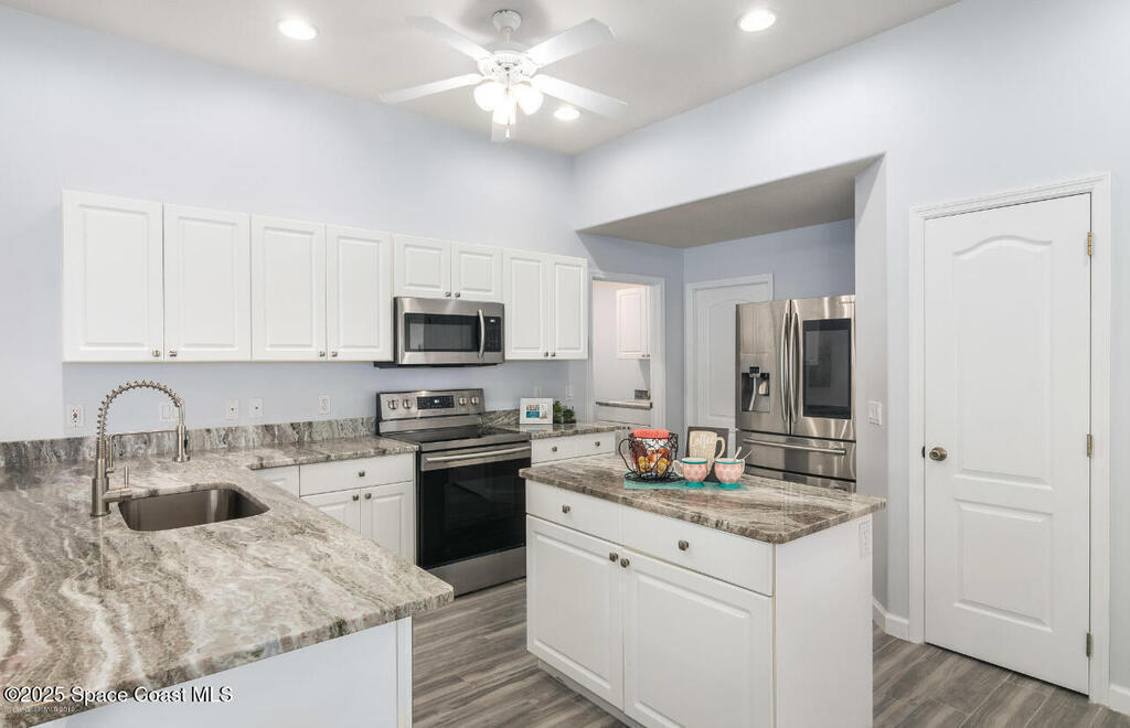 This beautifully remodeled 5 bed/3 bath pool/spa home includes a 2019 roof, 2020 A/C, stainless steel appliances, tile flooring throughout including a hardwood staircase, granite countertops in kitchen and bathrooms, freshly painted inside and out (2025), three car garage, screened-in lanai with heated pool, and overlooks a pond in the desirable gated community of Sunset Lakes. You will find 4 bedrooms downstairs with the 3 bathrooms, a formal and informal dining room, and two living spaces. The loft upstairs can be closed off for a fifth bedroom or use it as a bonus space. Walk to the neighborhood park, playground, tennis courts, basketball, and lake. Sunset Lakes is 15 minutes to Kennedy Space Center, fishing and the beach at Jetty Park, and 45 minutes to Orlando International Airport.Listing agent is licensed real estate agent and son of sellers.