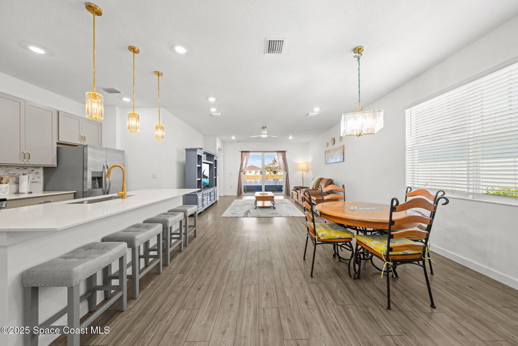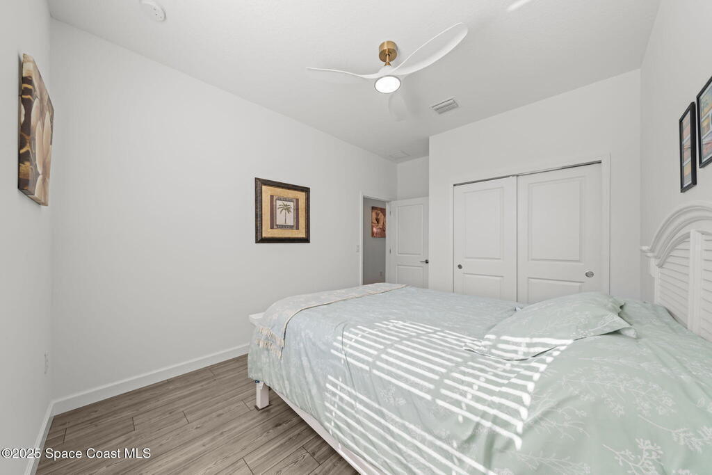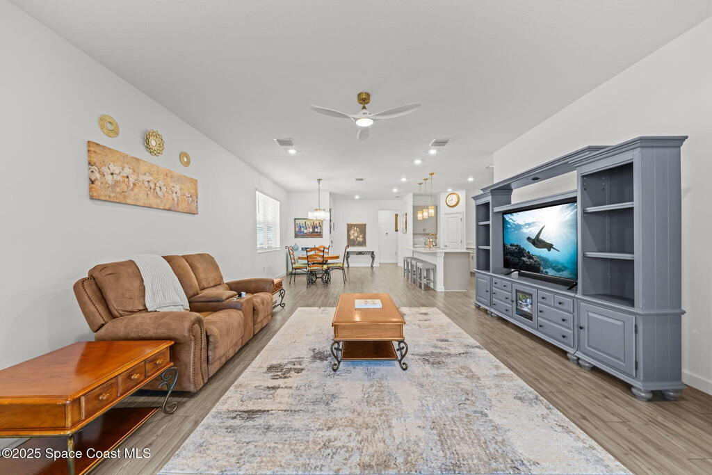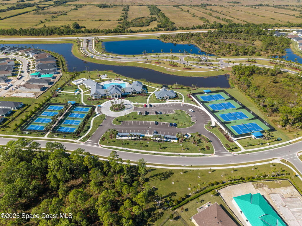 LIKE BRAND NEW, less than one year old, 1794 sq ft, 3 bedroom plus flex area, 2 bath, 2 car garage home in The Timbers at Everland, the sought after 55+ resort style community in Northwest Palm Bay! This 2024 built meticulous home backs up to a WIDE, GORGEOUS LAKE! The beautiful half duplex style home offers great north views of the lake from the added screened porch! This home includes IMPACT WINDOWS and SLIDER, which make hurricane season stress free! Must have features including beautiful gray kitchen cabinets with gorgeous quartz counters, quality luxury vinyl plank throughout, and window blinds throughout are included in this beautiful home! Unwind at the brand new private clubhouse, featuring a large heated pool and spa, fitness room, aerobics studio, card room, dog park, putting green, fishing dock, tennis and pickle ball courts, bocce, and even a movie theater! And the HOA covers your home's lawn care! Short car ride to the City of Melbourne and plenty of shopping and dining!