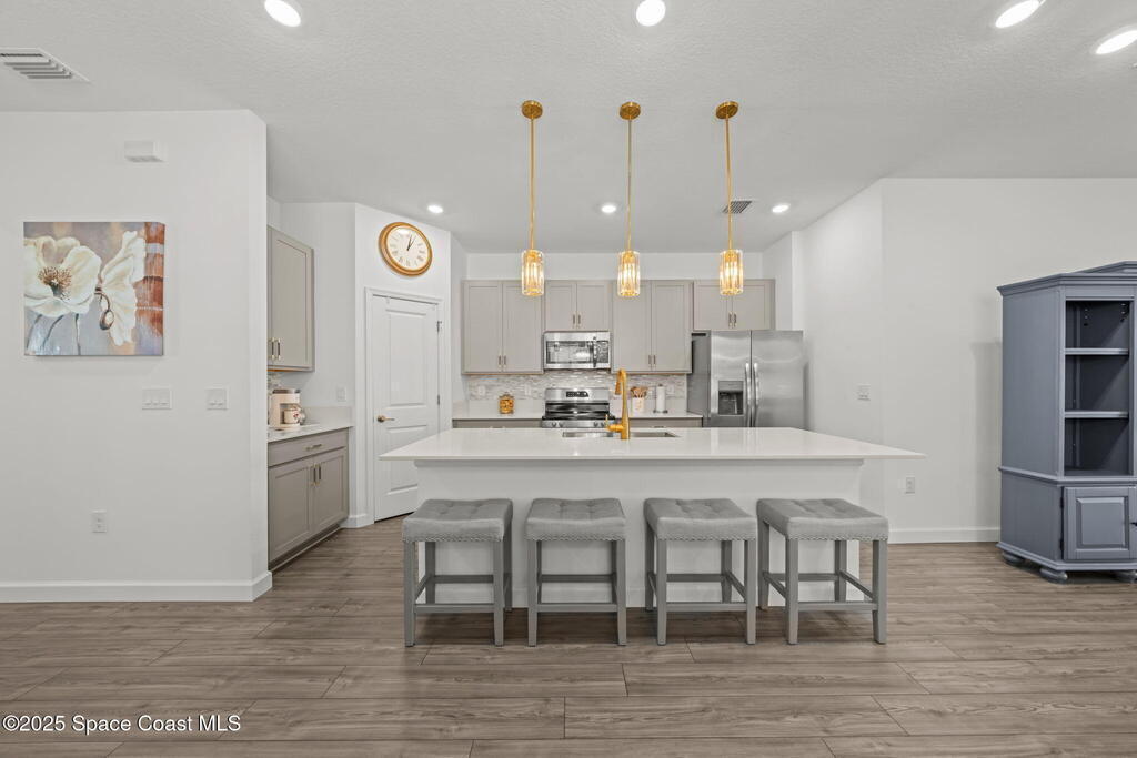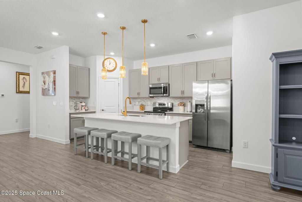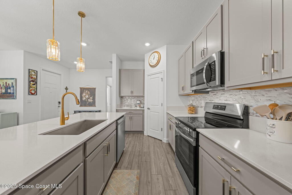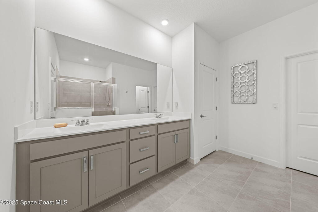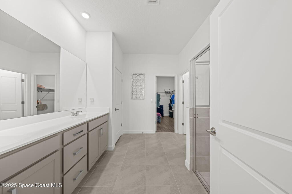 LIKE BRAND NEW, less than one year old, 1794 sq ft, 3 bedroom plus flex area, 2 bath, 2 car garage home in The Timbers at Everland, the sought after 55+ resort style community in Northwest Palm Bay! This 2024 built meticulous home backs up to a WIDE, GORGEOUS LAKE! The beautiful half duplex style home offers great north views of the lake from the added screened porch! This home includes IMPACT WINDOWS and SLIDER, which make hurricane season stress free! Must have features including beautiful gray kitchen cabinets with gorgeous quartz counters, quality luxury vinyl plank throughout, and window blinds throughout are included in this beautiful home! Unwind at the brand new private clubhouse, featuring a large heated pool and spa, fitness room, aerobics studio, card room, dog park, putting green, fishing dock, tennis and pickle ball courts, bocce, and even a movie theater! And the HOA covers your home's lawn care! Short car ride to the City of Melbourne and plenty of shopping and dining!