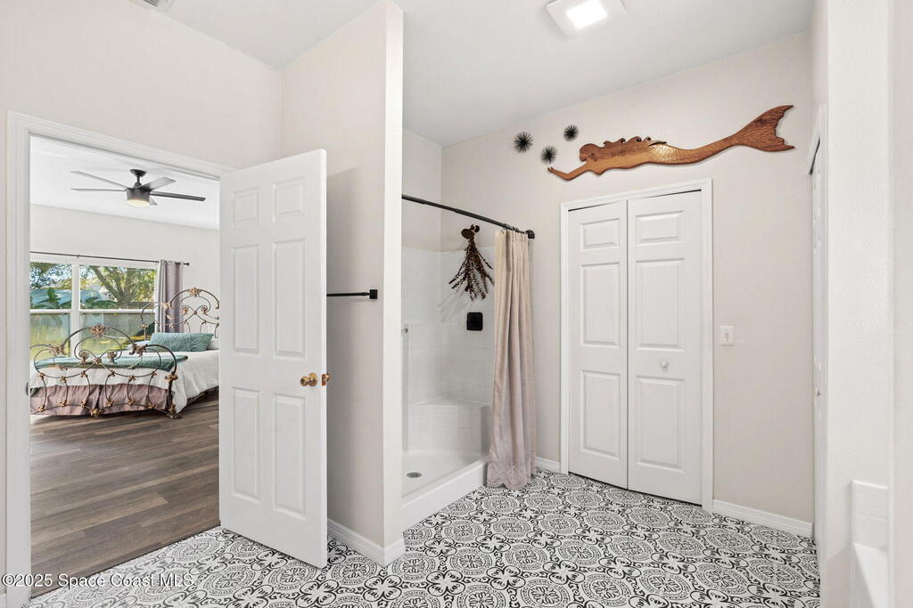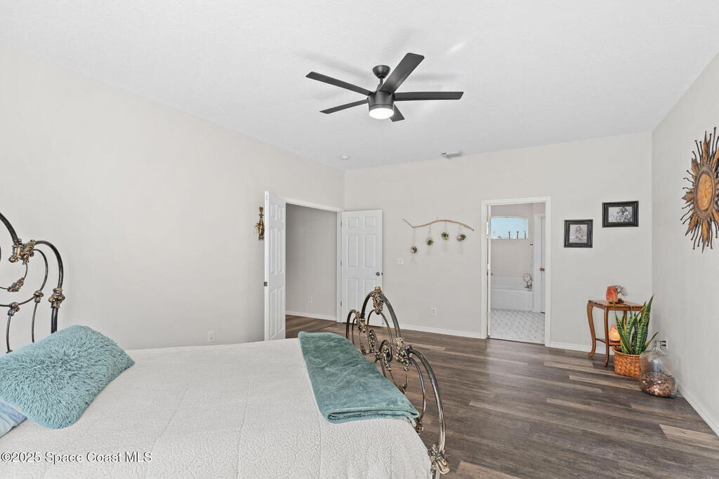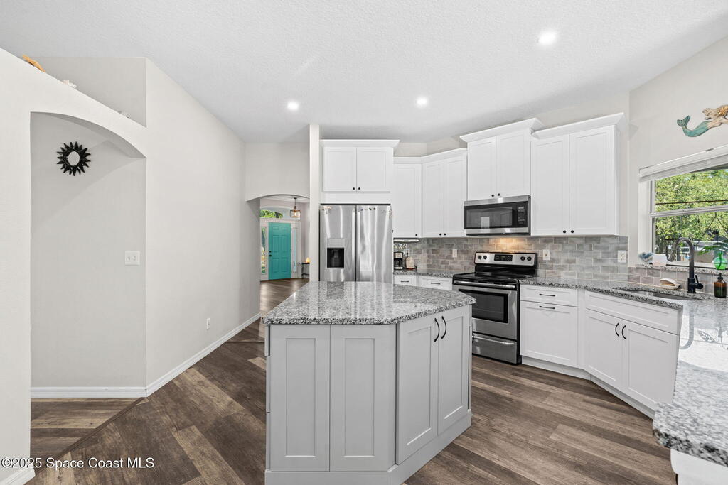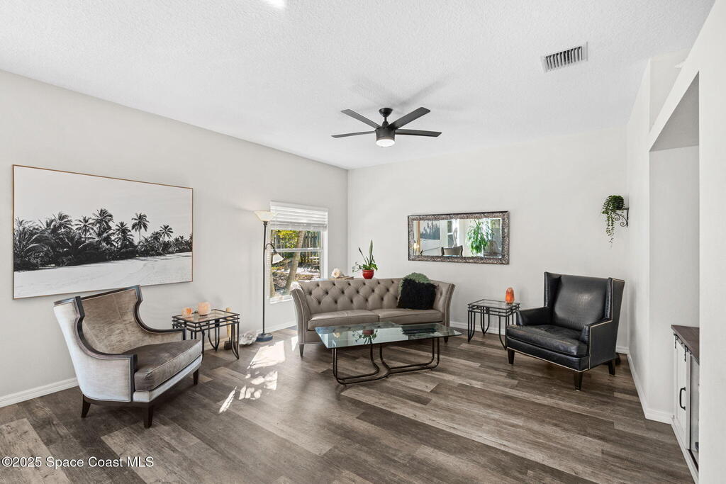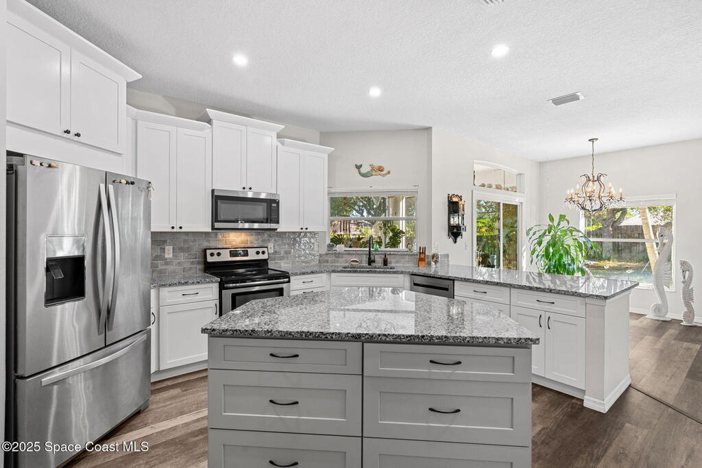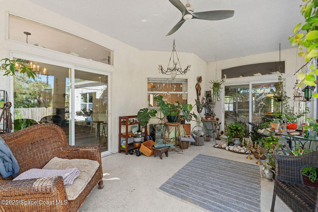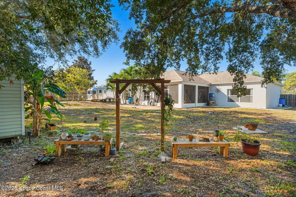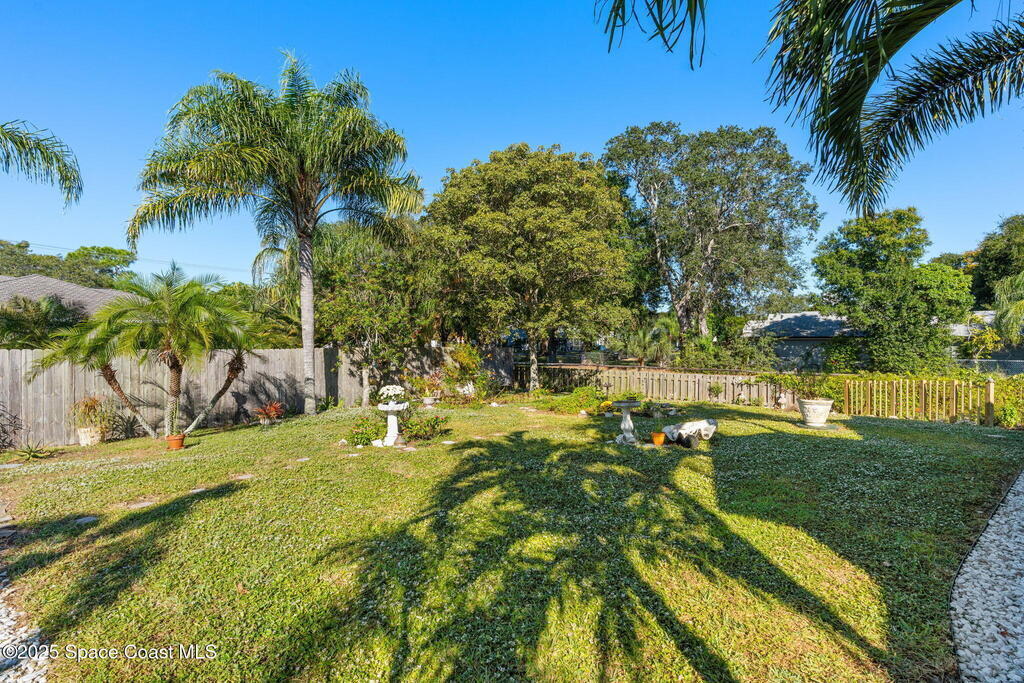 We begin with a rare and refreshing feature: a native Florida yard, thoughtfully maintained without chemicals to nurture butterflies, wildlife, and a truly natural, serene landscape. Tucked away on a private flag lot accessed by easement this .37-acre retreat offers both seclusion and beauty from the moment you arrive. Outdoors the yard is a true sanctuary. A garden shed remains for your tools & hobbies, while banana, papaya, orange, & avocado trees are your fruits to bear.This home will not disappoint, showcasing 2,322 sq. ft. of living space, wide-plank oak flooring and trendy tile throughout, soaring high/vaulted ceilings, with abundant natural light. The stunning kitchen is the heart of the home, appointed with crisp white shaker cabinetry, a light gray contrasting center island, granite countertops, & stainless steel appliances to convey. Located near top-rated schools and just a 15-minute drive to the shores of Cocoa Beach, this home blends natural beauty & modern upgrades.