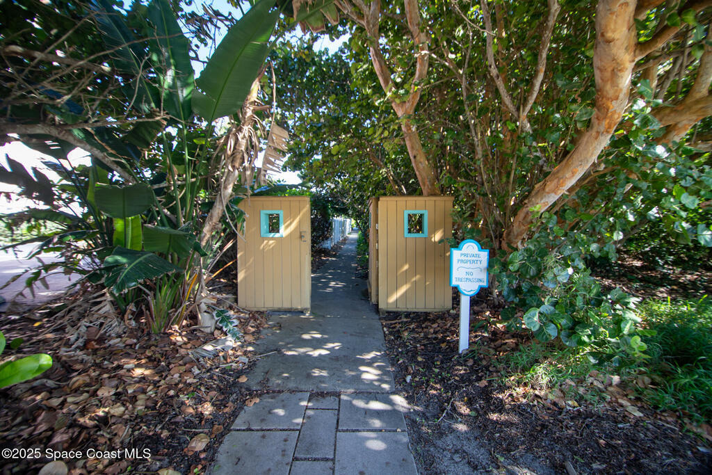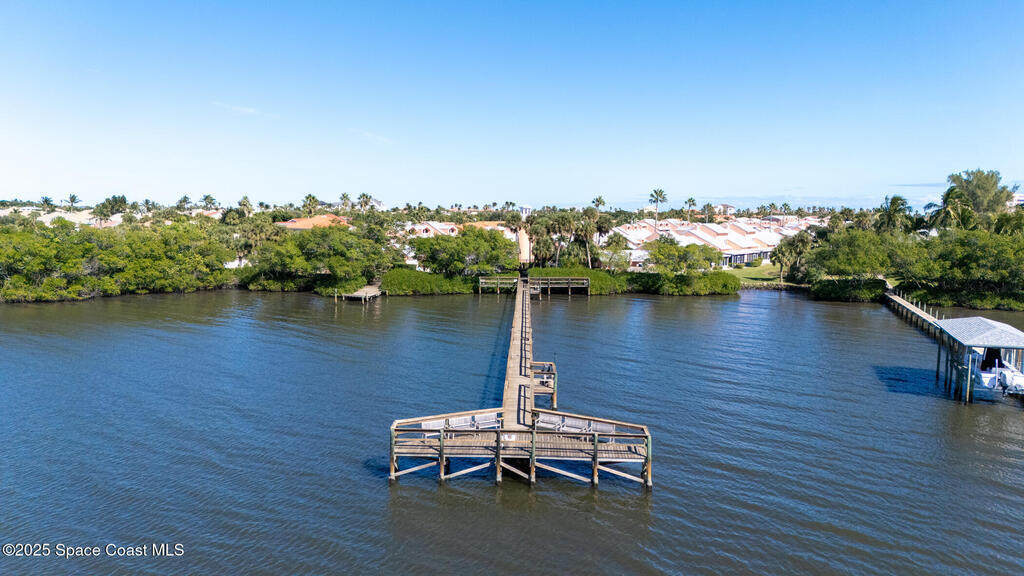 Perfectly positioned between the Atlantic Ocean & the Indian River, this desirable Lighthouse Cove home captures the essence of relaxed, upscale beachside living. Just steps from the shoreline, residents enjoy exclusive gated beach access & a private riverfront pier with a convenient boat ramp for boating, fishing, or soaking in unforgettable sunsets. This ONE-story unit features two spacious bedrooms, each with an ensuite bath & walk-in closet. The open floorplan boasts soaring ceilings & a bright kitchen with solid wood cabinetry, seamlessly connected to the inviting great room. A charming, screened porch offers tranquil wooded views, ideal for relaxing any time of day. Additional highlights include a 2020 HVAC, 2024 roof, one-car garage with extended driveway for parking up to three vehicles, & a heated community pool with clubhouse. The HOA covers exterior maintenance, roof, landscaping, irrigation, water, trash, plumbing, & structural insurance for low-maintenance coastal living.