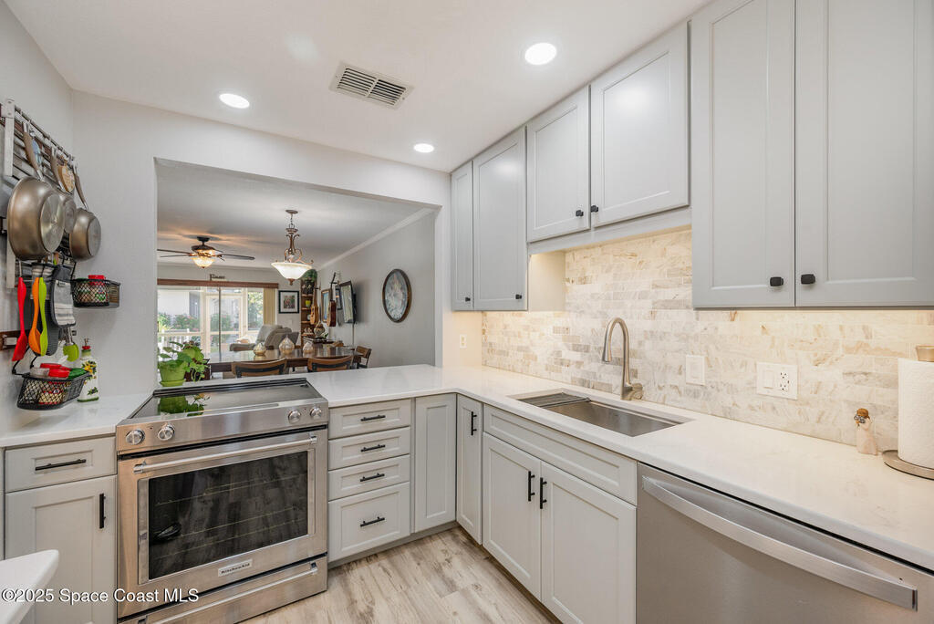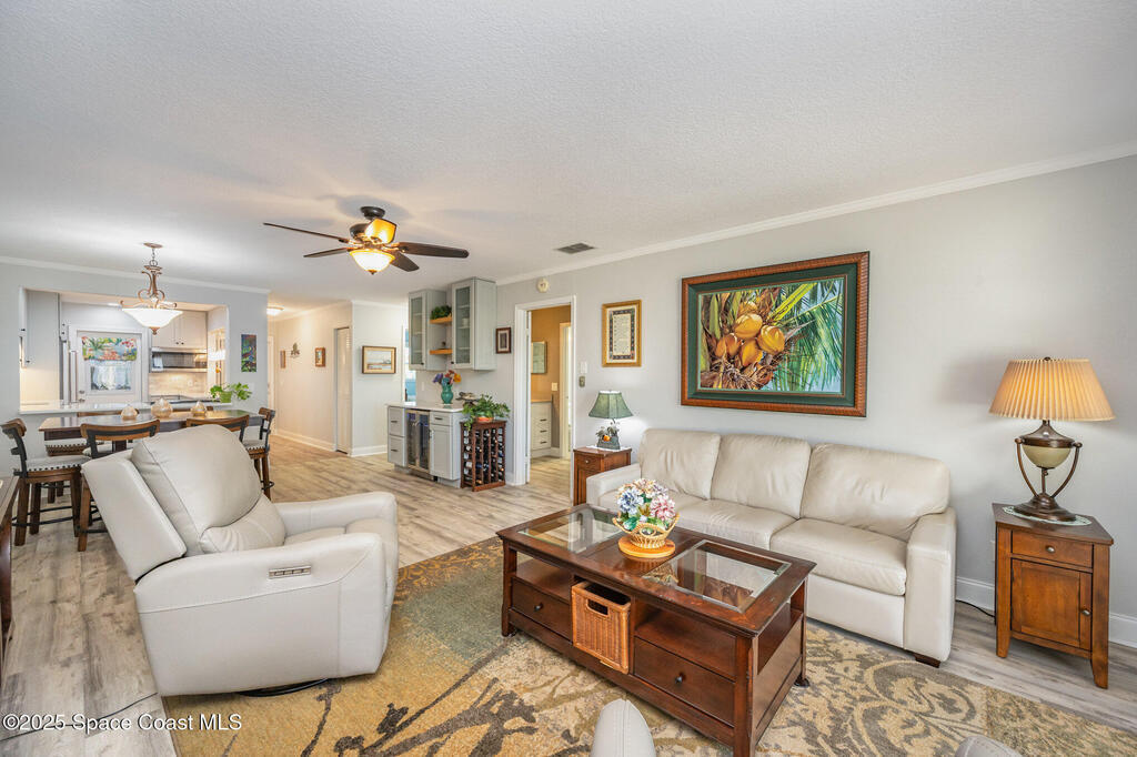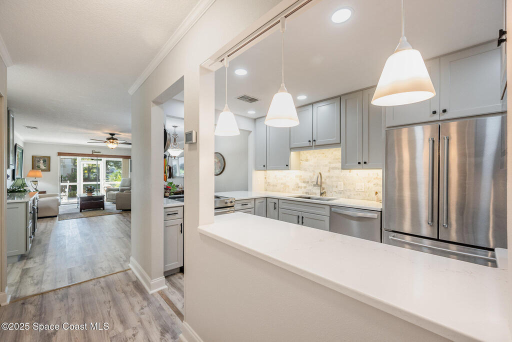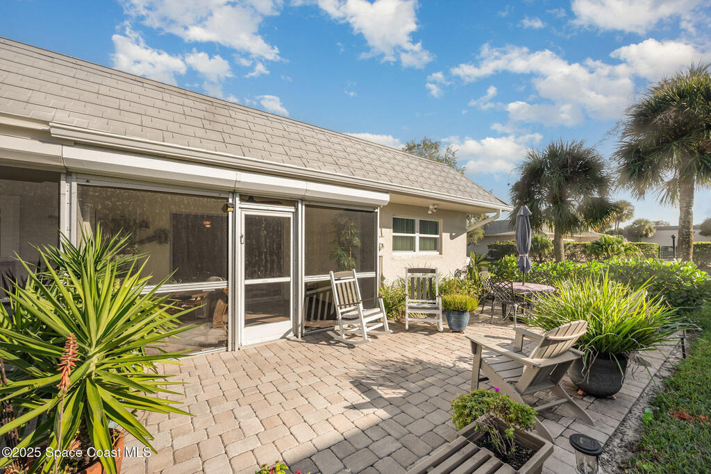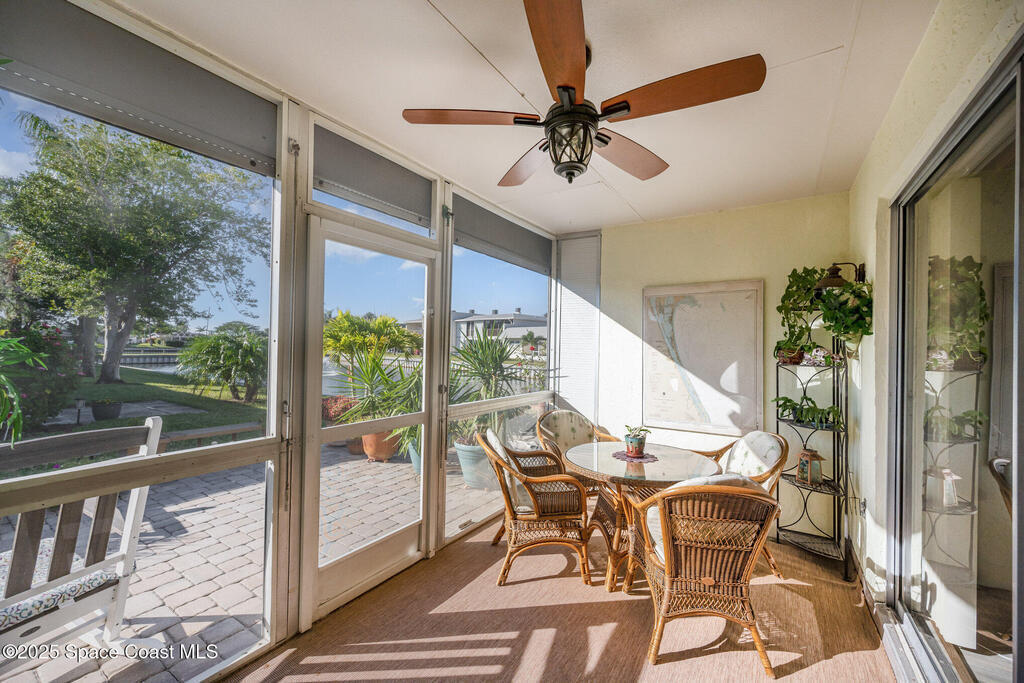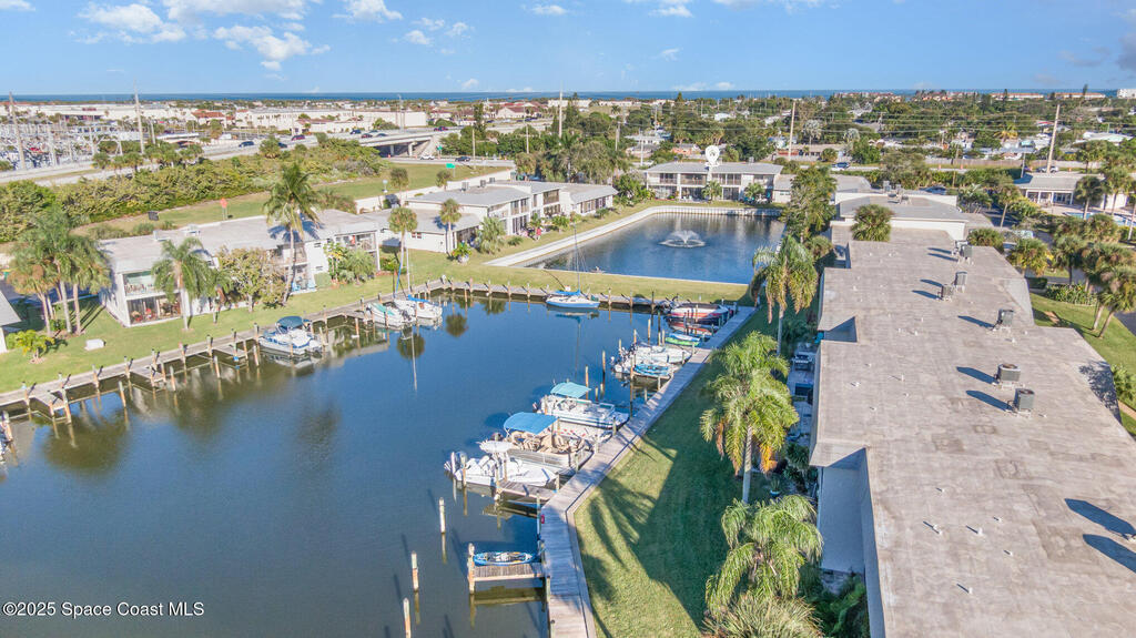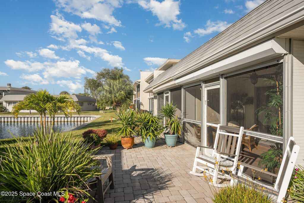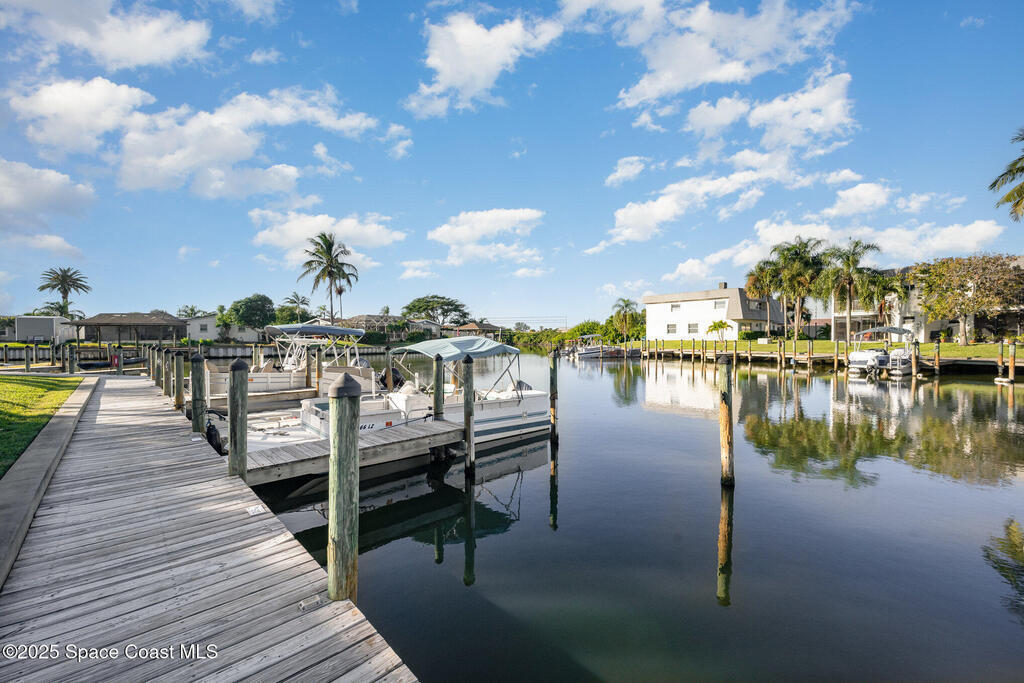 This beautifully remodeled 1-story end-unit waterfront townhome is just blocks from the Atlantic Ocean and includes your assigned boat slip. Flooded with natural light through new impact windows, the interior features new LVP flooring, tile in the guest bath, and a stunning kitchen with quartz countertops, stainless appliances, deep workstation sink with accessories, soft-close cabinetry, marble backsplash, and touch lighting. The dining area offers a wine and beverage bar perfect for entertaining. The owner's en suite includes a designer walk-in closet and double sinks. Additional upgrades include crown molding, faux wood blinds, and fans throughout. Enjoy the paved front courtyard or relax on the paver patio overlooking the Banana River canal or on your XL screened porch. A/C 2019, newer hot water heater, and upgraded electrical panel. Community amenities include pool, pickleball, and tennis. You won't believe it until you see it so make your appt today!