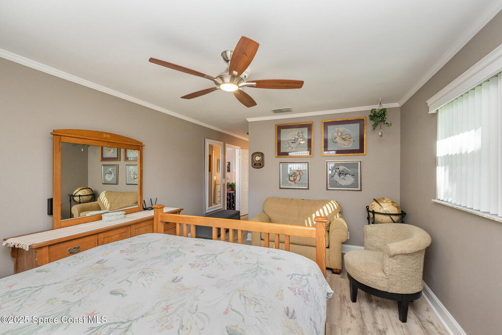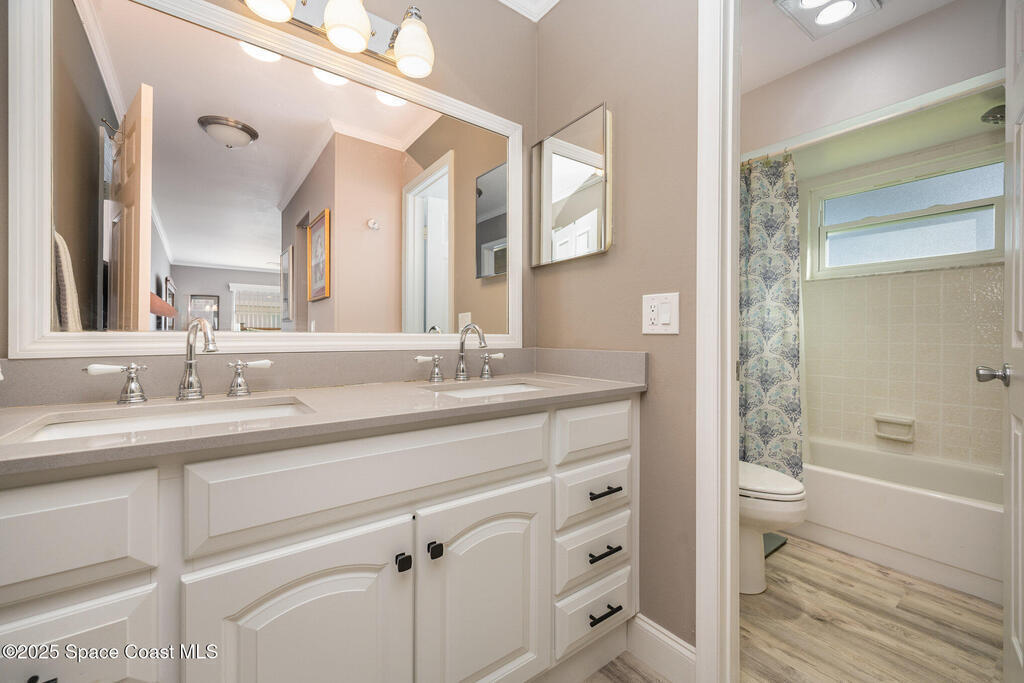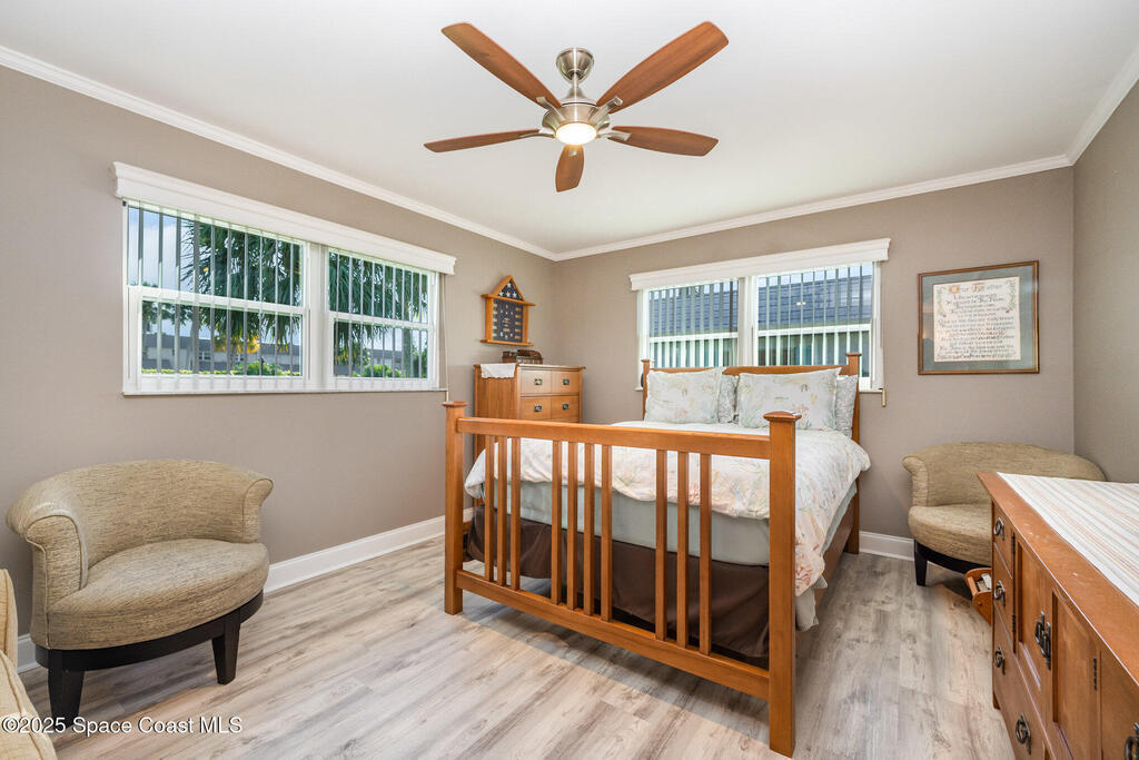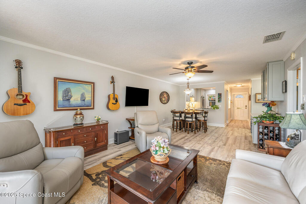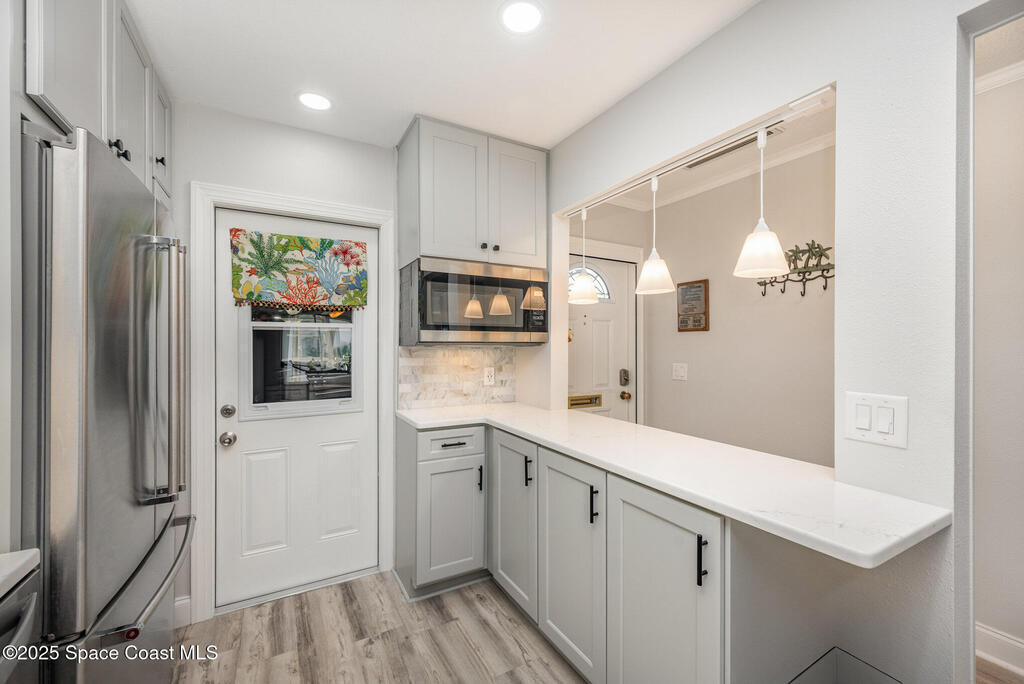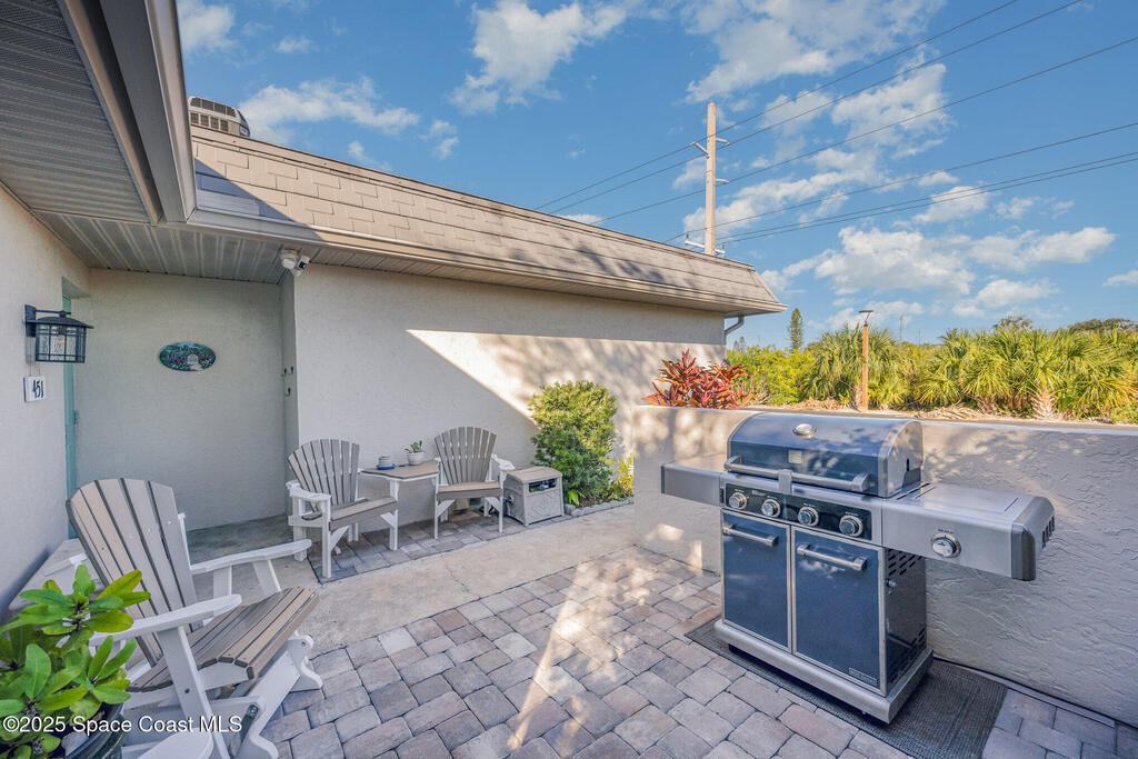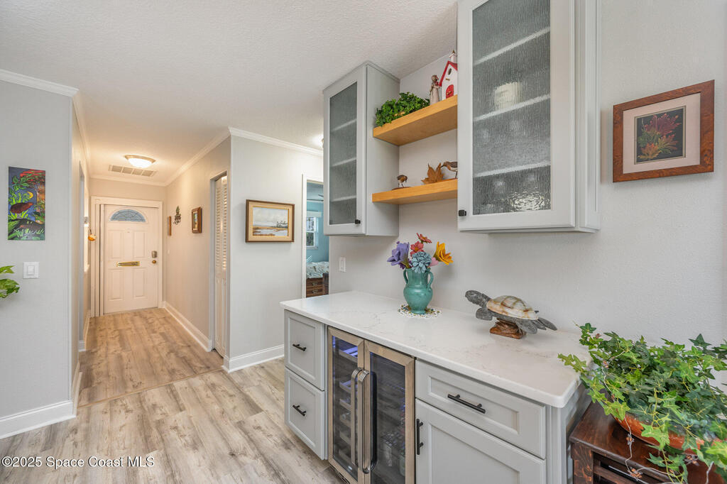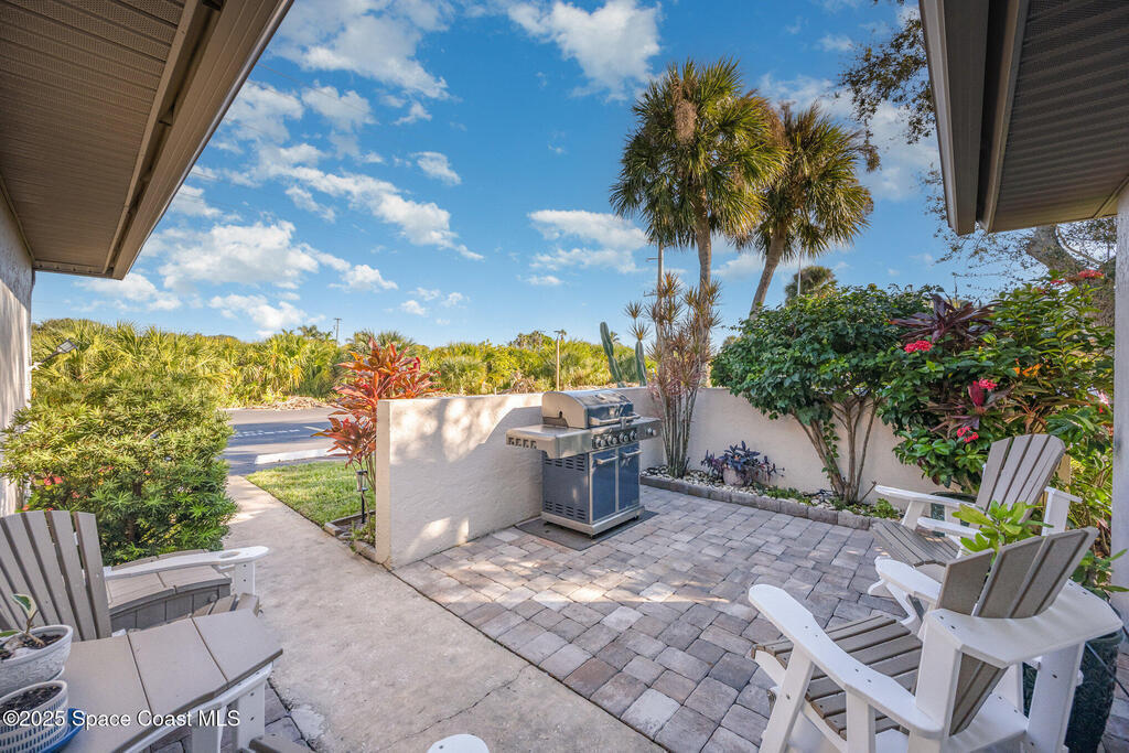 This beautifully remodeled 1-story end-unit waterfront townhome is just blocks from the Atlantic Ocean and includes your assigned boat slip. Flooded with natural light through new impact windows, the interior features new LVP flooring, tile in the guest bath, and a stunning kitchen with quartz countertops, stainless appliances, deep workstation sink with accessories, soft-close cabinetry, marble backsplash, and touch lighting. The dining area offers a wine and beverage bar perfect for entertaining. The owner's en suite includes a designer walk-in closet and double sinks. Additional upgrades include crown molding, faux wood blinds, and fans throughout. Enjoy the paved front courtyard or relax on the paver patio overlooking the Banana River canal or on your XL screened porch. A/C 2019, newer hot water heater, and upgraded electrical panel. Community amenities include pool, pickleball, and tennis. You won't believe it until you see it so make your appt today!