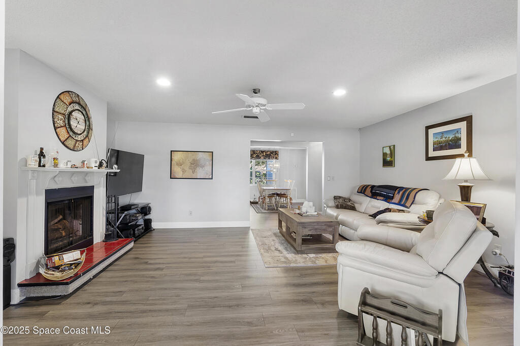 Welcome to this beautifully maintained concrete block home, featuring thoughtful updates and inviting living spaces. Located on a quiet street, in an established and desirable golf course front community. This home features a new roof (2022), luxury vinyl plank floors, fresh paint, kitchen w/ SS appliances and pantry, a sprinkler system on reclaimed water, a 2 car garage and so much more. The entry foyer leads into a formal DR, ideal for gatherings and a spacious LR highlighted by a wood burning fireplace. French doors from the LR lead into a light-filed 10 X 19 Florida room (under air) overlooking the historic Royal Oak Golf Course, creating a serene backdrop for everyday living. The generous primary suite offers a walk in closet, step in shower and ample room to unwind. Split floor plan and home is move in ready! With its blend of character, updates and a picturesque setting this home is ready to welcome its next owner! Close to beaches, KSC, Orlando & theme parks!