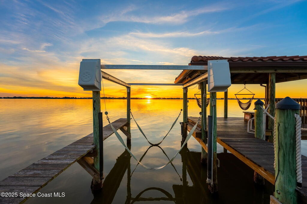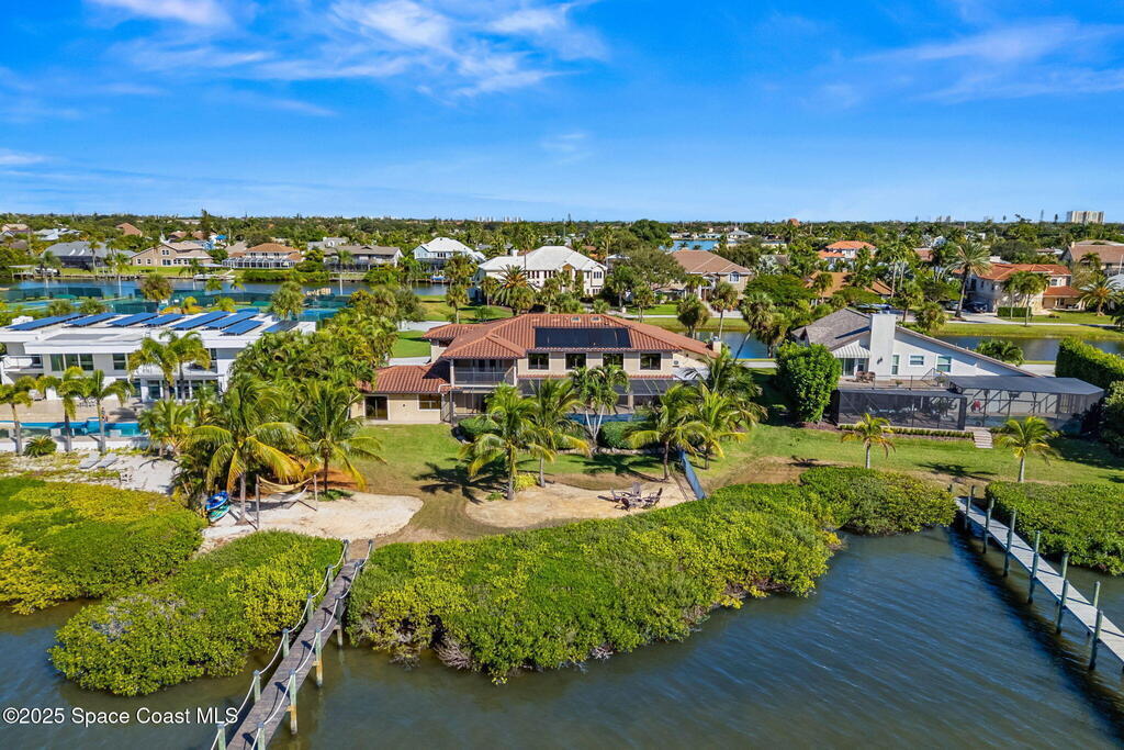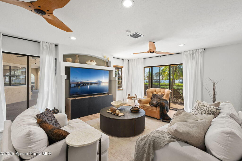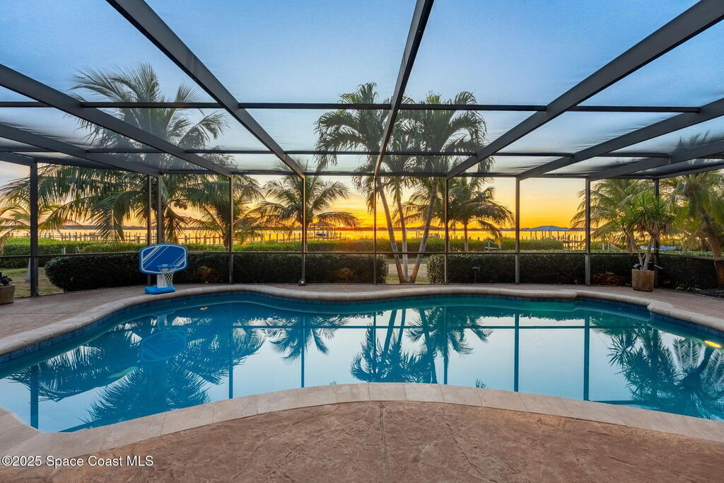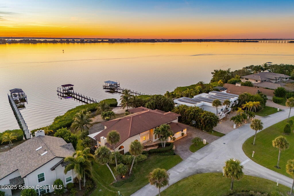 Welcome to a true waterfront retreat on the coveted Tortoise Island, offering 120 feet of direct Banana River frontage, stunning sunsets, and water views the moment you step inside. The home has been tastefully renovated throughout, and nearly every room overlooks the river through expansive windows that fill the interiors with natural light. The main living area features soaring vaulted ceilings and a wall of glass that frames the water from the kitchen, family room, dining area, and more. Upstairs, the primary suite feels like a private escape with its own screened-in balcony, a renovated spa-like bath, and a custom walk-in closet. All bedrooms throughout the home are exceptionally spacious with comfortable layouts and beautiful natural light.The kitchen blends style and function with a large quartz island, modern appliances, a separate butler's pantry and coffee bar, and a wet bar ideal for entertaining.