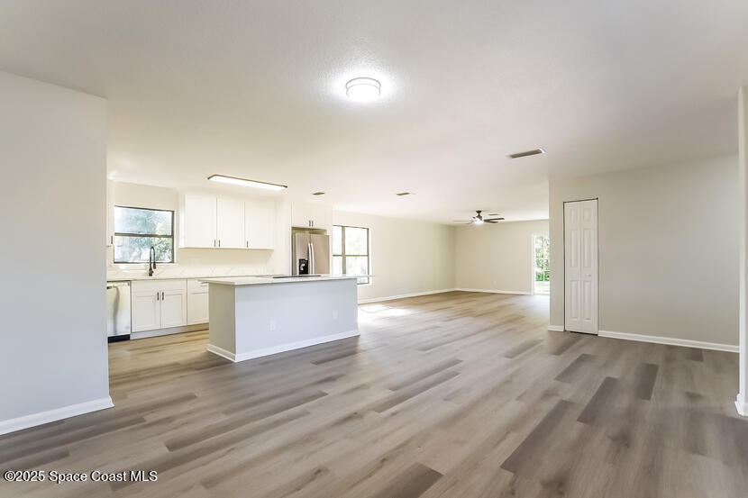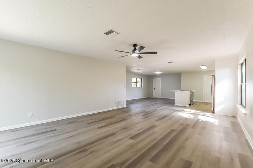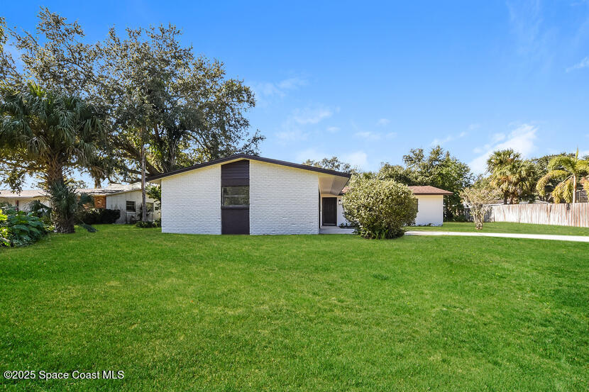 It's time to come home to this beautifully renovated 4 bedroom, 2 bath home in one of Titusville's most desirable neighborhoods! The gently curving driveway and mature landscaping invite you to see what's inside. A wide open floorplan greets you at the front door featuring a fully updated kitchen, expansive dining area and large family room. A wide foyer and short hallway separate the 4 bedrooms and 2 baths from the rest of the house lending privacy and serenity. This home has been thoughtfully updated with fresh interior AND exterior paint, modern light fixtures and fans, and a new HVAC system. The kitchen has been fully remodeled with attractive new cabinets, gleaming stainless appliances, a convenient island cooktop, and handsome quartz countertops. New flooring throughout includes chic luxury vinyl plank in the common areas and lush carpeting in the bedrooms. This is a must-see opportunity. Explore the possibilities!