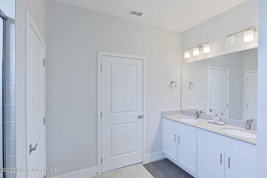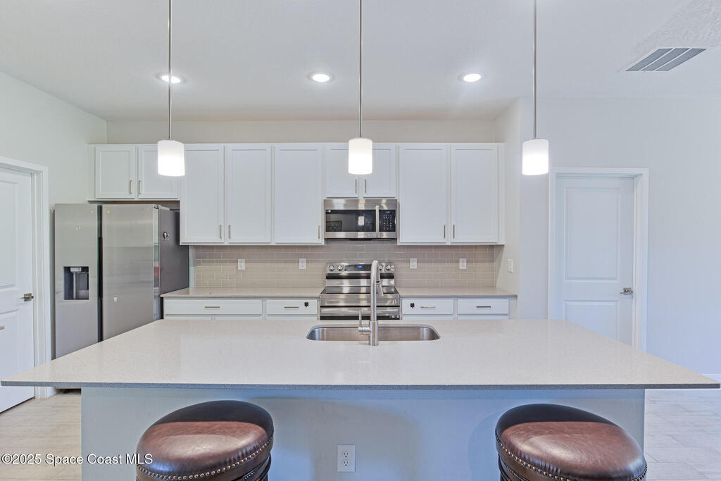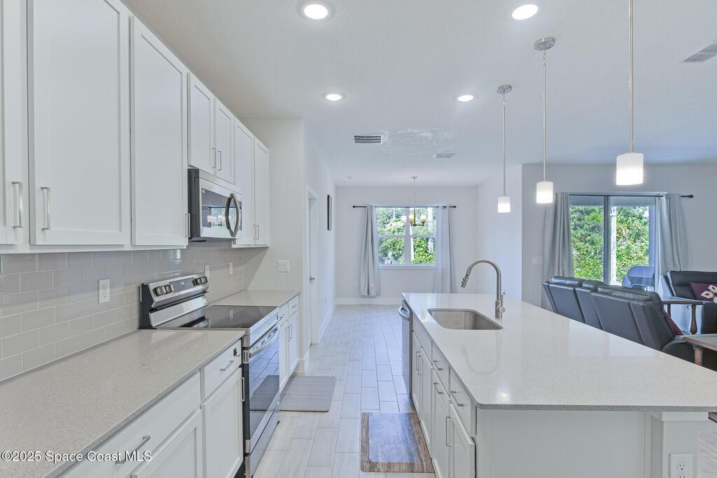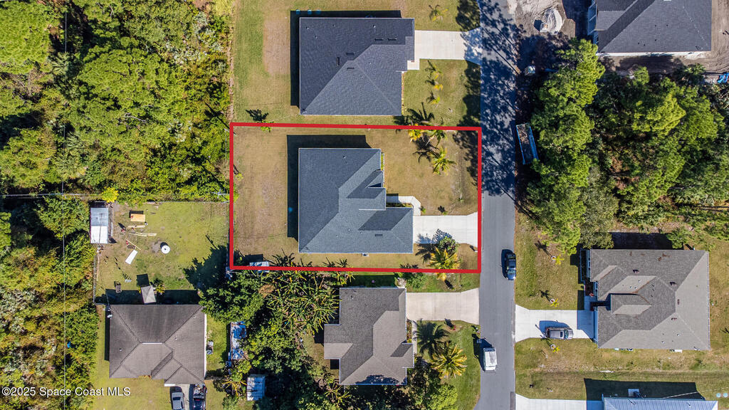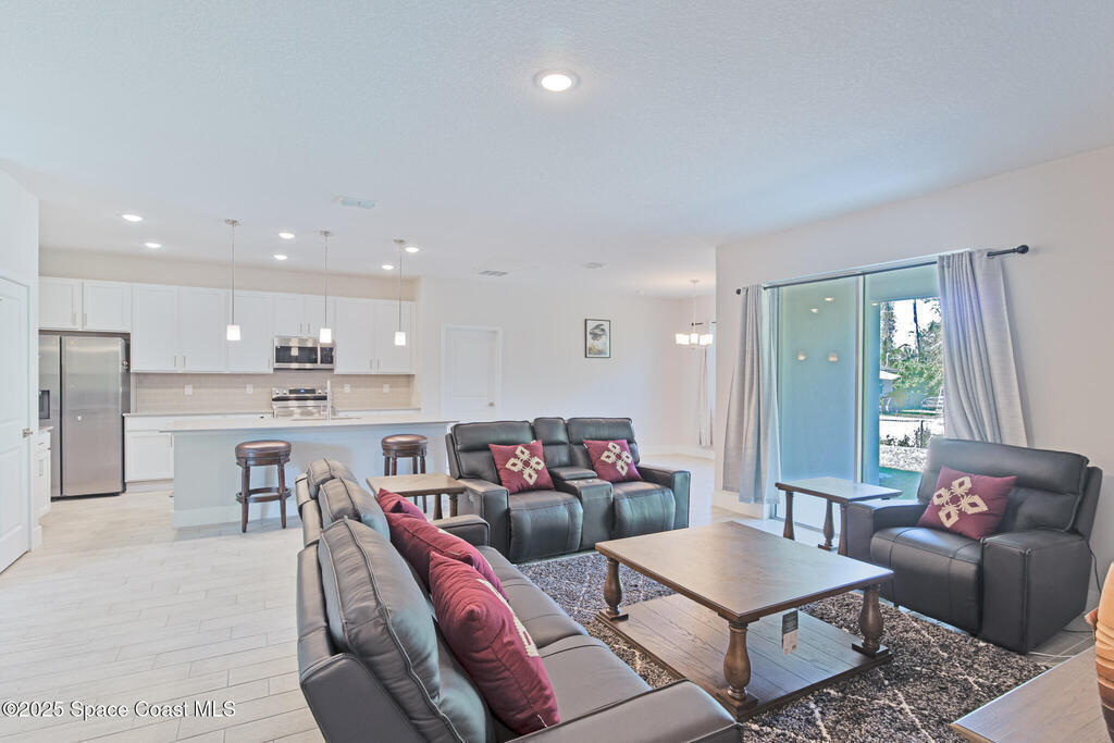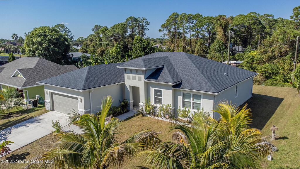 Experience modern Florida living in this brand-new 2023 construction, energy-efficient 3BR/2BA home with huge bonus room in a quiet, desirable area of Palm Bay. This high-quality build offers quartz countertops, luxury tile plank flooring, 42'' hardwood cabinets, LED lighting, and one of the best price-per-square-foot values in Palm Bay. Enjoy an open floor plan with 9'4'' ceilings, a tray ceiling in the master, Energy Star stainless appliances, a 15-16 SEER AC, hybrid water heater, Low-E double-pane windows, and spray foam insulation in exterior walls and the attic for exceptional efficiency and sound reduction. Additional features include a covered lanai, irrigation system, and rain gutters. The elevated lot offers great curb appeal, and the backyard features mature mango and coconut trees for a true tropical touch. Style, efficiency, and value come together in this beautiful home!