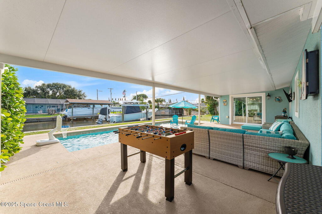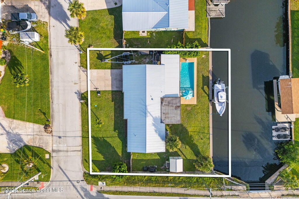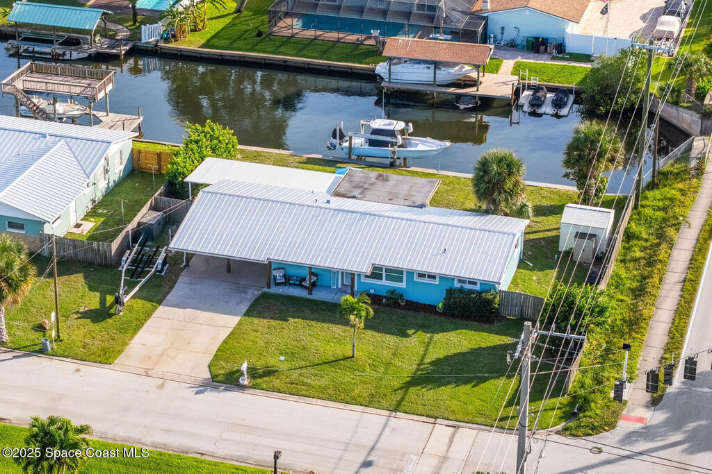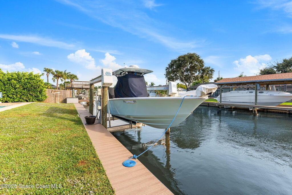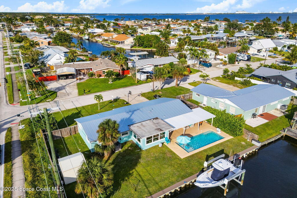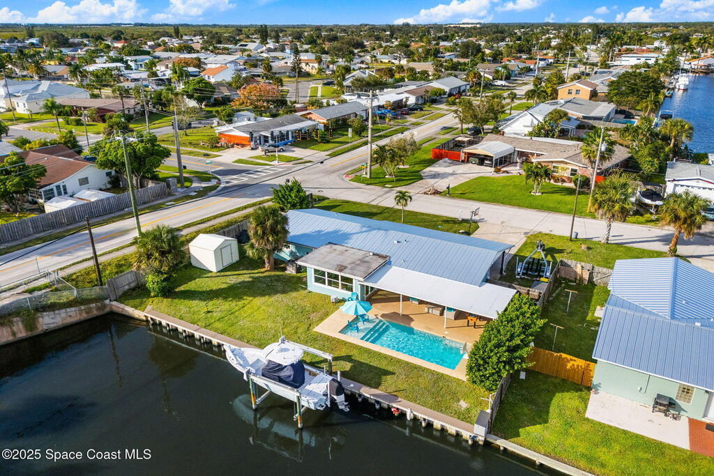 Boater's paradise found on this .24-acre waterfront retreat with direct Banana River access and no bridges to navigate. Positioned on a deep water canal with a 12,000 lb boatlift and a recent 113' vinyl seawall, this home is built for the coastal lifestyle. Inside, enjoy a thoughtfully updated kitchen, bathrooms, and living areas with bright, open spaces including an enclosed dining room with impact-rated windows and slider. Step outside to the newer saltwater pool, perfect for floating, fun, or post-boat relaxation, and entertain with ease on the expanded patio. The fenced backyard includes a shed, landscaping, and space for pets or outdoor games. Key upgrades include a 2023 metal roof, newer A/C, city sewer (no septic), and no HOA. With 4 bedrooms, 2 bathrooms, and seamless indoor-outdoor flow, this home offers effortless waterway living just a short 10-minute boat ride to the Canaveral Locks. A rare gem for boating, fishing, entertaining, and Florida sun lovers. See it today!