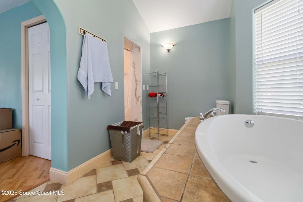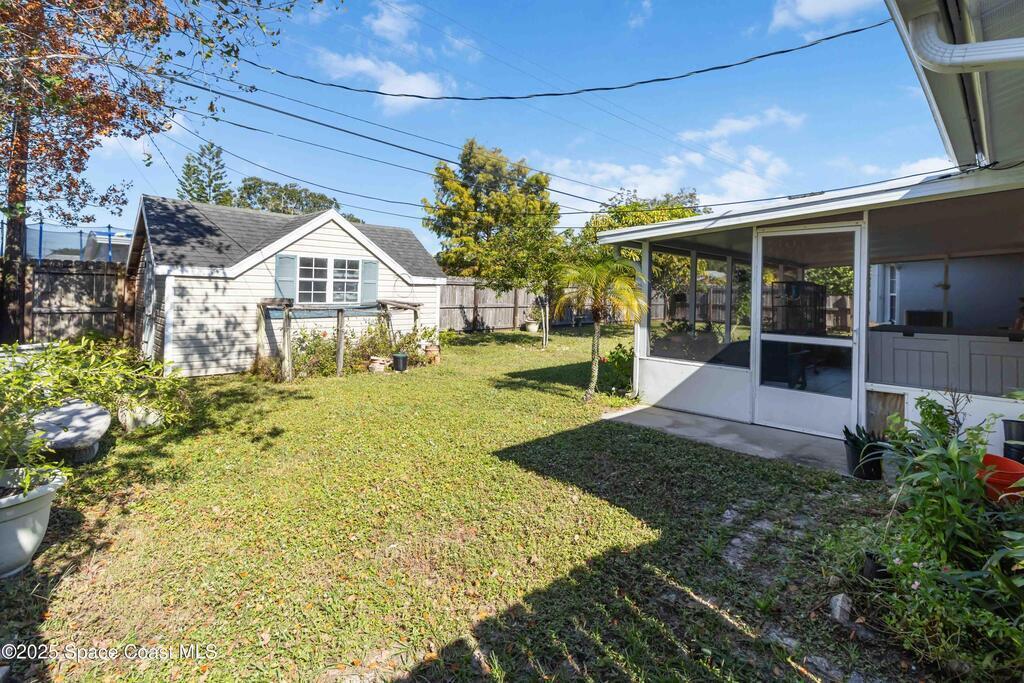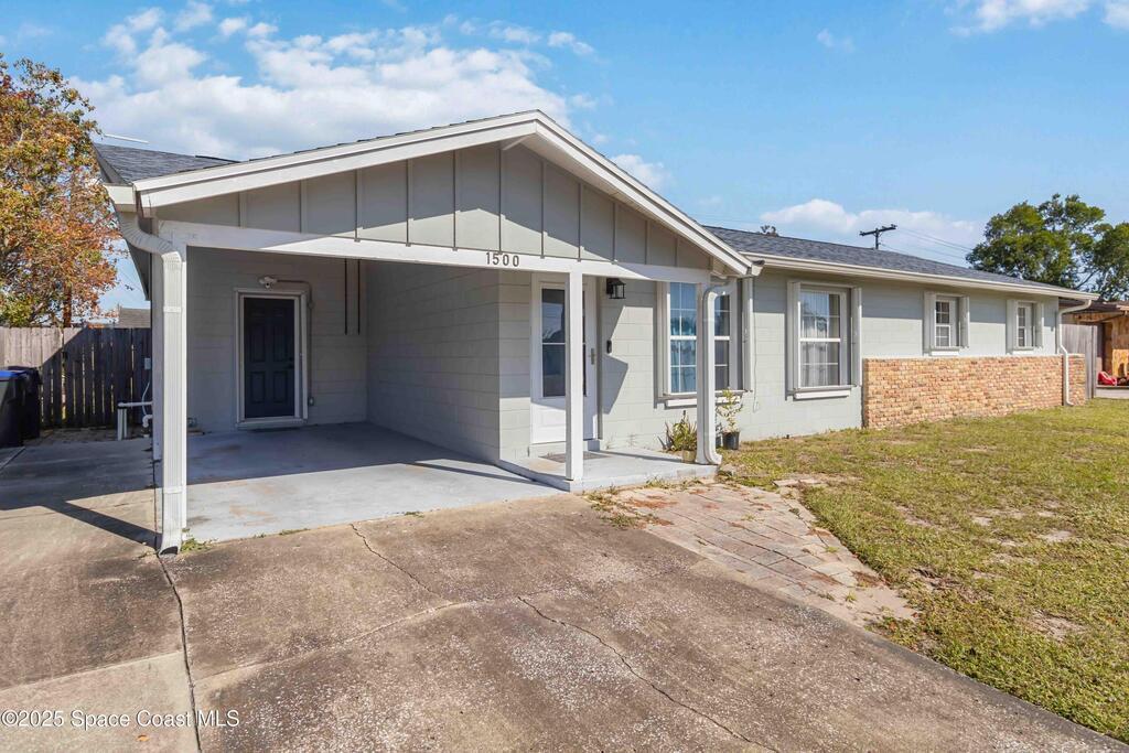 This move-in ready 4-bed, 2-bath Titusville home offers 1,379 square feet of comfortable living. Recent upgrades include a new A/C (2024), full re-pipe (2025), new water heater, accordion shutters on all windows and gutters around the entire roofline for added peace of mind. Built-in archways frame the main living areas, while the kitchen features solid wood cabinets, solid-surface counters, and stainless steel appliances. Laminate flooring runs throughout for a clean, cohesive look. The primary suite includes a large soaking tub and a beautiful remodeled walk-in shower. Step onto the large screened lanai, perfect for relaxing as you overlook the fenced backyard with fruit trees and a storage shed. The home sits near shopping, restaurants, major highways, the Indian River, Kennedy Space Center, and well-loved beaches, offering convenience and a great central location. Mortgage savings may be available for buyers of this listing.
