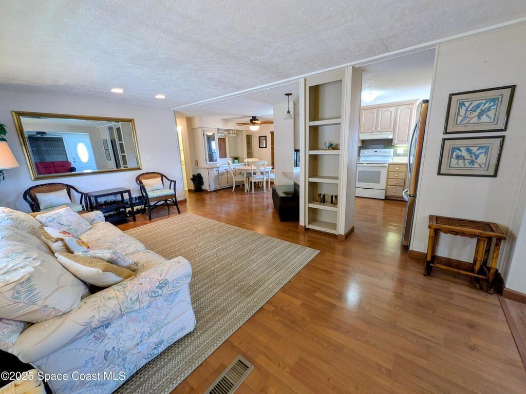 Looking for a sunny escape from brutal winters? This 55+ 2-bed, 2-bath in Leisure Living Estates is the perfect warm-weather retreat - you OWN THE LAND!This home has been well cared for, with major updates already done: a new standing-seam metal roof (2023), new skirting (2023), and a 2020 A/C system. Inside, you'll find no carpeting, updated bathrooms, and tons of built-in storage. The in-unit washer/dryer and the workshop w/ laundry sink & built-in workbench.Parking is a breeze with a carport plus extra driveway space. Even better, it's sold fully furnished, so you can move right in and start soaking up the Florida sunshine.The HOA is just $132/month and covers lawn care, landscaping, basic cable, and internet - a fantastic value.Cast a line from the community fishing pier. Pick fruit from your own banana tree. Walk across the street for deeded beach access, or stop by the community clubhouse for activities and gatherings.