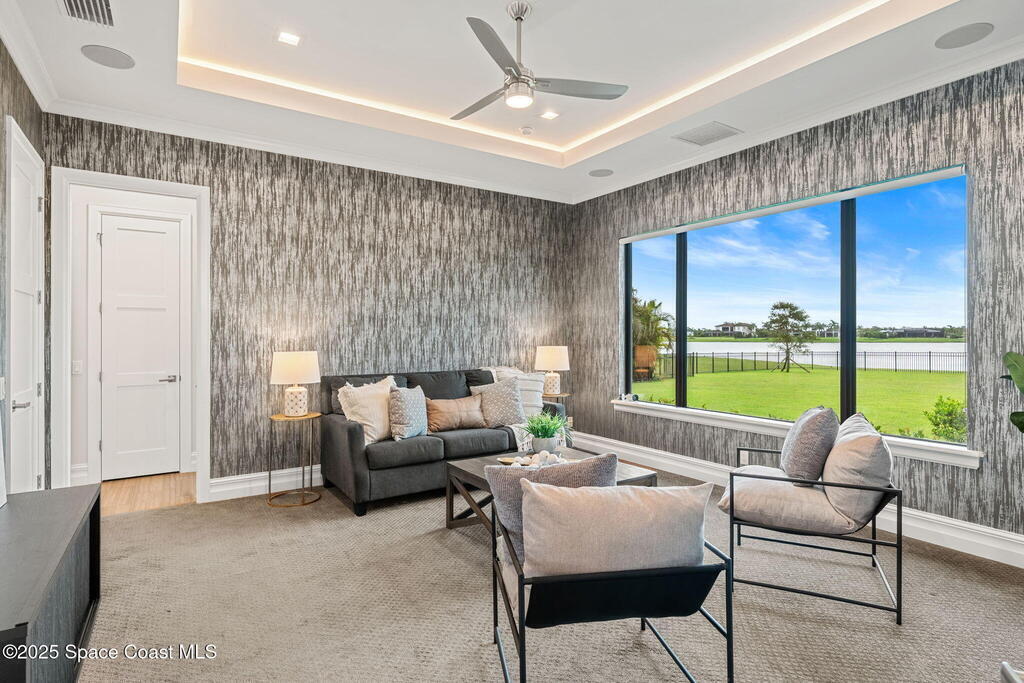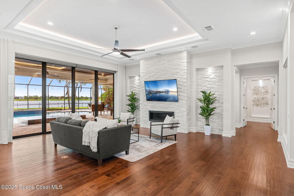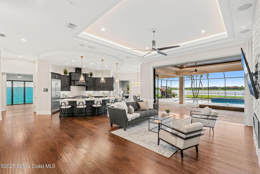 Commanding a premier .83-acre lakefront setting in the gated community of Adelaide, this custom 4-bedroom, 5-bath home offers an extraordinary rental opportunity w/ panoramic water views & refined living throughout. The layout flows effortlessly through a quartz-appointed kitchen, open media room, & gas-lit living spaces that blend seamlessly w/ the outdoors. Sliders retract to reveal a lanai designed for year-round enjoyment, complete w/ a summer kitchen, outdoor dining, multiple lounge zones, & a rooftop water feature that cascades into the spa beside a sculptural fire feature. A 4-car garage, new pool pump, & expansive patio add to the home's appeal. Residents enjoy access to Adelaide's premier amenities, including tennis courts, community dock, recreational lake, jogging paths, playground, & park spaces--perfect for morning runs, lakeside evenings, or weekend games at the court.