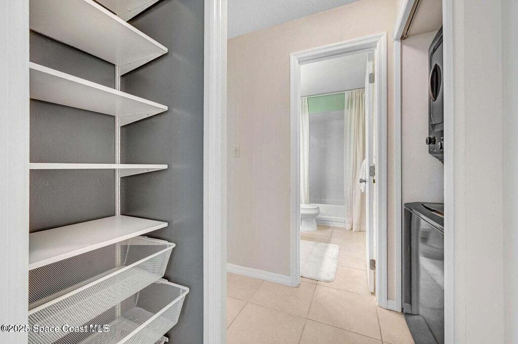 Welcome to this open and airy second floor end unit which is one of the most spacious and inviting floor plans in the entire complex. Originally designed as a three bedroom, two bath, this thoughtfully reimagined two bedroom, two bath layout offers an expansive living area, being ideal for entertaining or simply enjoying the extra breathing room. Step inside to find an interior that has been tastefully updated with east facing plantation shutters, cool and easy-to-maintain tile flooring throughout and a modern kitchen featuring sleek S/S appliances, gleaming granite counter tops and elegant white cabinetry. Both bathrooms carry the same clean and classic fixtures and cabinetry, creating a cohesive and refined look throughout the home. The stackable W/D are tucked away for easy access. This end unit offers natural light flooding in from multiple angles, offering a sense of openness and tranquility. Community pool/spa. 1 car carport and additional assigned parking. See addit. remarks.