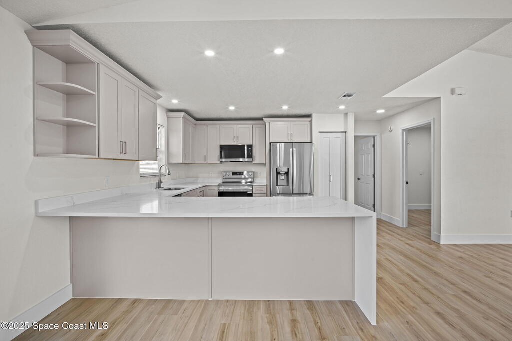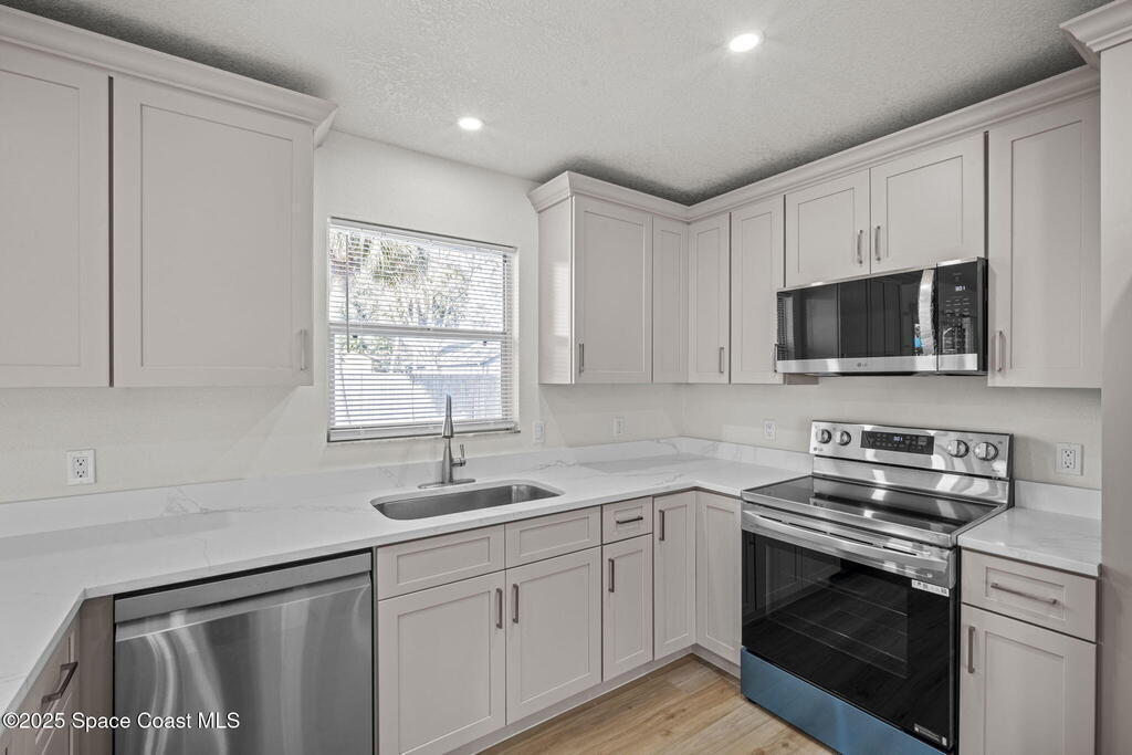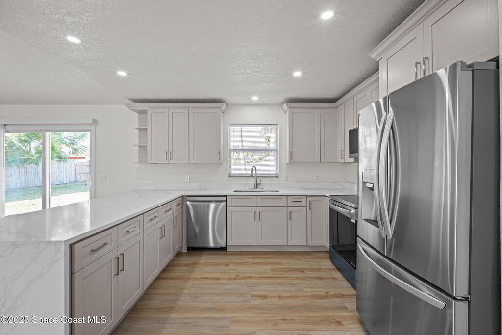 Bright, open, and beautifully updated 3 bed, 2 bath split-floor-plan home in Port St. John! This move-in-ready home features fresh interior updates throughout, including new flooring, trim, paint, lighting, fans, blinds, and interior/exterior doors. The airy living area flows into a fully renovated modern kitchen with solid wood soft-close cabinetry, quartz countertops with a waterfall edge, new LG stainless appliances, and updated kitchen fixtures. Both bathrooms have been tastefully refreshed with new vanities, sinks, toilets, lighting, updated fixtures, and a brand-new master shower. All closets and the laundry room feature new shelving with new washer/dryer hookups. Outside, enjoy a spacious backyard with a new 20' x 10' concrete pad perfect for entertaining, relaxing, or outdoor dining. Additional updates include a new AC in 2024, roof only 5 years old, and an updated electrical panel in 2019, giving peace of mind and modern comfort. Stylish, bright, and completely move-in ready.