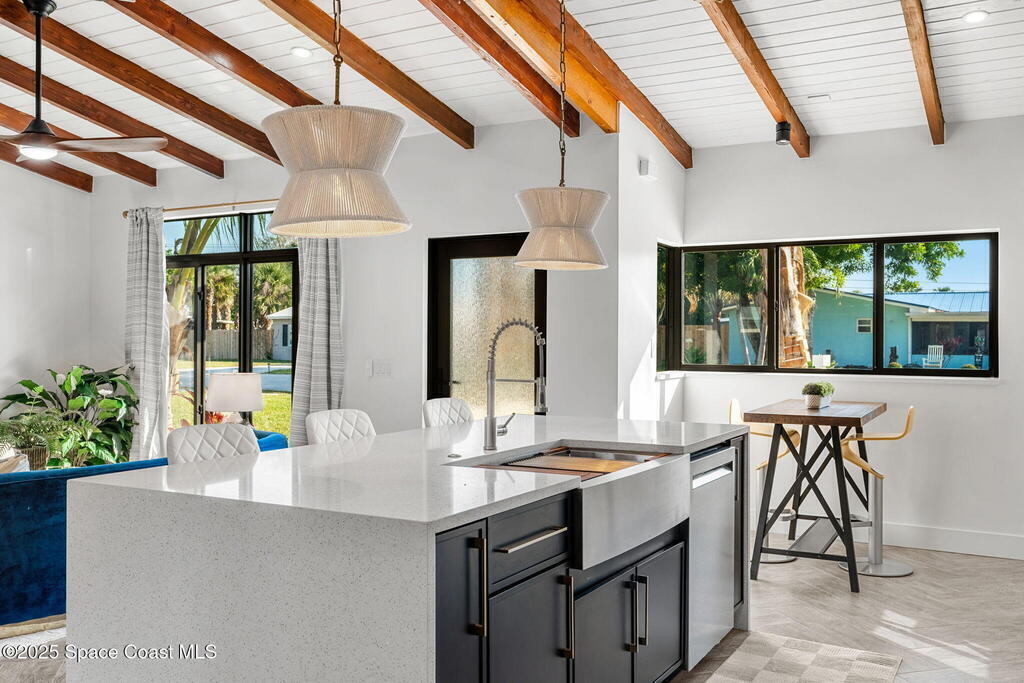 REDUCED TO SELL! Better than NEW CONSTRUCTION-walking distance to the beach! Beachside's finest renovation featuring a covered entry with its warm open beam ceilings, rich woodwork, authentic Florida Keys coral rock accents and rain glass adorned French door. Craftsmanship and finishes complement the completely redesigned floor plan. Vaulted ceilings, exposed beams, chef's kitchen featuring a gas 36''cooktop, huge island, waterfall quartz counter tops, breakfast nook. Brightly lit living room by oversized windows. The dining area has a view thru the French doors of the outdoor entertainment area. Elaborate master suite includes a seating area, volume ceilings, built ins, and LED lighting. Luxurious master bathroom w/ a large rain shower and soaking tub under the featured ''cruise ship'' window. The outdoor entertainment area is surrounded by tropical landscaping. Plus new plumbing, electric, salt resistant metal roof, impact windows, irrigation system, extensive landscaping +more