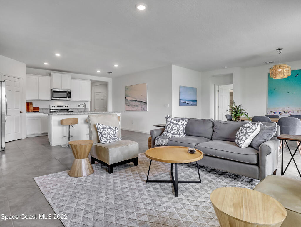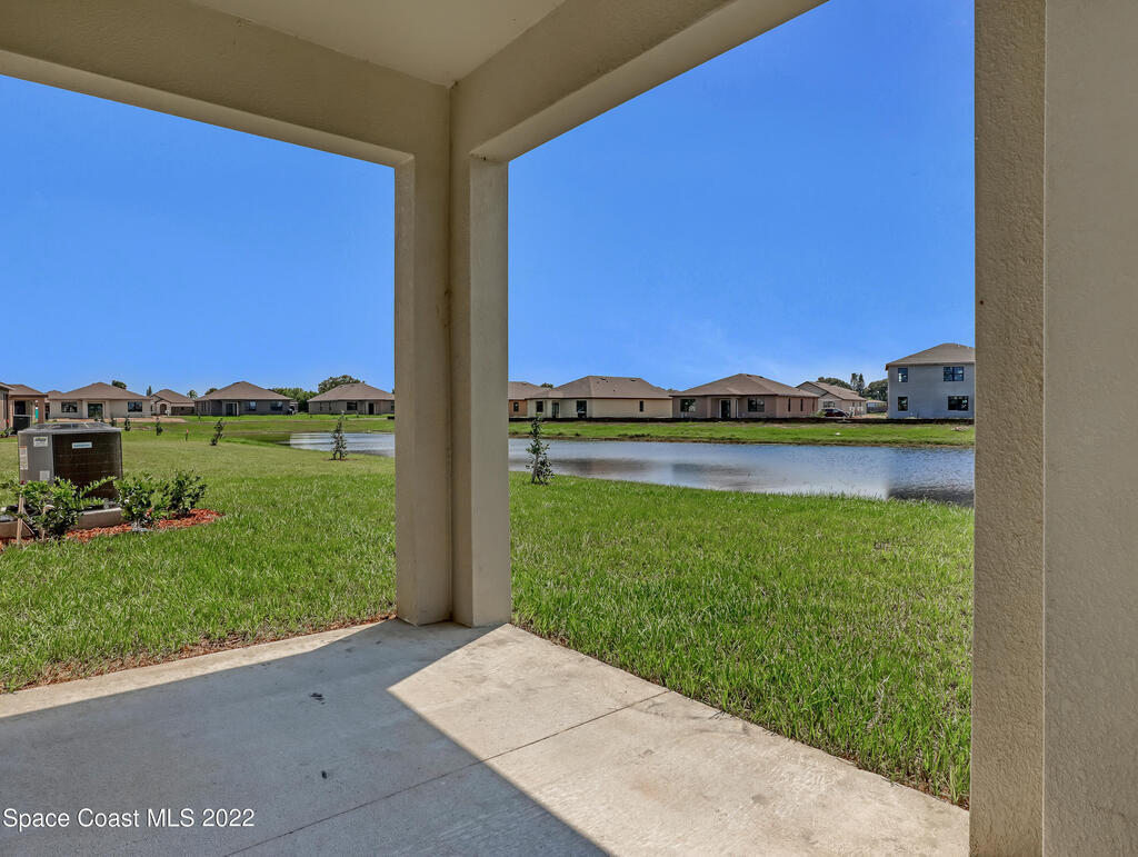 Fully furnished! This newer luxury home has 4 bedrooms and 2 full bathrooms. You can sit on the back patio and enjoy the water view or be first to use the brand-new luxurious amenities. Included is access to resort style pool, gym, volleyball, pickleball and gorgeous clubhouse with gaming tables and kitchen. Perfect place to host a party. The home comes fully furnished and ready for you to enjoy with a cozy beachy vibe. Perfect 2000 sq feet one level layout with huge open concept kitchen, granite countertops, stainless steel appliances, massive walk-in pantry, and large island with seating. Front bedroom currently used as office. The primary bedroom has a king bed, gorgeous ensuite with 2 huge closets. The other 2 bedrooms have a double bed and two twin beds. This newly constructed gated community is located close to L3Harris, excellent beaches, restaurants, public fishing, marina, surfing, and shopping. Outdoor pool and other community amenities. Rent includes landscaping.