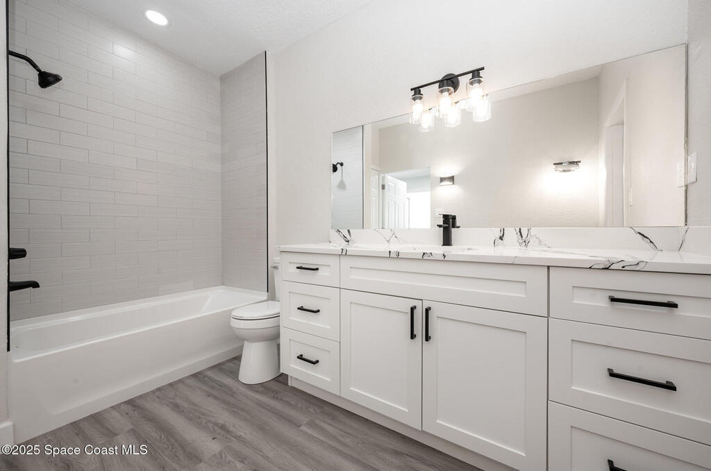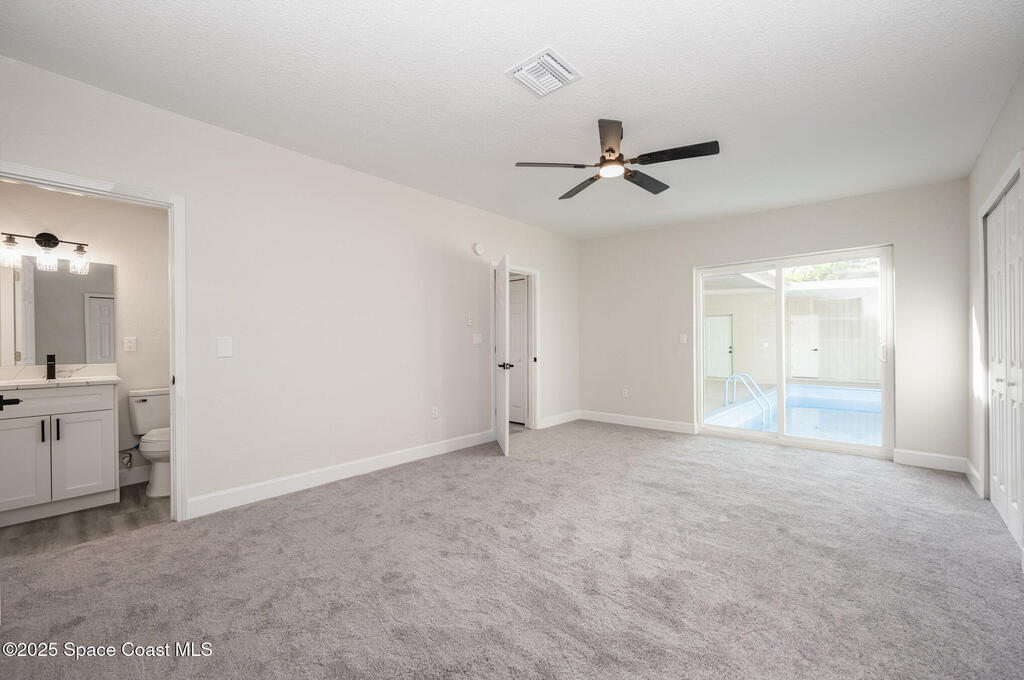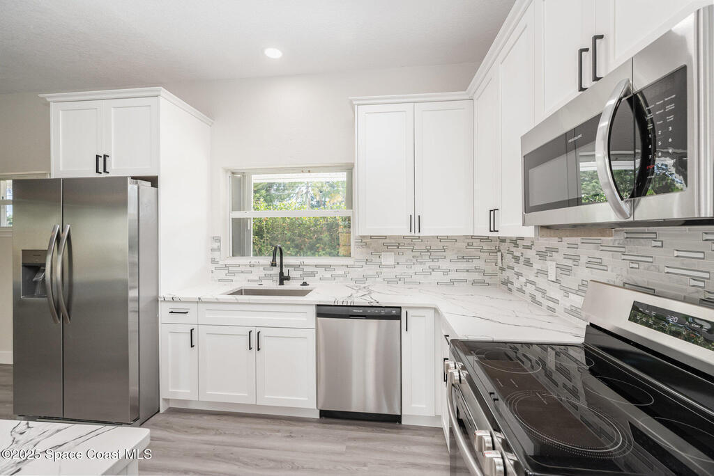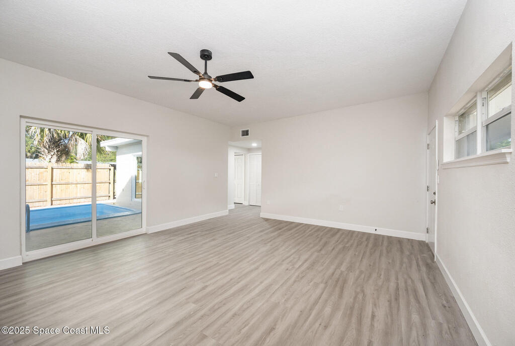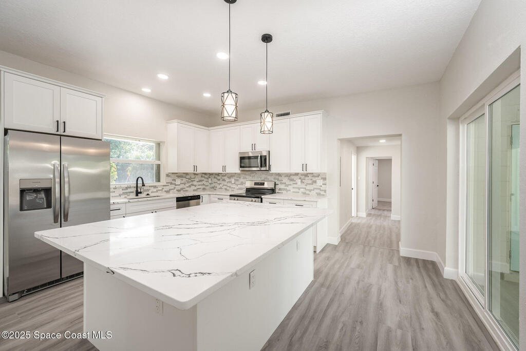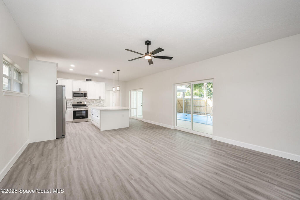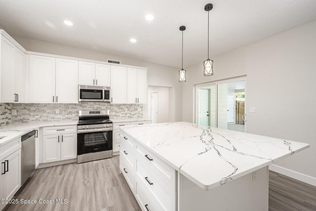 This beautifully renovated pool home is ideal for a large or extended family. This property also has short term rental possibilities! Completely updated and freshly painted, it offers true move-in-ready condition. Upgrades include a brand-new roof, four new sliders, two new air conditioners, two new water heaters, two new circuit panels, Frigidaire stainless steel appliances, new kitchen cabinets with quartz countertops, matching bathroom vanities, two new tubs, and a renovated shower. Additional improvements include new ceiling fans, recessed lighting, and new laminate flooring with new carpet in all bedrooms. The home features a split plan with two bedrooms on one side and three on the other, centered around a beautiful kitchen open to the living room. The pool is accessible from the primary bedroom, fifth bedroom, and living room. Laundry and an additional 1/2 bath are conveniently located on the pool deck. A separate driveway and entrance on Bouganvillea Dr. adds extra flexibility