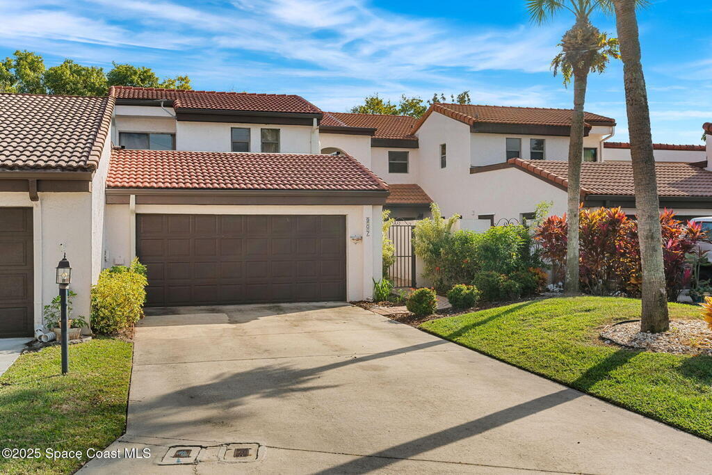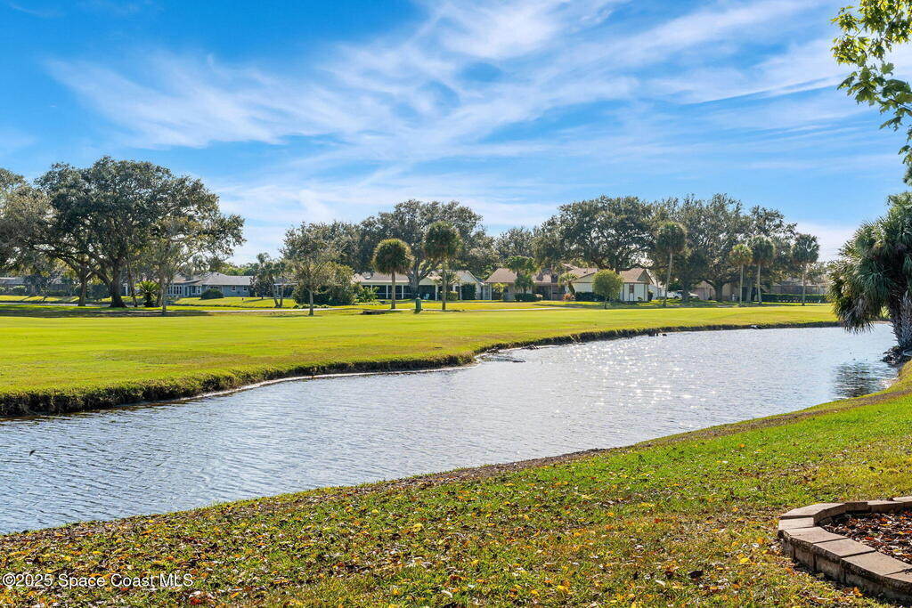 Spectacular lake, golf course, and tree-lined views! A welcoming paver courtyard leads into this bright 2-bed, 3-bath home, filled with natural light, vaulted ceilings, and a 4-panel sliding door that opens to the patio and stunning vistas. The refreshed kitchen features granite counters, single-tub sink, subway tile, newer SS appliances, and space for a cozy breakfast table. Enjoy peace of mind with a 2023 A/C and 2022 roof. The spacious primary suite offers panoramic views, a private slider to the deck, a large walk-in closet, dual sinks, and separate tub and shower. The beautiful community includes a large pool and private path to Suntree Country Club. Ideal location close to restaurants, shopping, schools, river, beaches, and I-95.