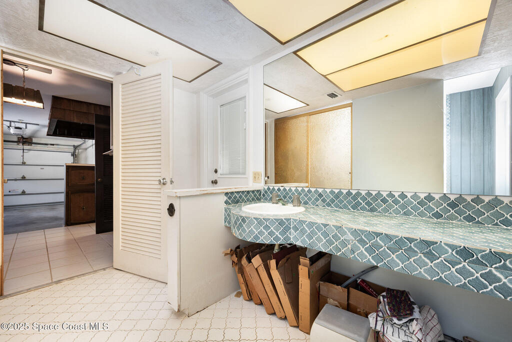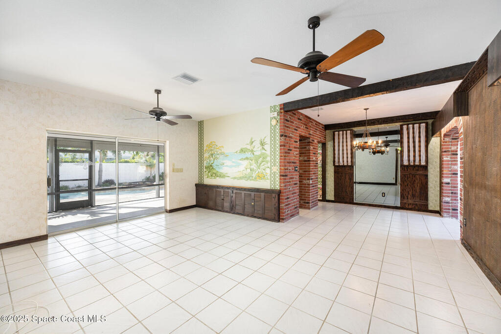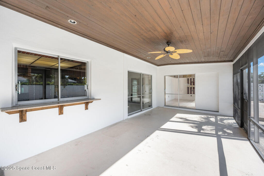 ONE-OWNER LEGACY HOME | MASSIVE 50-FT POOL | DUAL ENSUITES This 2-bed/3-bath pool home (easily converted back to a 3-bed) is situated in the Cresthaven subdivision of Satellite Beach, directly across A1A from Pelican Beach Park. The showstopper is a sparkling 50-ft pool (max depth of 8.5 ft) surrounded by a landscaped deck and concrete block privacy fence. A full pool bath for convenience. Roll-down shutters (partially electric) give you total peace of mind. Interior features include foyer, an open, light-filled layout with distinct living and dining areas. The kitchen features granite countertops, double ovens, and large pass thru window to the pool patio. The 1-car garage is under air and included in the living square footage ideal for a workshop, gym, or climate-controlled storage. Lovingly maintained by one owner since construction, this solid concrete block residence is a blank canvas ready for your modern vision or move-in ready for those who appreciate retro charm. See More