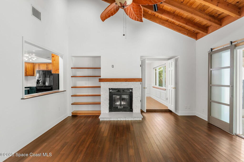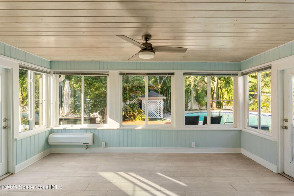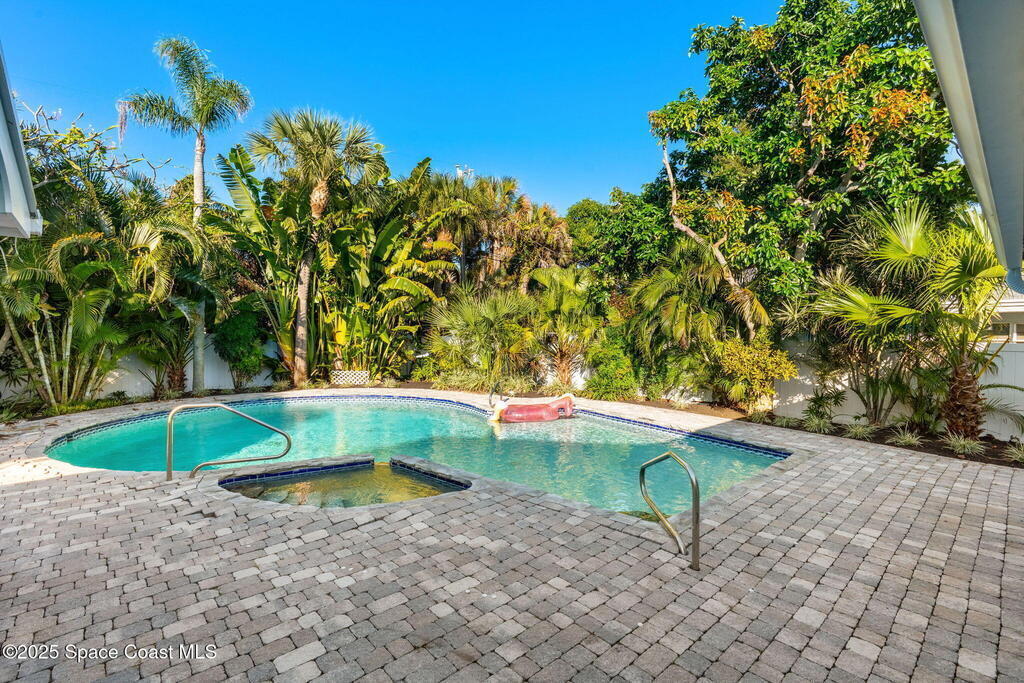 Nestled South of Fifth Ave and just one block from the beach, this blissful beachside cottage features a brand-new standing seam metal roof, impact windows, and a private backyard pool retreat surrounded by lush, tropical landscaping. Inside, charm fills every corner with a double-sided fireplace connecting the formal dining and living rooms, with wainscoting accents in the dining, and the living crowned by a vaulted tongue-and-groove ceiling and warm wood beams. The cozy kitchen offers wood cabinetry, quartz countertops, a double oven, and a built-in breakfast nook. Take your coffee in the Florida room, or relax in your fully fenced private paradise with a poolside deck perfect for unwinding. An indoor laundry room, half bath, and ample storage embody life's simple luxuries and everyday convenience, while the generous, oversized garage is ideal for storing surfboards, beach gear, a golf cart and more. Minutes to dining, shopping, the beach and Orlando Park for easy coastal living.