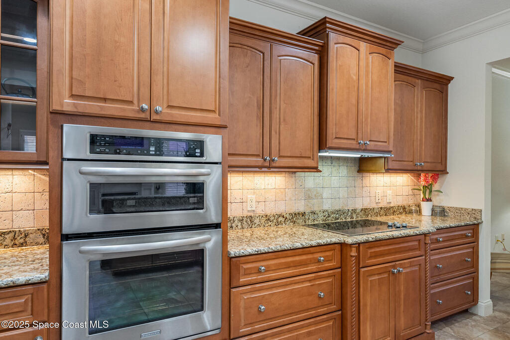 Located within the prestigious Enclave at Three Hundred, this luxury villa offers premier coastal living in a gated community of just 24 residences, situated three blocks from downtown Cocoa Beach and directly across from the ocean. With 3,463 SF under air (4,461 SF total), this home has 4 bedrooms (or 3 plus a media/office room), 3 baths, & a 3-car garage. A private courtyard entrance with an elegant fountain sets the tone as you step inside to soaring 20-foot vaulted ceilings in the main living areas (9'+ ceilings throughout) with abundant natural light, and elegant details including crown molding, recessed lighting, and a dramatic curved banister staircase. The heart of the home is the designer kitchen, beautifully appointed with tall all-wood cabinetry, granite countertops, stainless steel appliances, under-cabinet lighting, and a breakfast bar overlooking two generous living areas. A gas fireplace enhances the warm coastal ambiance, creating an inviting setting for both everyday