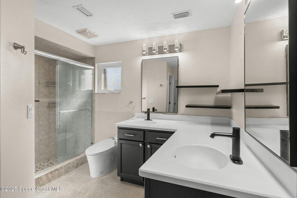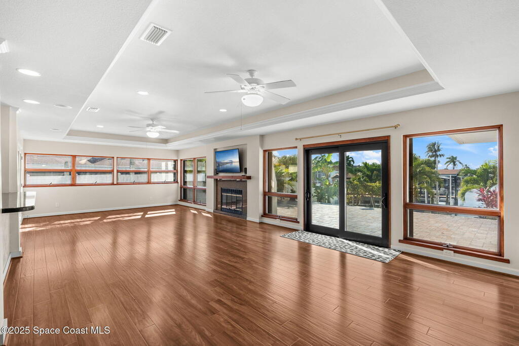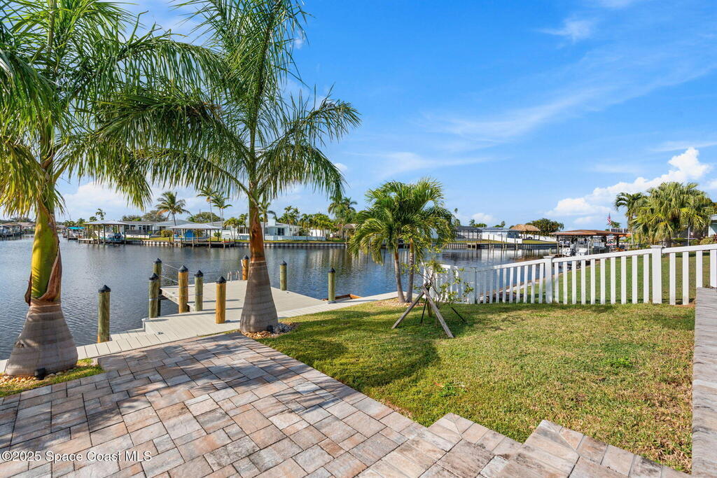 Tucked at the end of a quiet cul-de-sac at the very back of Diana Shores, this canalfront home delivers unbeatable down-the-water views, dreamy sunsets, and direct access to Sykes Creek. Set on one of the widest canals with plenty of room to turn a boat, the home is loaded with upgrades: 8 hurricane-rated windows, whole-house accordion shutters (2022), impact garage door (2023), and an 82' vinyl seawall with composite dock, jet ski lift, and kayak platform (2021). Entertain outdoors on the pavered patio, with a prewired and reinforced middle pad for a hot tub. Inside, enjoy a bright, open split floorplan with travertine and LVP flooring, a remodeled kitchen with gas range, indoor laundry, wood-burning fireplace--and no cast iron plumbing. A metal roof, newer electric panels, tankless gas water heater, privacy fencing, and high-end water filtration system round out the list. Tucked away yet close to 528 and the beach, this is where everyday comfort meets the Space Coast lifestyle.
