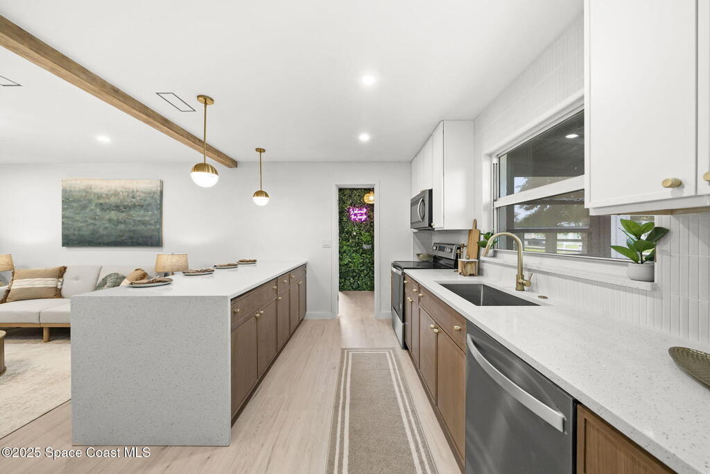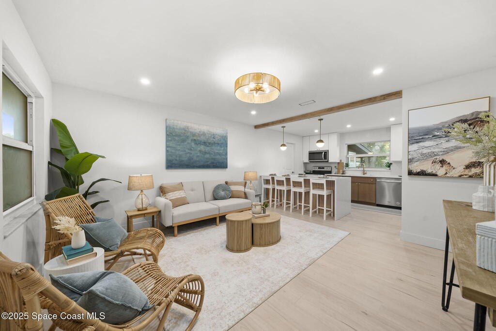 Welcome to this adorable, fully renovated home in a highly sought-after Palm Bay neighborhood! This 2-bedroom, 1.5-bath gem sits on a spacious corner lot with a large yard, perfect for outdoor enjoyment. Inside, the heart of the home is the stunning kitchen featuring a waterfall island, modern finishes, and plenty of space to cook and gather. Peace of mind comes with major updates already done for you--new roof, newer A/C and water heater, impact windows, and freshly painted exterior. Every detail has been thoughtfully designed to combine style with functionality. Whether you're a first-time buyer, downsizing, or looking for the perfect Florida retreat, this home offers the charm, upgrades, and location you've been waiting for!