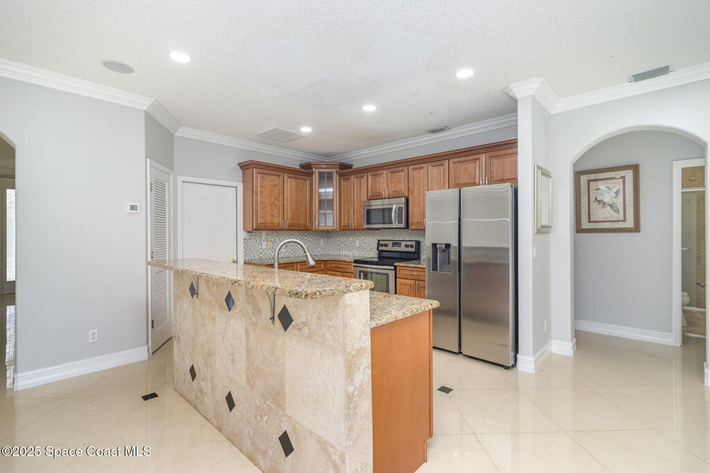 Beautifully upgraded 5-bedroom, 3-bath two-story home on a desirable corner lot in Hammock Lakes East, formerly the model home. Downstairs features a bright living room, spacious family room, upgraded kitchen, and a guest bedroom with full bath. Upstairs offers 4 bedrooms including a large master suite with walk-in closet, double vanity, garden tub, and separate shower, plus a roomy common area, perfect for study, media, music room, or a even a gym!Home boasts Italian porcelain tile, wood floors, custom solid-wood kitchen cabinets, granite countertops, and crown molding throughout--no carpet. Additional upgrades include electronic roll-up storm shutters, solar panels for near-zero electric bills, and a 2018 roof. Large screened back porch, and a fully fenced-in backyard, which is lined with tropical fruit trees such as sugar apple, banana, and mango. A move-in-ready home with exceptional detail and craftsmanship.