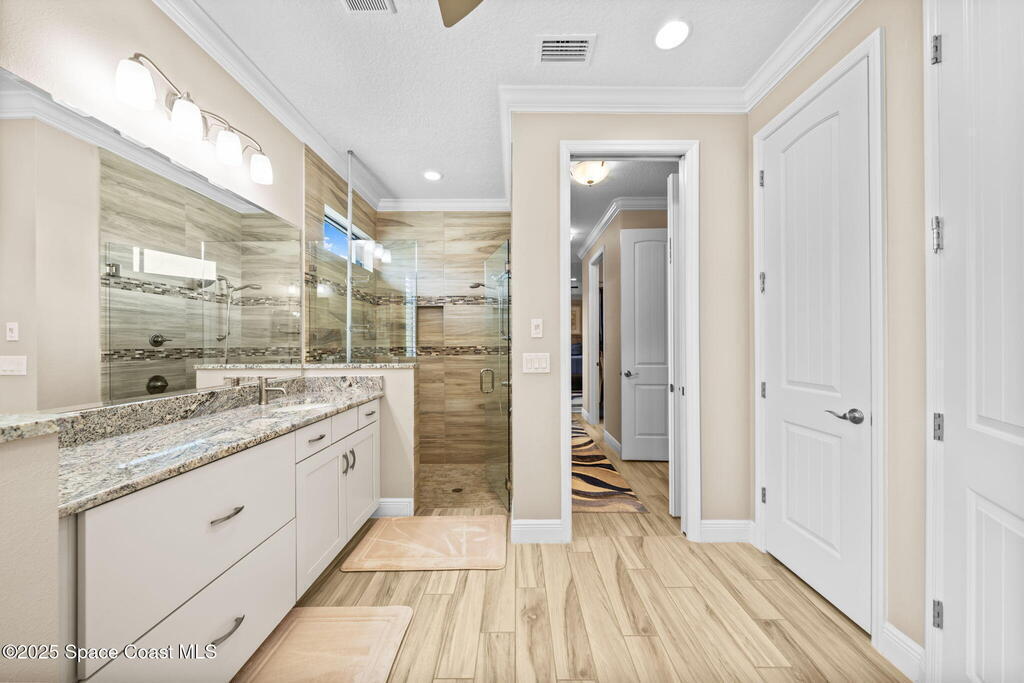 RARE FIND! Experience luxury, lakeside living in the heart of Viera's sought-after Kerrington community. This stunning 4-bedroom, 3-bath Montgomery floor plan offers 2,798 sq. ft. of beautifully designed living space on an expansive 0.35-acre lot, showcasing peaceful wide lake views and an elevated level of finish rarely found.Step inside to find beautiful plank tile flooring throughout most of the home, engineered hardwood in the office, elegant crown molding throughout, recessed lighting, and thoughtfully curated upgrades at every turn. The chef's kitchen impresses with upgraded granite countertops, white soft-close cabinetry, under-cabinet lighting, and an open layout perfect for entertaining.The split floor plan offers spacious bedrooms, generous storage, and a large utility room (washer & dryer included). Additional enhancements include impact windows with tinting, a Generac whole-house gas generator, speaker system, Ring doorbell and cameras, ceiling fans throughout, ...