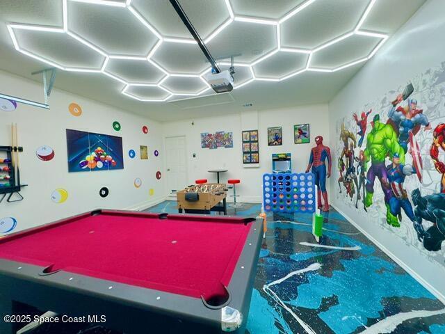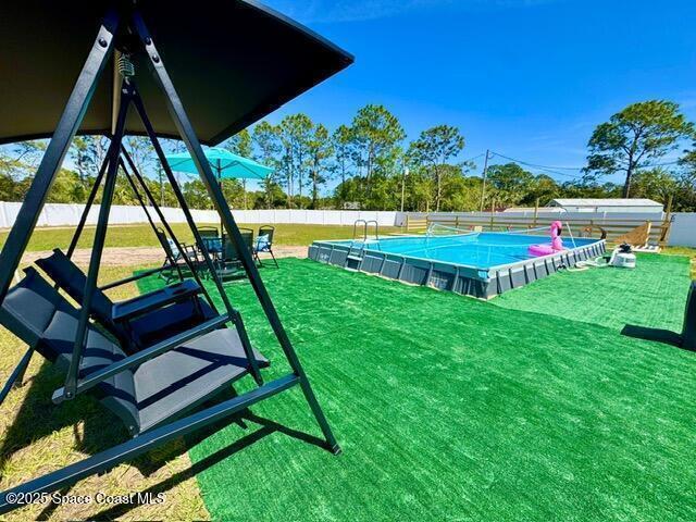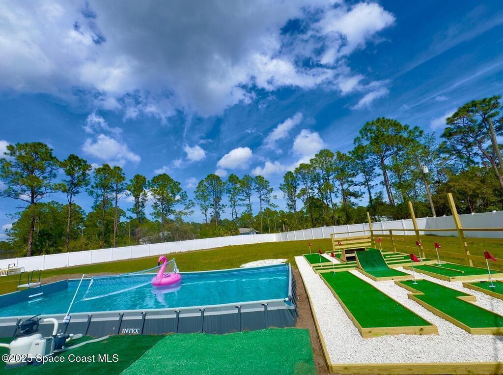 Stunning 2024 new-construction block home with 1,828 sq ft, 4 bedrooms and 2 bathrooms, plus an extra lot included in the sale. .92 Acres of land with main house and lot. Home features an open floor plan, large kitchen island, 36'' white cabinets, quartz countertops, walk-in pantry, stainless appliances, and reverse osmosis at the kitchen sink. Tile in main areas, carpet in bedrooms, and a split-bedroom layout. Primary suite offers an oversized walk-in closet and large linen closet. Garage is converted to an A/C game room with insulated door. Huge fenced backyard with second driveway ideal for RV parking, submerged above-ground pool, and a custom 9-hole mini golf course. Exterior includes vinyl fencing and a trussed covered lanai. Currently used as a successful short-term rental/Airbnb. A rare opportunity with modern 2024 construction and exceptional outdoor amenities.