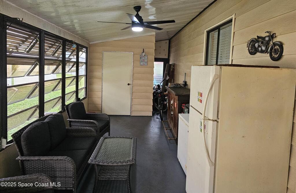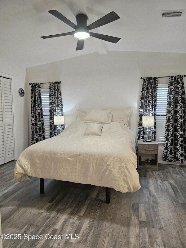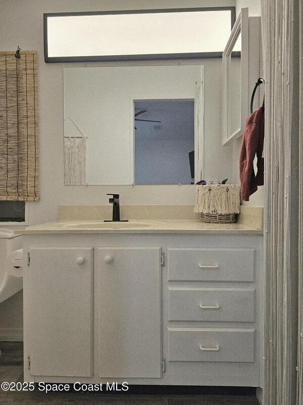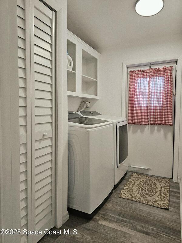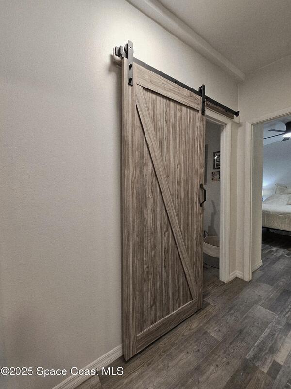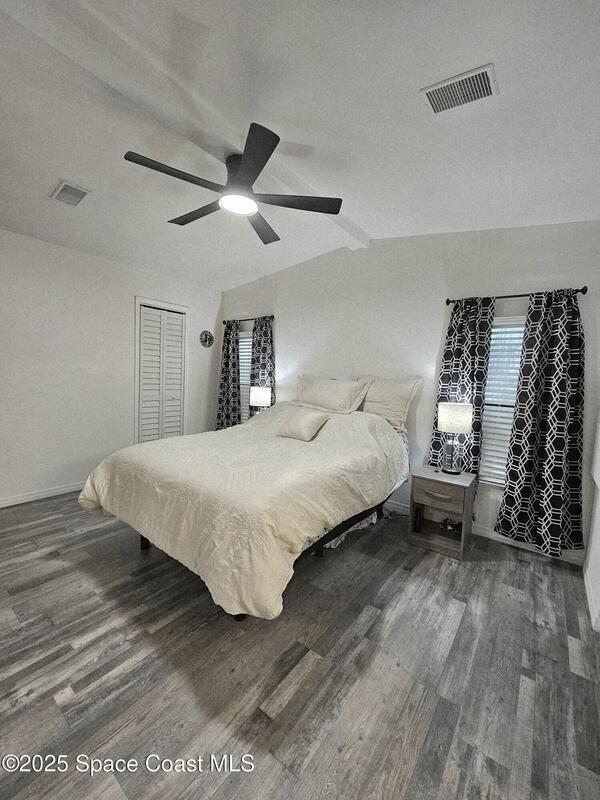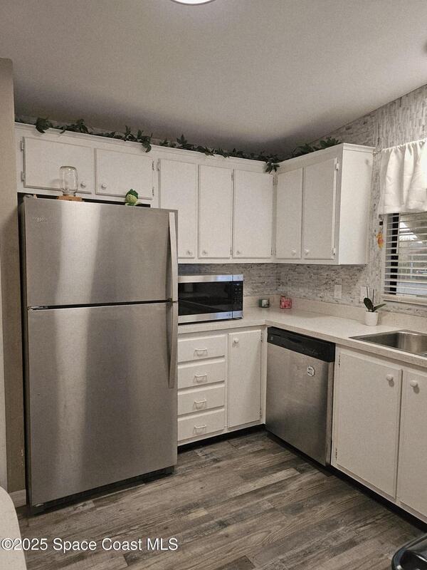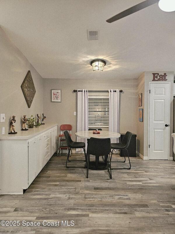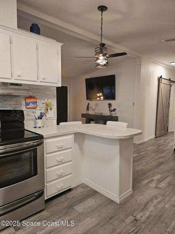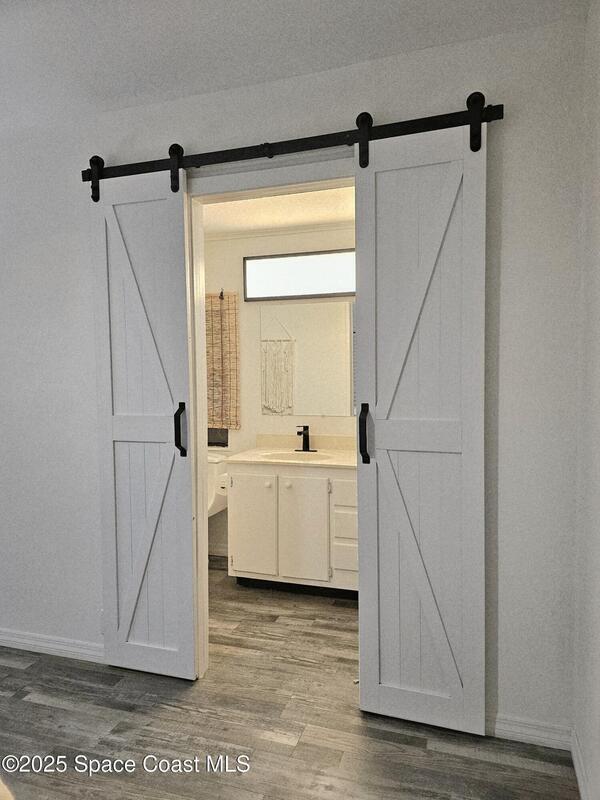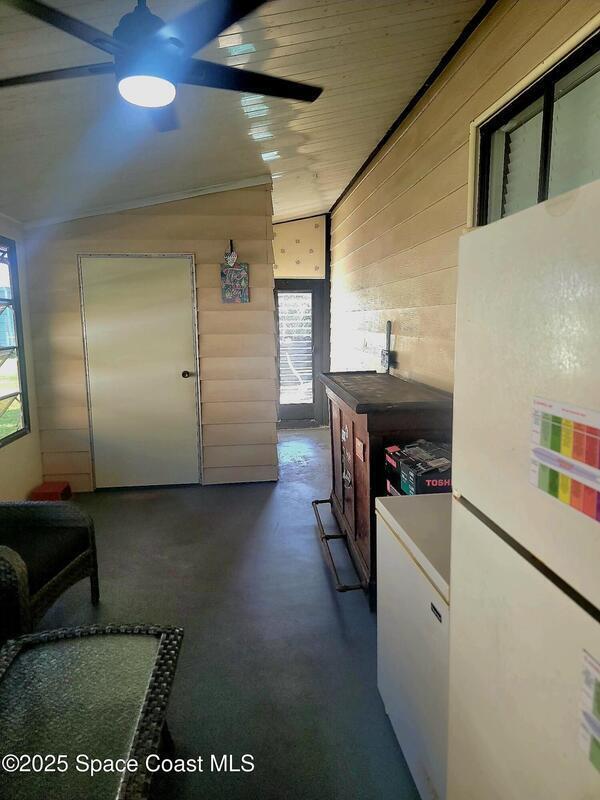 Beautifully updated home in 55+ community where you own your land- no outdated paneling or wallpaper here! Enjoy new drywall, upgraded electrical, modern light fixtures, ceiling fans, barn doors, and fresh paint throughout. The wood-plank flooring adds warmth and character to every room. The kitchen with stainless-steel appliances, tile back-splash and a breakfast bar that opens seamlessly to the dining area and living room. The guest bath has been completely refreshed with a new vanity, toilet, and shower. The spacious lanai offers screened windows, a second refrigerator, and a deep freezer, giving you extra room to relax or entertain. A dedicated workshop with utility sink provides additional storage and direct access to both the backyard and lanai. There is a breezeway that connects the lanai to the fenced backyard, complete with an 8x10 shed for even more storage. Roof 2023, hot water heater 2020, HVAC 2025.
