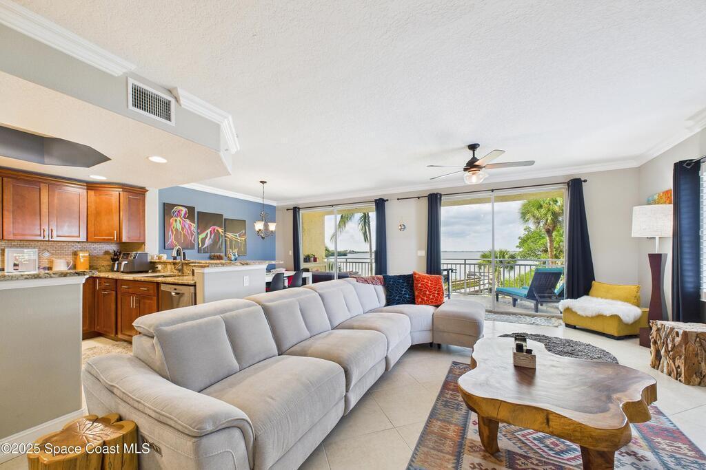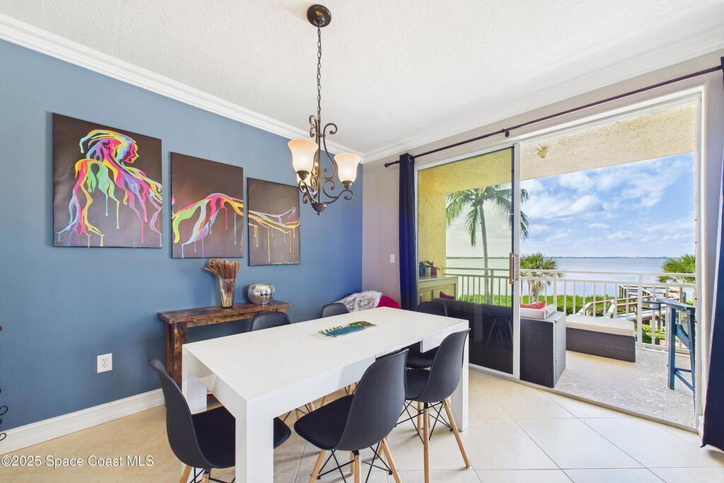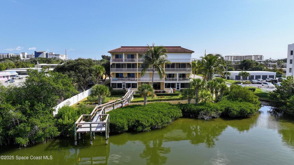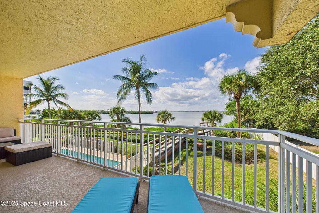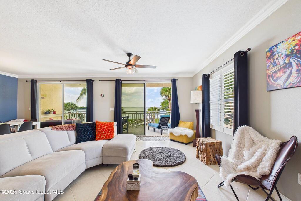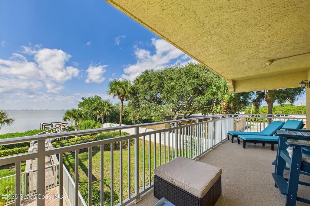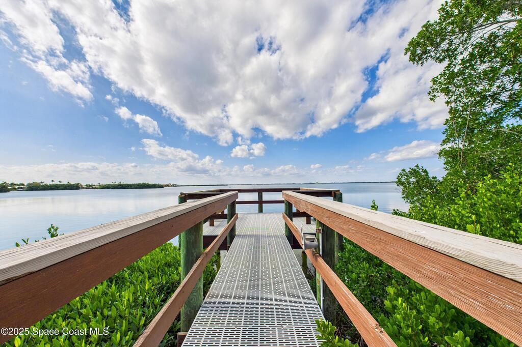 Spectacular DIRECT BANANA RIVERFRONT CORNER UNIT offering breathtaking views and a peaceful waterfront lifestyle in the boutique 11-unit community of Garden Bay. Rare opportunity to own an end unit in this highly desirable Cocoa Beach complex--just a short stroll to the ocean, restaurants, and shopping. Nearly 2,600 sq ft of luxury living with 4 bedrooms, 3.5 baths, and a private 2-car garage. High 8.5' ceilings, crown molding, travertine and wood flooring (no carpet), and impact windows with plantation shutters throughout. The gourmet kitchen boasts granite countertops, custom cabinetry, tile backsplash, and newer stainless appliances overlooking the water. Spacious owner's suite features double walk-in closets, private balcony, and spa-inspired bath with jetted tub and marble shower. Each guest bedroom has its own ensuite bath for privacy and comfort.