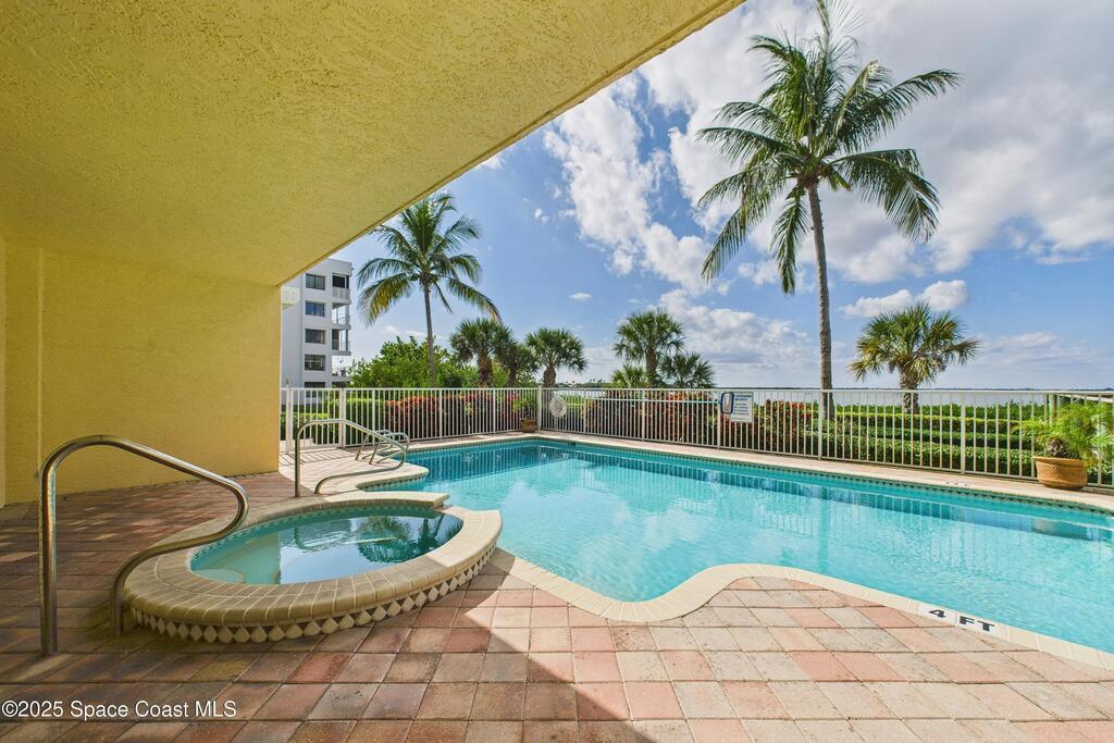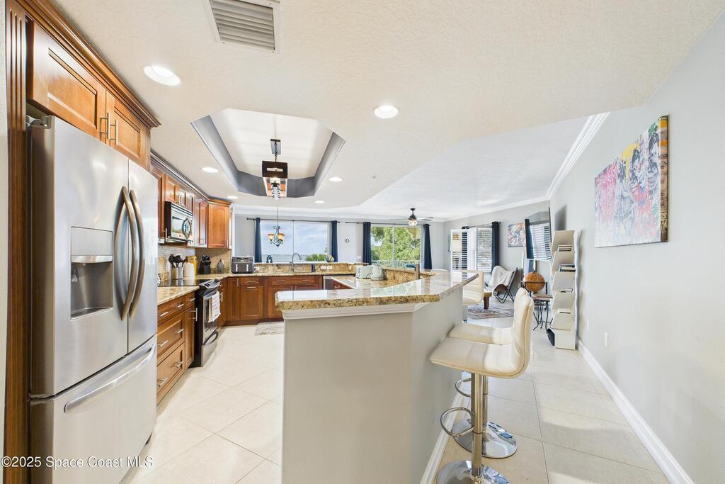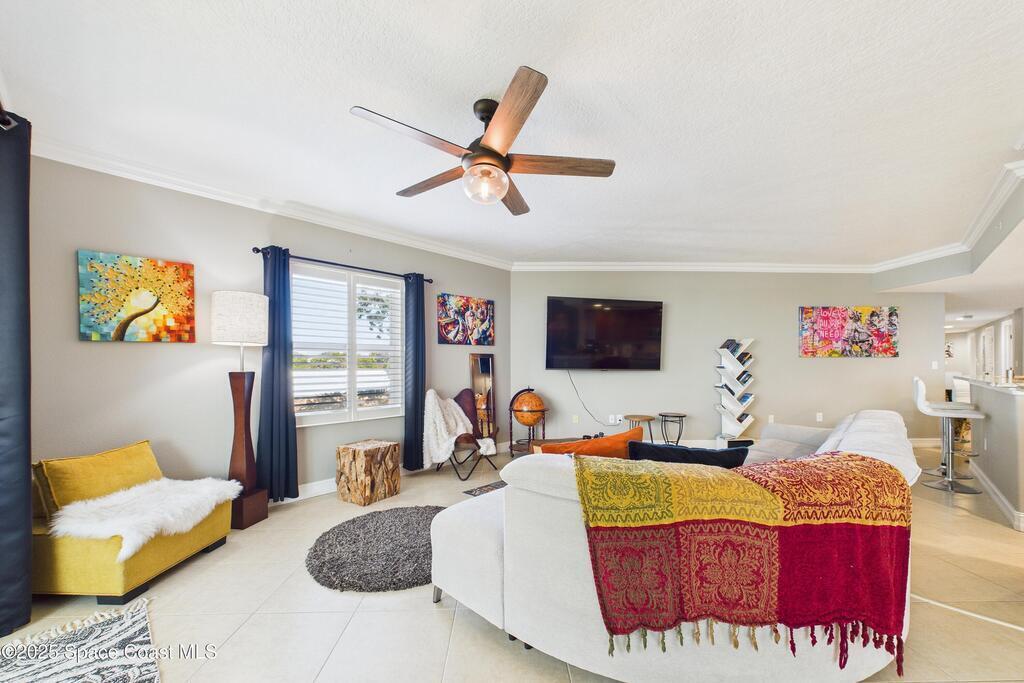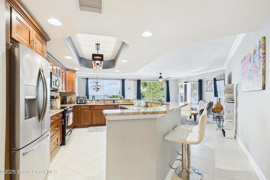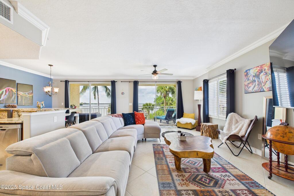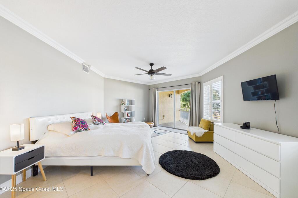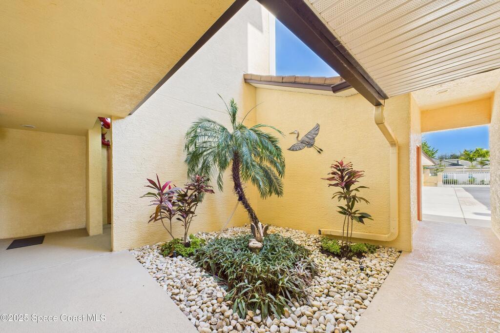 Spectacular DIRECT BANANA RIVERFRONT CORNER UNIT offering breathtaking views and a peaceful waterfront lifestyle in the boutique 11-unit community of Garden Bay. Rare opportunity to own an end unit in this highly desirable Cocoa Beach complex--just a short stroll to the ocean, restaurants, and shopping. Nearly 2,600 sq ft of luxury living with 4 bedrooms, 3.5 baths, and a private 2-car garage. High 8.5' ceilings, crown molding, travertine and wood flooring (no carpet), and impact windows with plantation shutters throughout. The gourmet kitchen boasts granite countertops, custom cabinetry, tile backsplash, and newer stainless appliances overlooking the water. Spacious owner's suite features double walk-in closets, private balcony, and spa-inspired bath with jetted tub and marble shower. Each guest bedroom has its own ensuite bath for privacy and comfort.