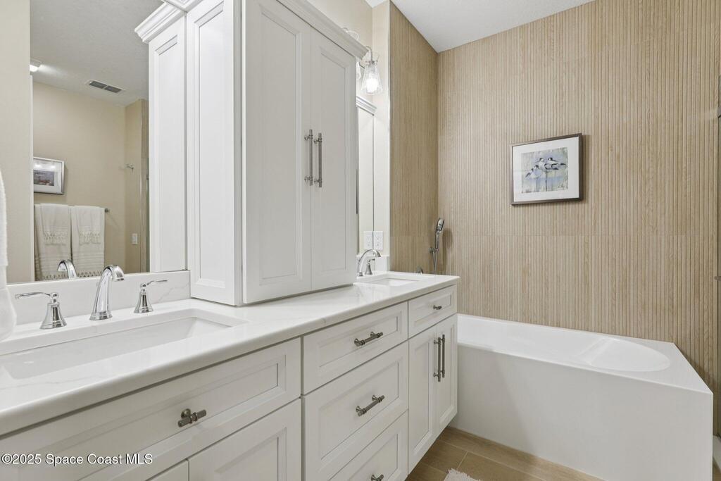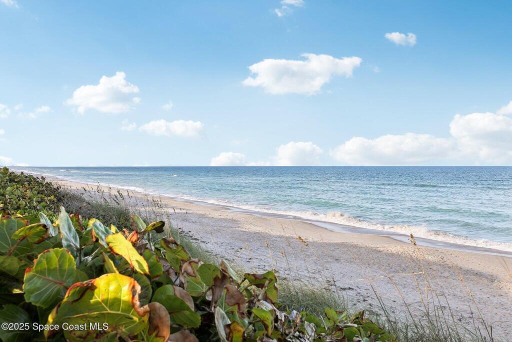 Amazing opportunity to own a beautifully renovated townhome in the prestigious barrier island,ocean to river, Aquarina Beach & Country Club. This fully updated home features new luxuryvinyl flooring throughout, solid-core doors, upgraded baseboards and window trim, a completelyremodeled kitchen with high-end BOSCH appliances including a 36'' Thor range and fullyrenovated bathrooms with upgraded showers and vanities. Additional improvements include a new AC (2025), new ceiling fans, a whole-house water filtration system, hurricane accordion shutters, and a 2021 roof maintained by the HOA. Enjoy the newly renovated enclosed Florida/sun room with built-in cabinetry, perfect for an office, along with peaceful views overlooking the golf course. The garage offers new epoxy flooring, sturdy storage racks, andextra storage pantries. This 2-bedroom, 2-bath split floor plan features vaulted ceilings, makingit truly move-in ready with